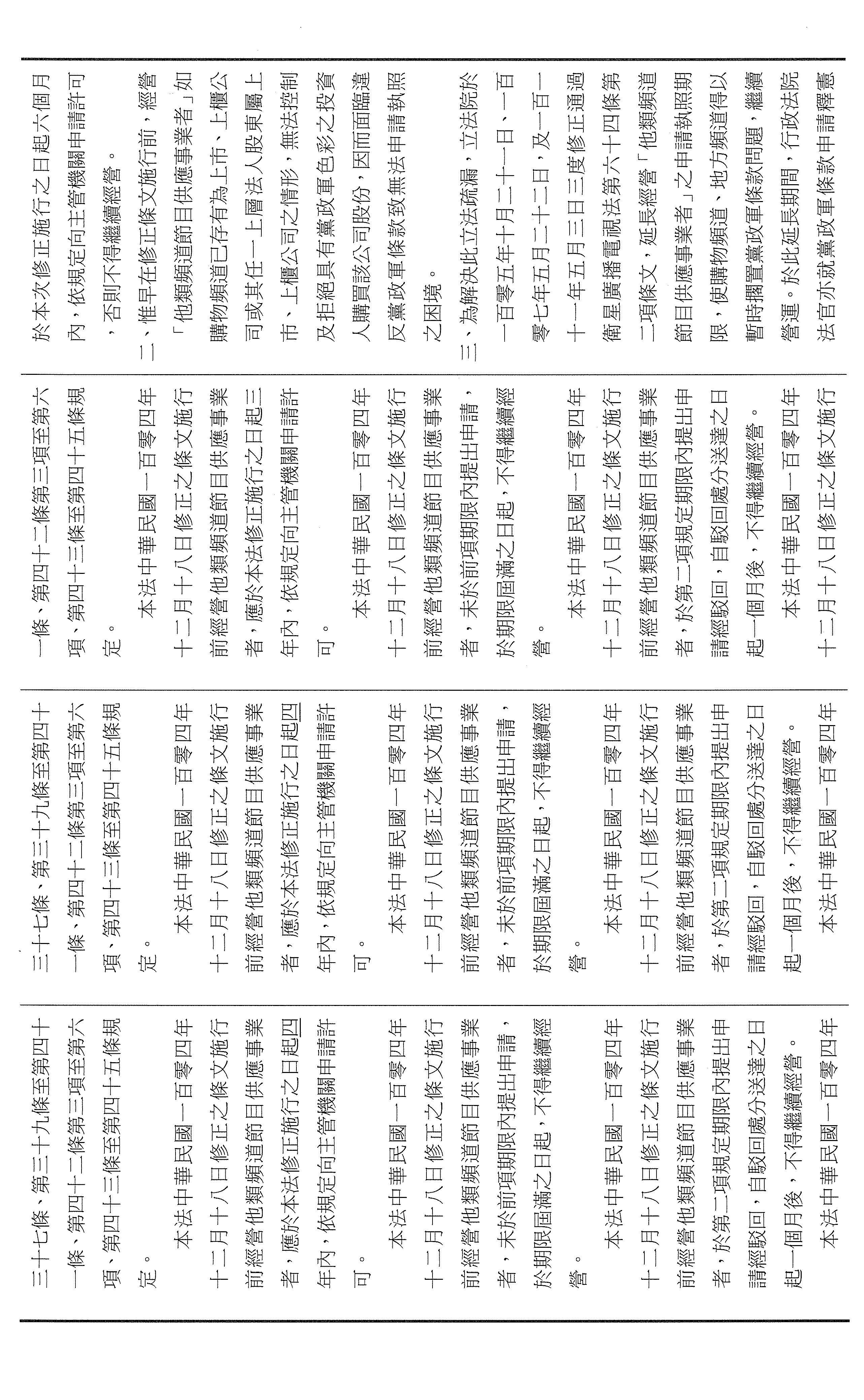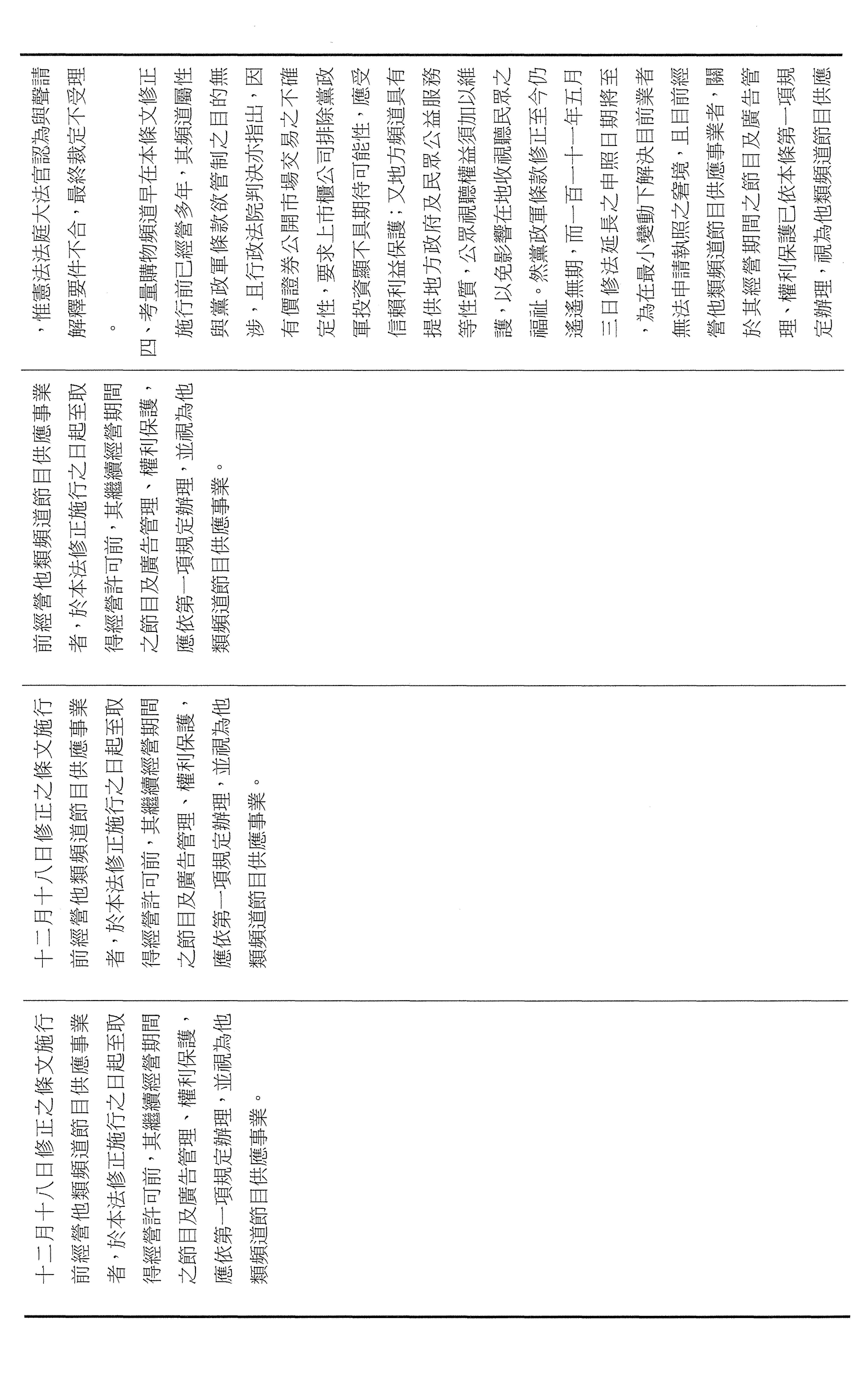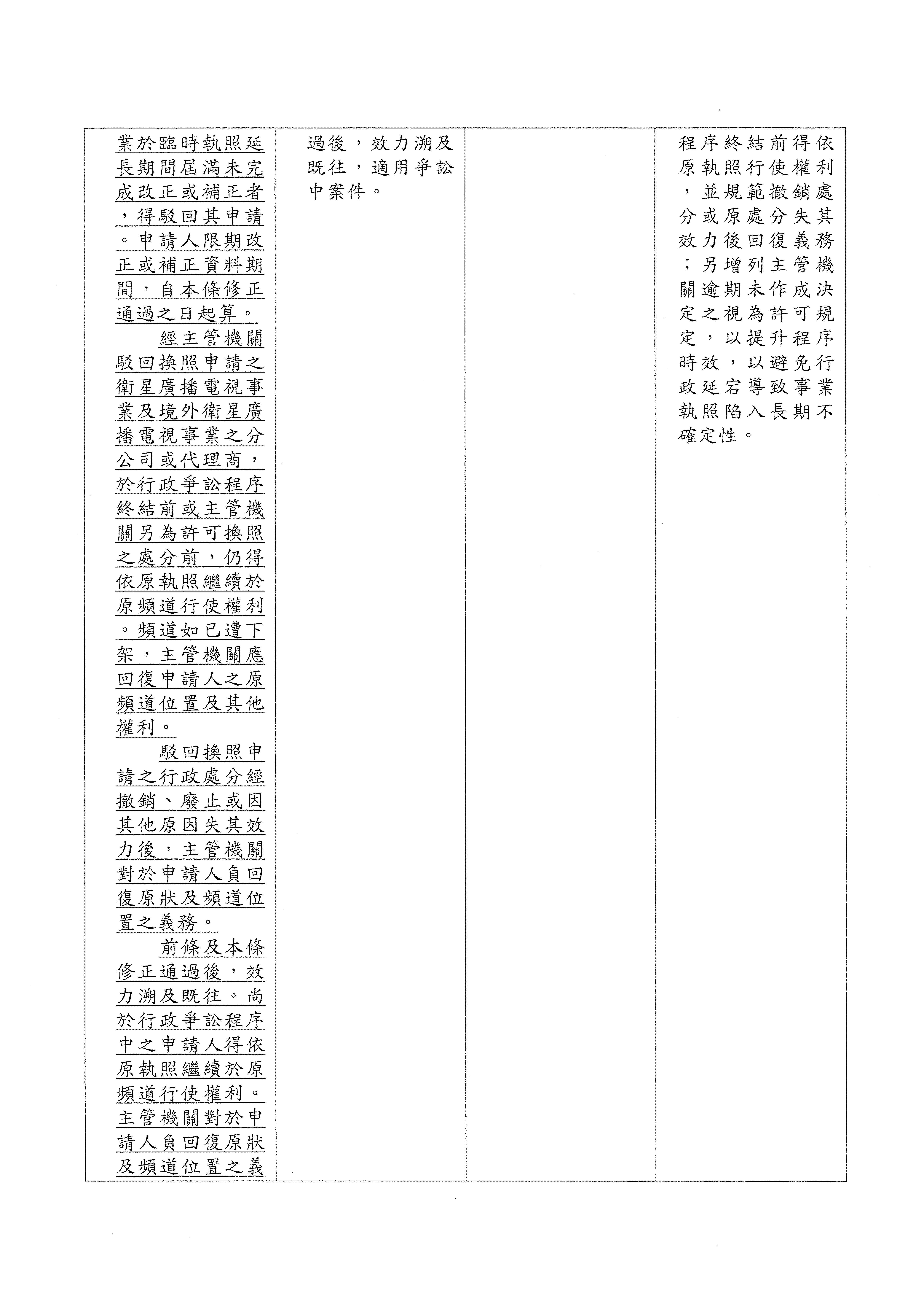 翁委員曉玲:我再重申,我們這次衛廣法的第一條已經通過了,捍衛新聞自由是很重要的一個精神,如果主管機關駁回或者不予換照,這對於電視臺業者來講,都是一個極大權益的損害,如果在法院對於這個換照訴訟還沒有做成最後確定判決之前,就任意的不讓這些業者繼續營運,我覺得這個是非常不公平的事情,因為從中天的案子裡面就可以看到,其實法院基本上對於到底該不該換照,以及NCC當時之所以不給中天換照,所據以處分的理由是它有很多什麼違法、被罰的處分,結果一一的也都被行政法院撤銷,所以能夠兼顧業者權益,讓它能夠繼續營運的最好方式,就是在法院訴訟沒有判決定讞之前,仍然要讓業者繼續營運,否則對於整個電視臺業者和這麼多的員工,以及對於新聞自由來說,都是一個很嚴重的侵害。