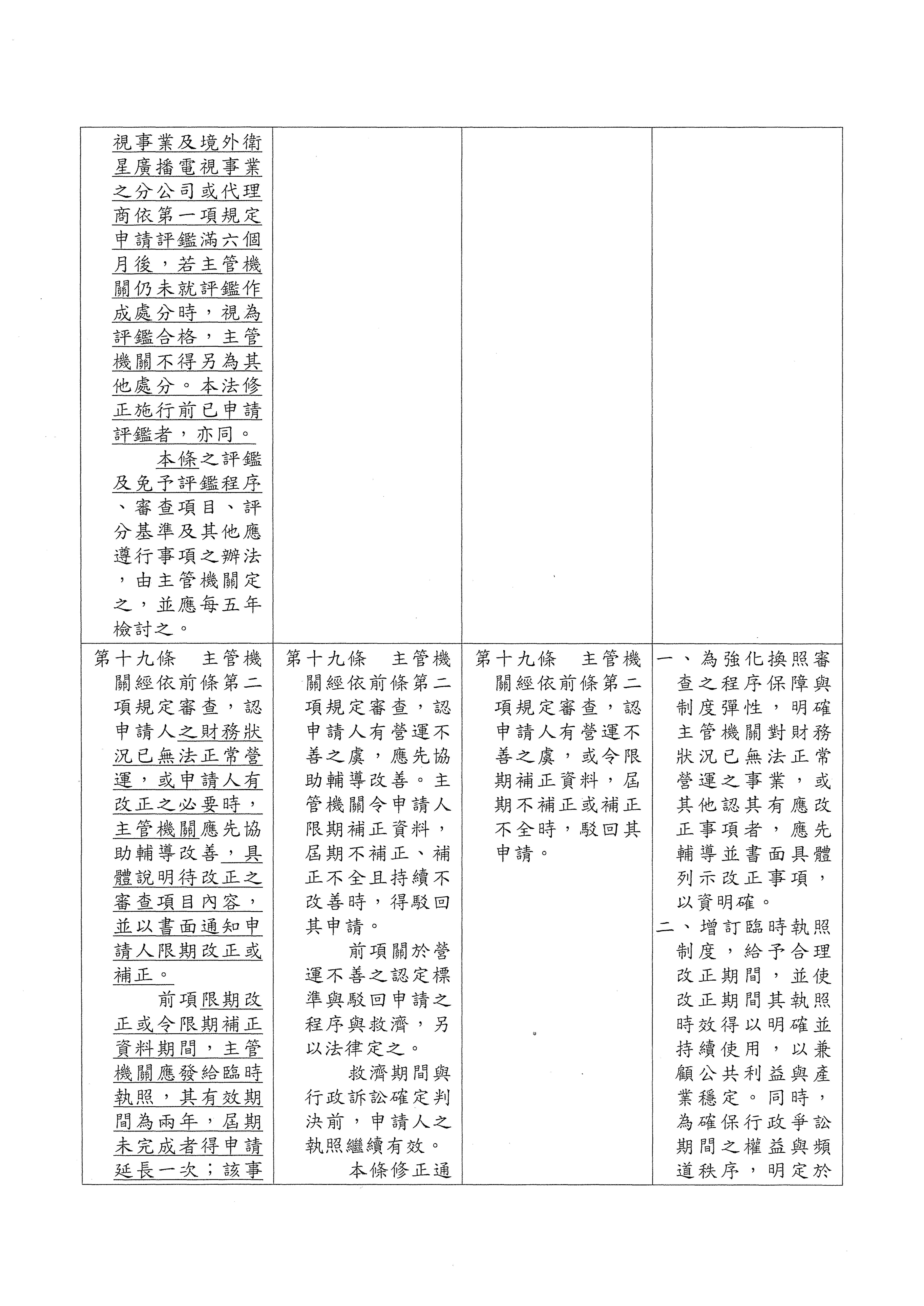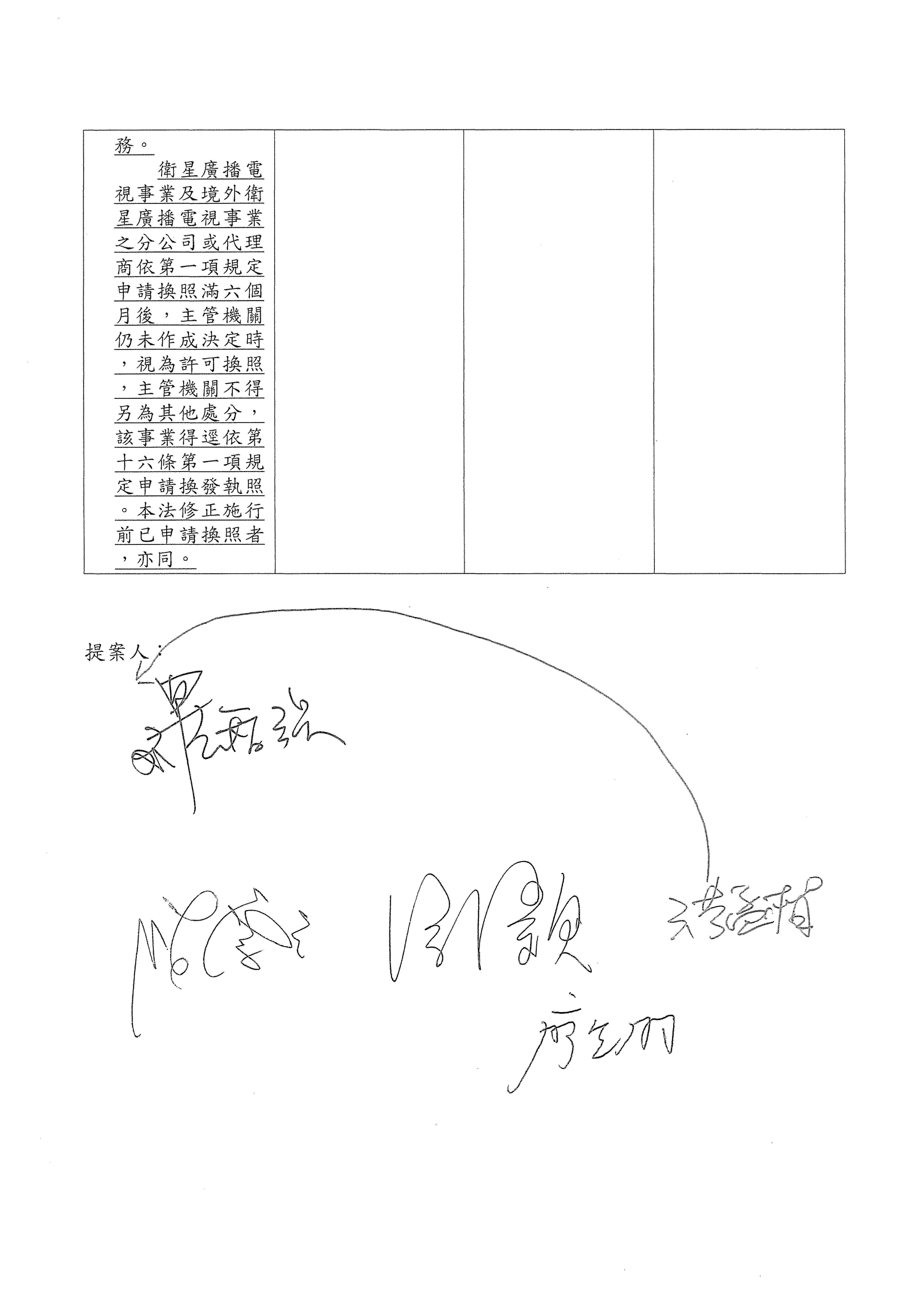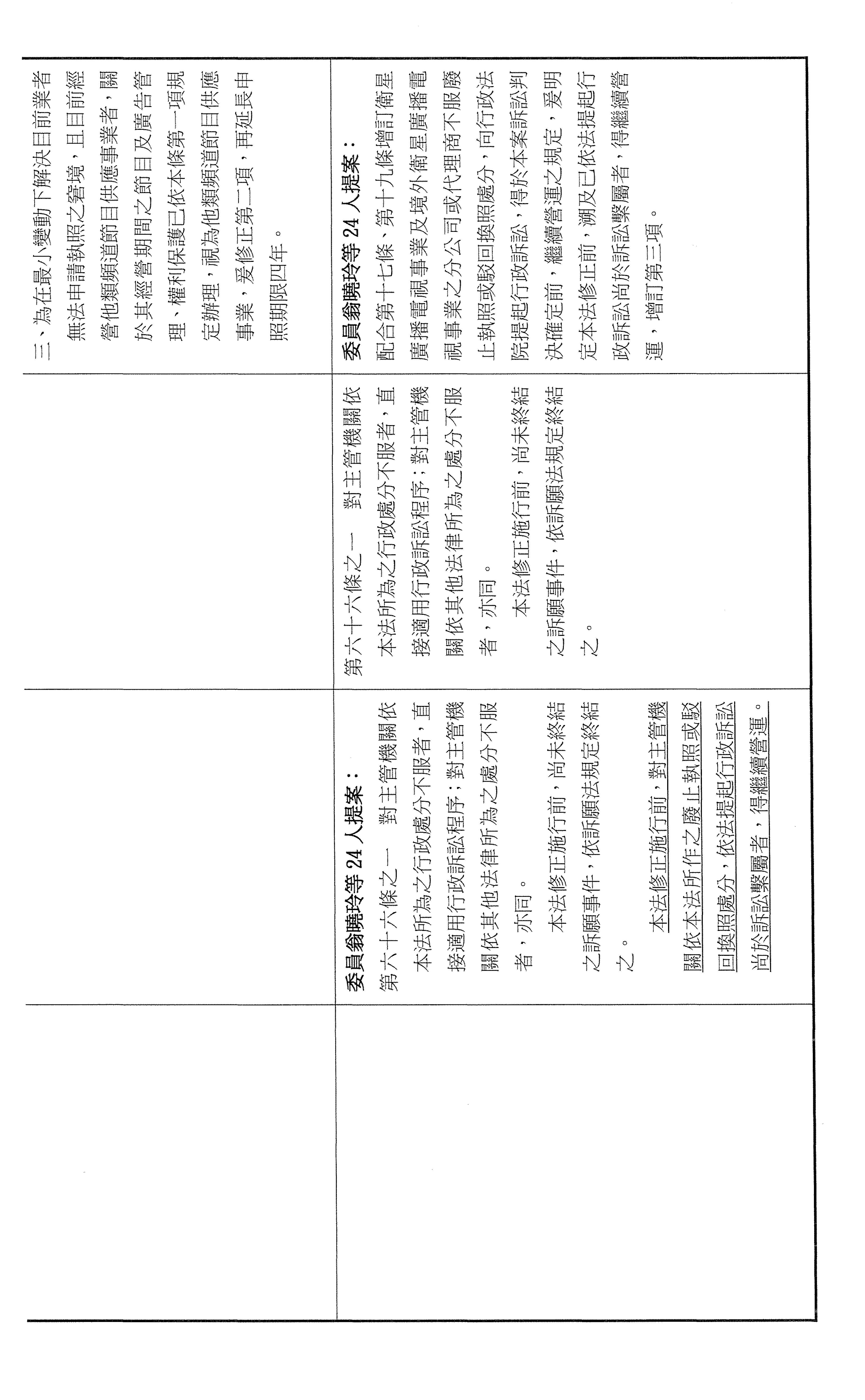 陳代理主任委員崇樹:第六十六條之一翁委員有提案新增第三項,就是衛廣法修正施行前,原來換照或者被廢止的,或被駁回換照處分的,在行政訴訟終結前尚處於訴訟繫屬者,得繼續營運,因為這個情狀跟第十七條、第十九條剛剛有保留的情況其實一樣,我們是建議也是一樣保留。
