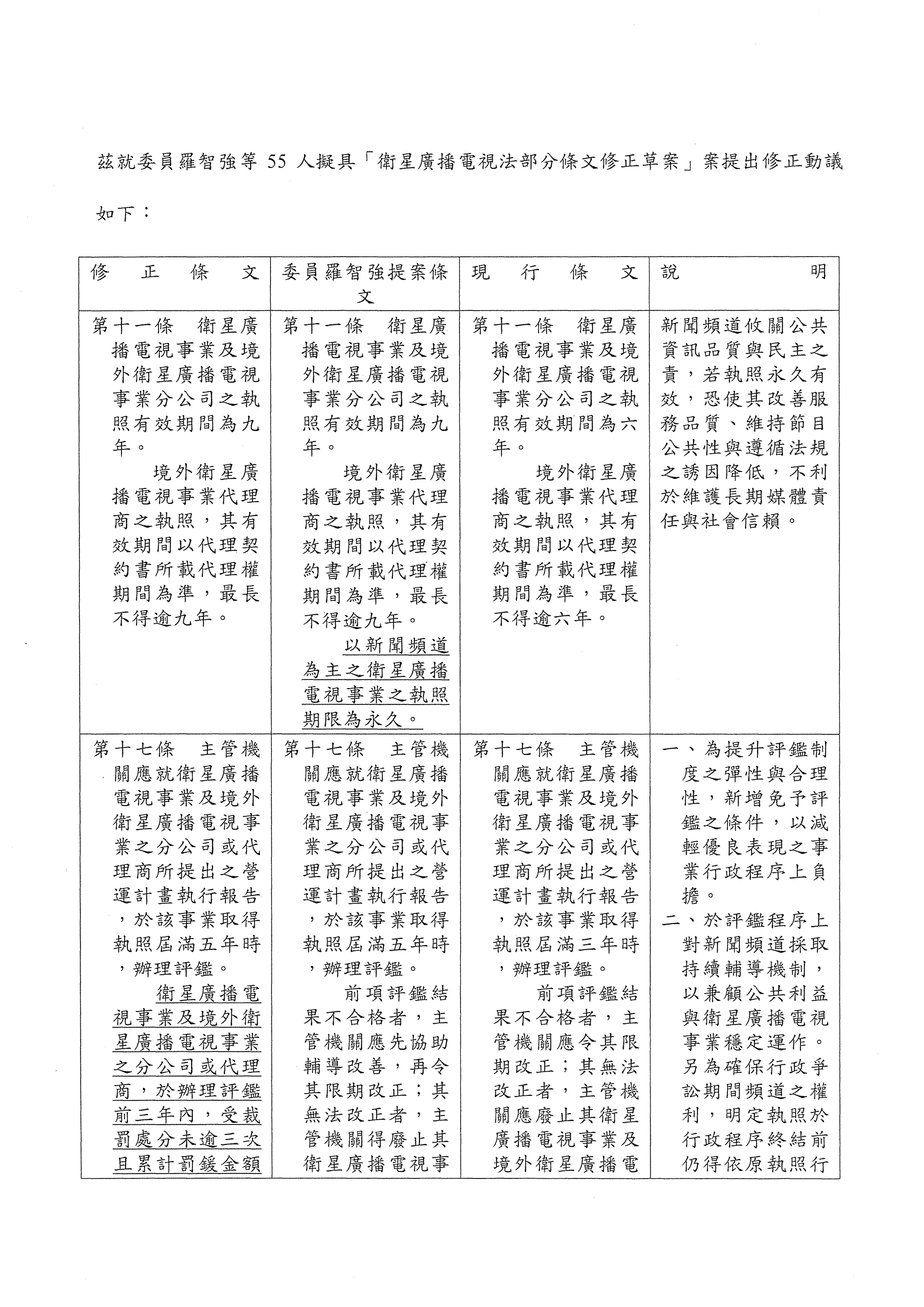 繼續審查一、委員羅智強等55人、二、台灣民眾黨黨團及三、委員翁曉玲等24人分別擬具「衛星廣播電視法部分條文修正草案」案、四、委員陳雪生等23人及五、委員傅崐萁等24人分別擬具「衛星廣播電視法第五條條文修正草案」案、六、委員葉元之等22人擬具「衛星廣播電視法第十一條條文修正草案」案、七、委員翁曉玲等16人擬具「衛星廣播電視法刪除第五十條條文草案」案、八、委員許智傑等27人及九、委員洪孟楷等22人分別擬具「衛星廣播電視法第六十四條條文修正草案」案。