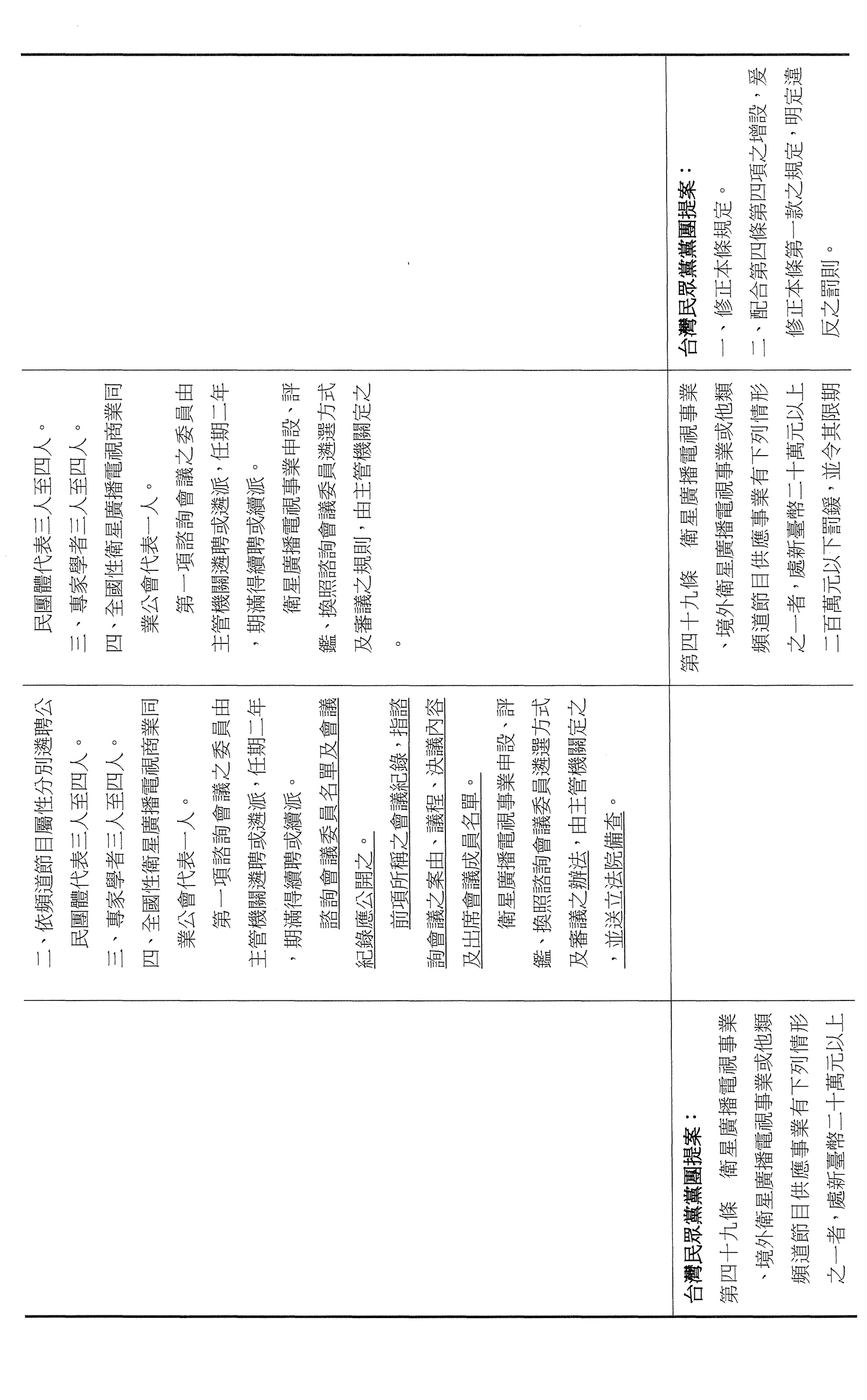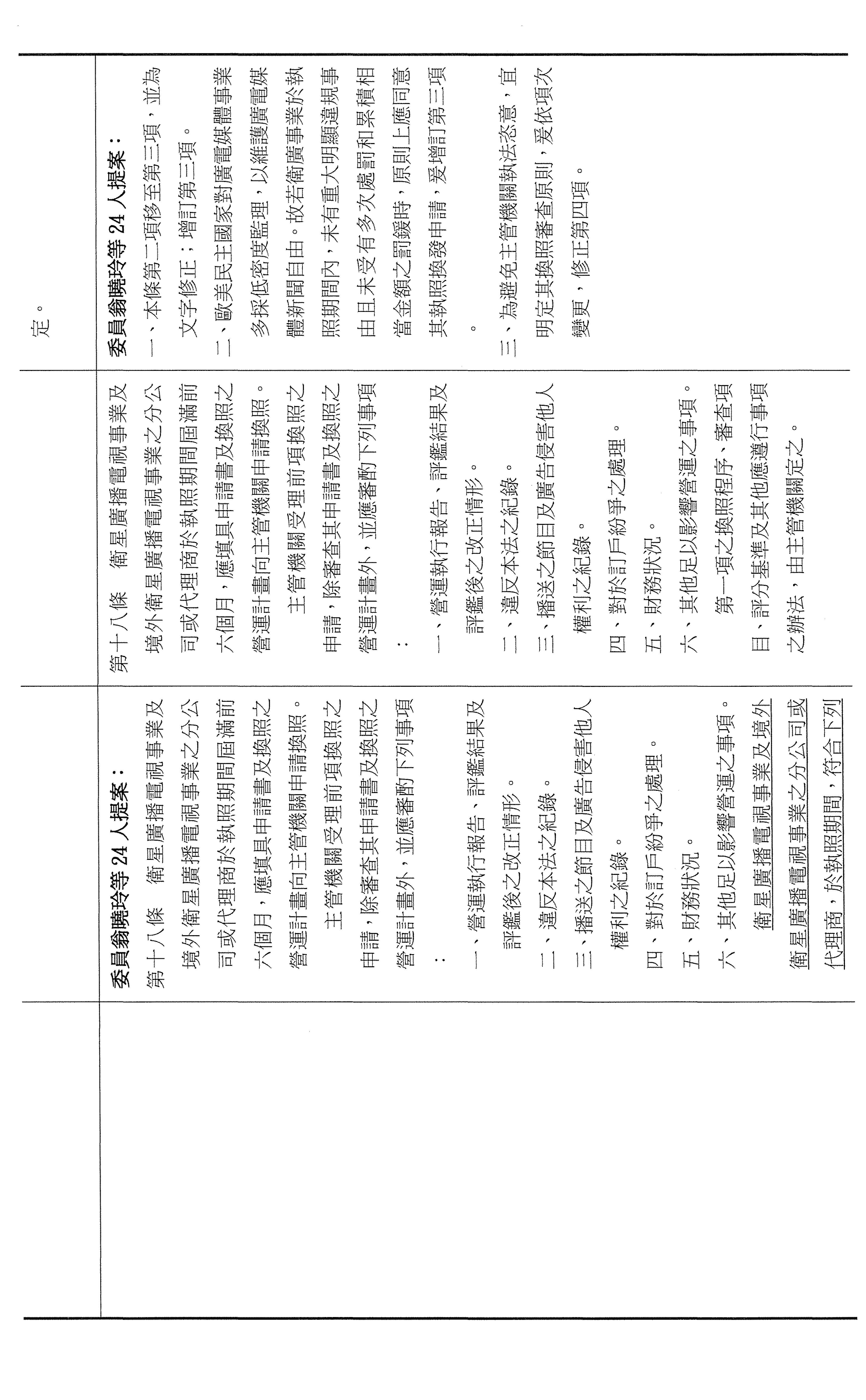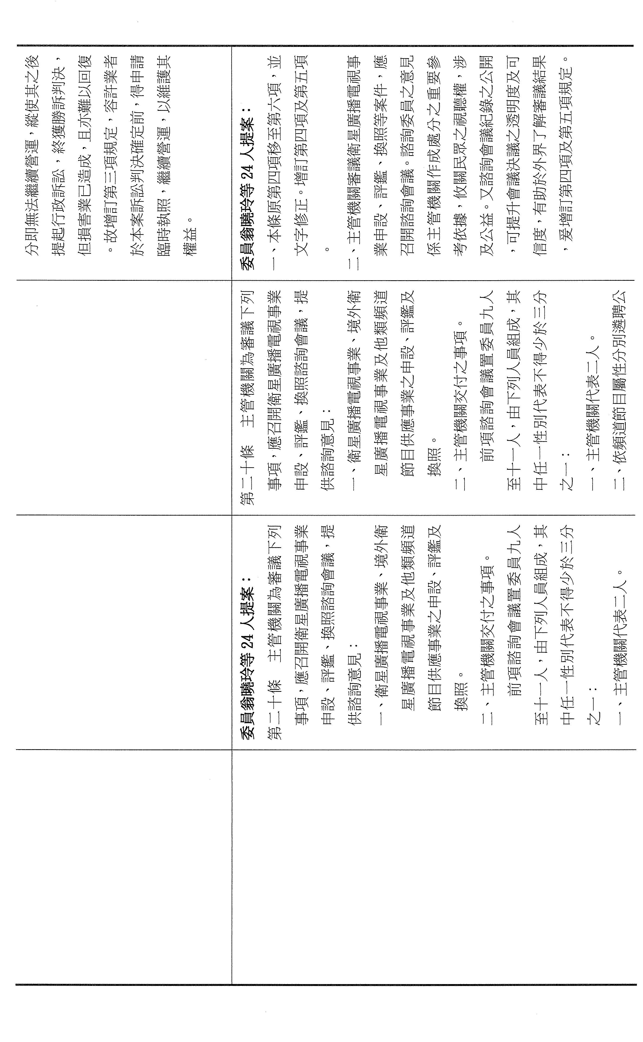 翁委員曉玲:過去大家對於諮詢會議是否有黑箱作業,以及諮詢委員為什麼會做出讓人民、讓新聞業者無法接受的決議?就這部分來講,本席認為還是有公開的必要。更何況諮詢會議乃法定明文列在衛廣法裡的組織,基本上如同訴願委員會、法規委員會等等,行政機關都會公布訴願委員的名字,法規委員會也會公布名字,所以為什麼諮詢會議委員的名單就不可以公布?會議紀錄也不公開?我認為這違反正當法律程序以及行政資訊公開的相關要件。我認為應該要修正並公開。如果諮詢會議讓人覺得擔任委員、參與會議審議是一個榮譽職務,我想沒有人會反對公開名字;如果諮詢會議搞到最後大家都不相信,甚至認為這是一個被政治力所操控的會議的話,未來當然也不會有人想擔任委員。總之,我認為這條很重要,一定要進行修正。