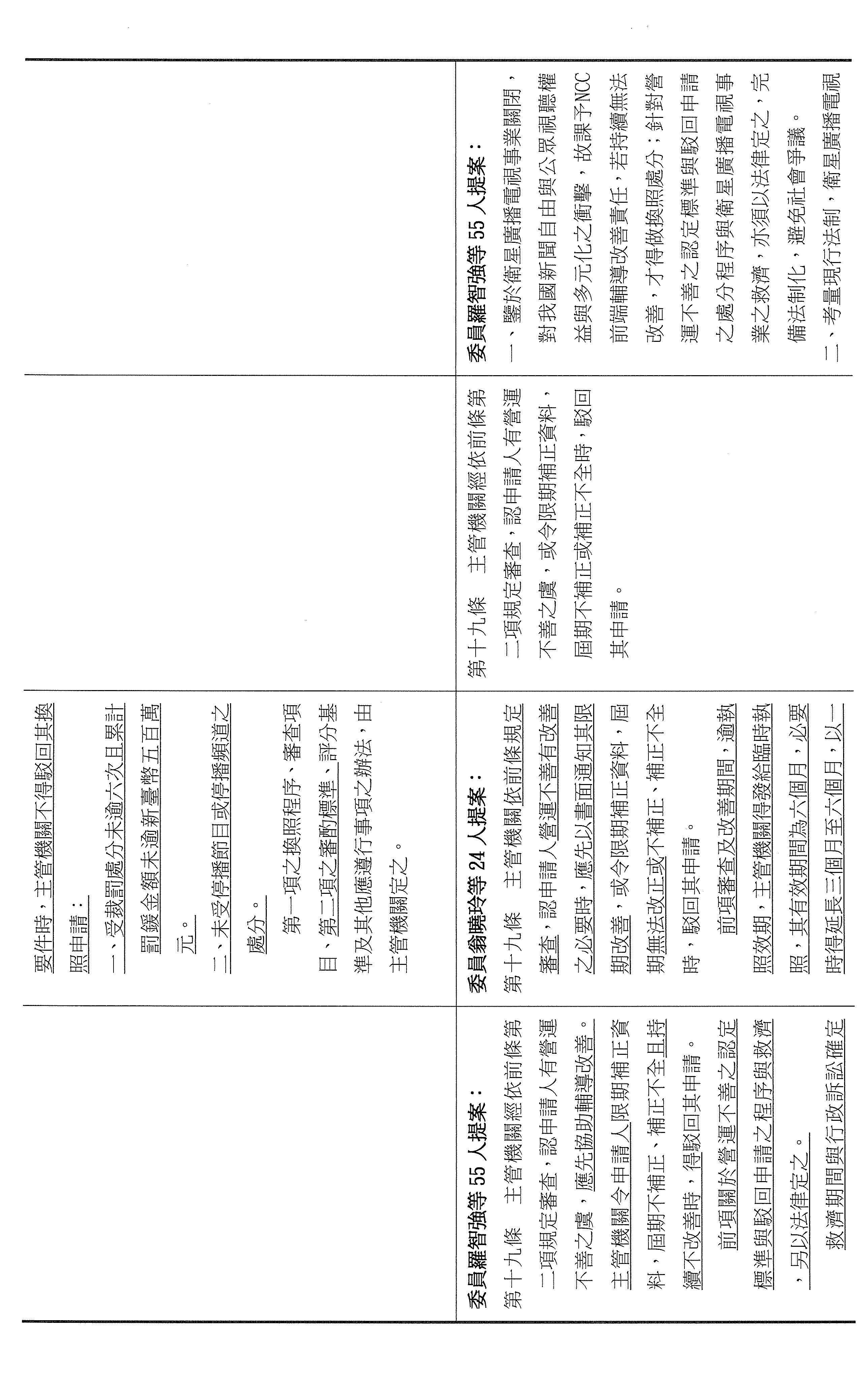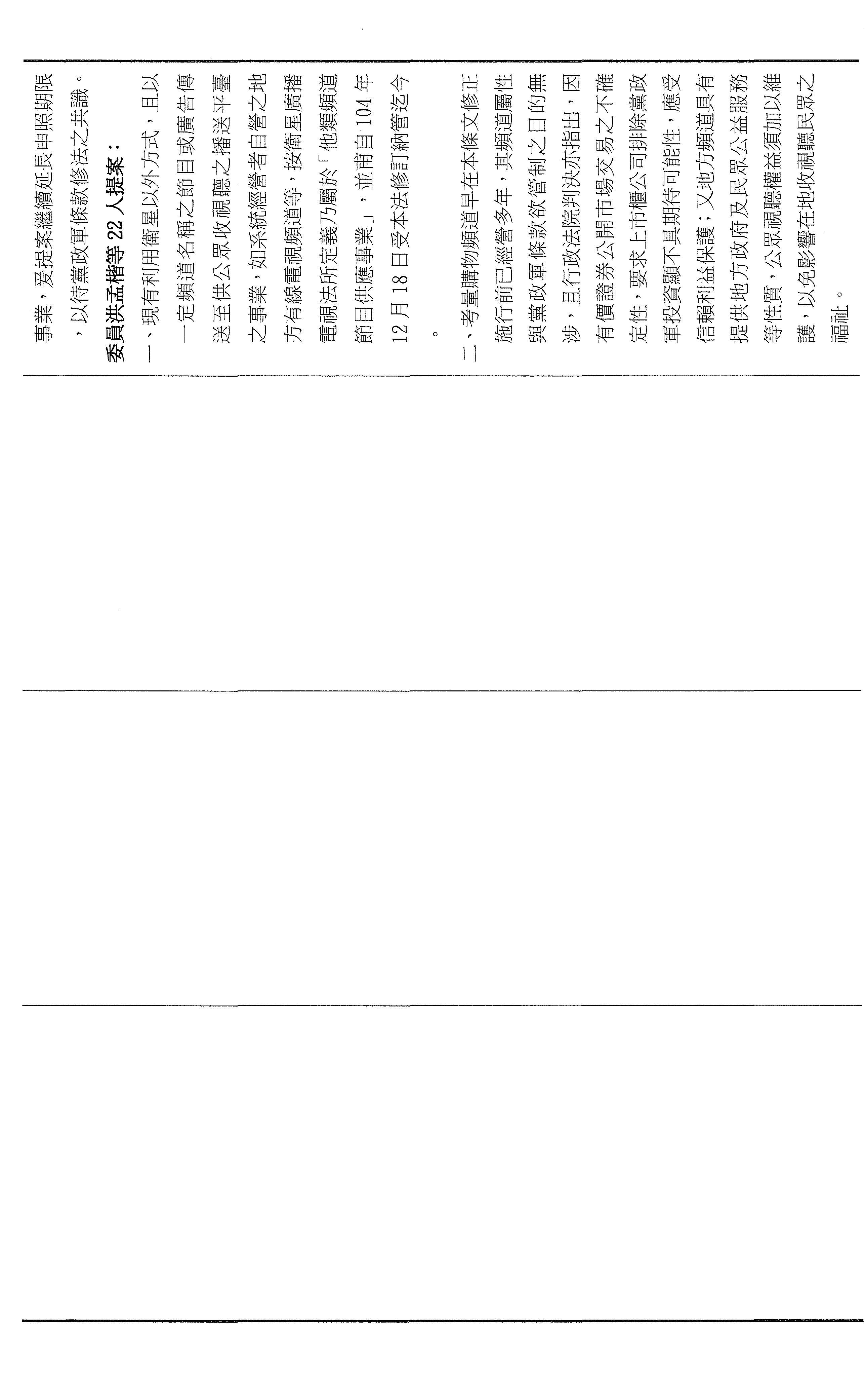翁委員曉玲:本席這次不是為了特定媒體修法,而是從中天這個案例可以看到NCC是多麼專斷,在過去做出不予換照處分的過程當中,有非常多行政程序不合法,或者是它所做成的實質理由基本上有非常大的爭議,所以如果今天這個條文通過,並不只是為了某一家電視臺,而是我相信很多電視臺業者基本上都會支持這樣的修正條文。