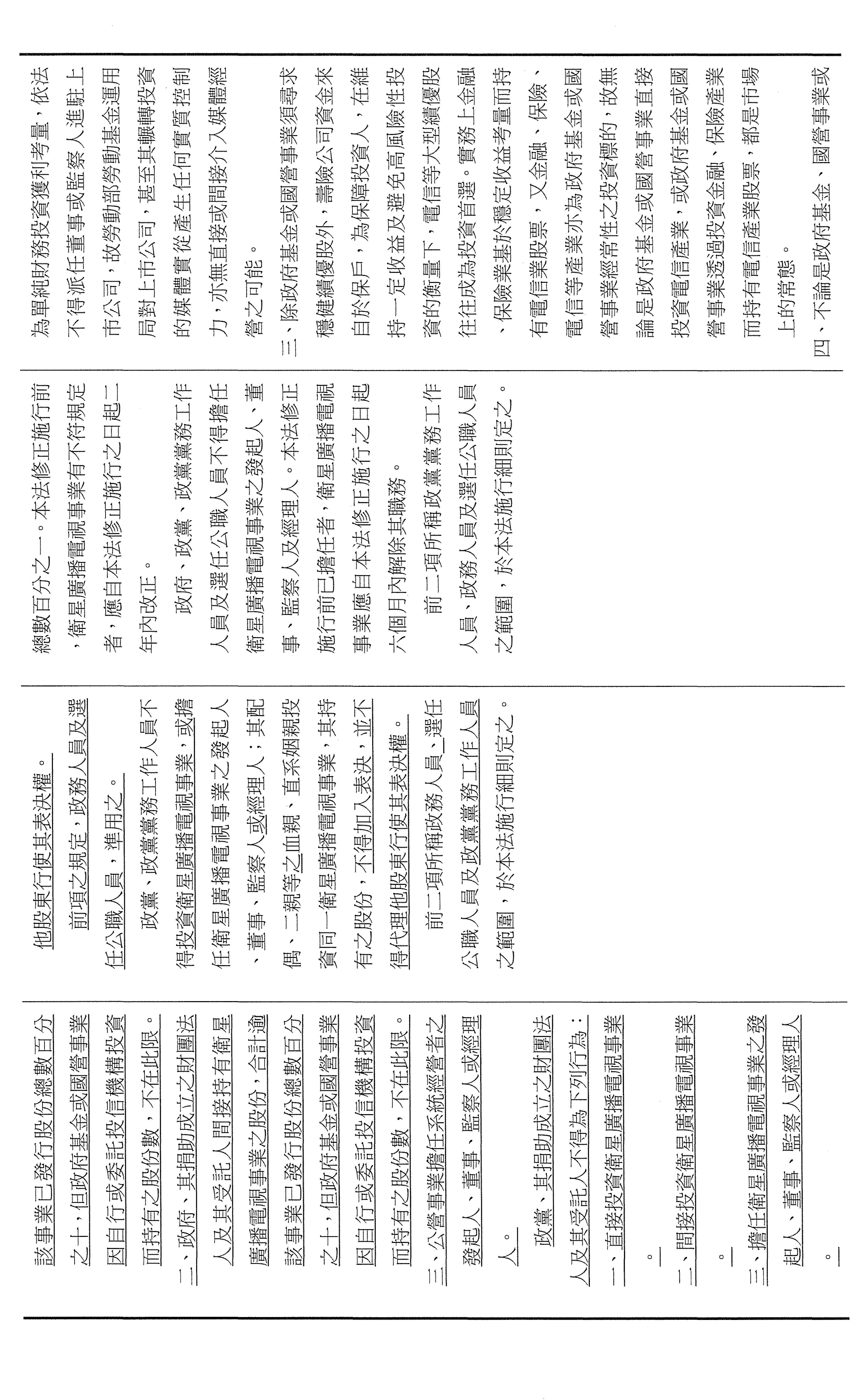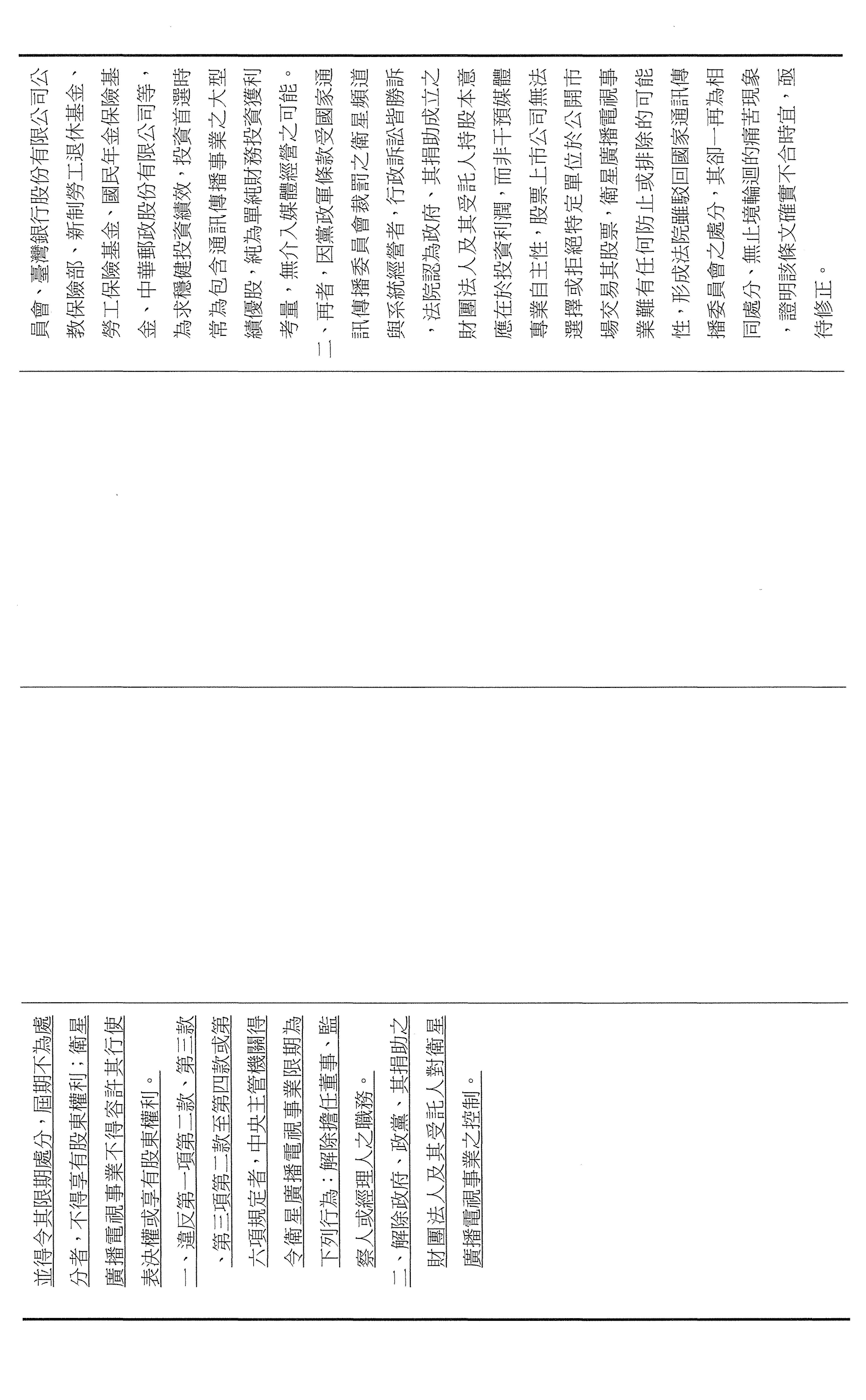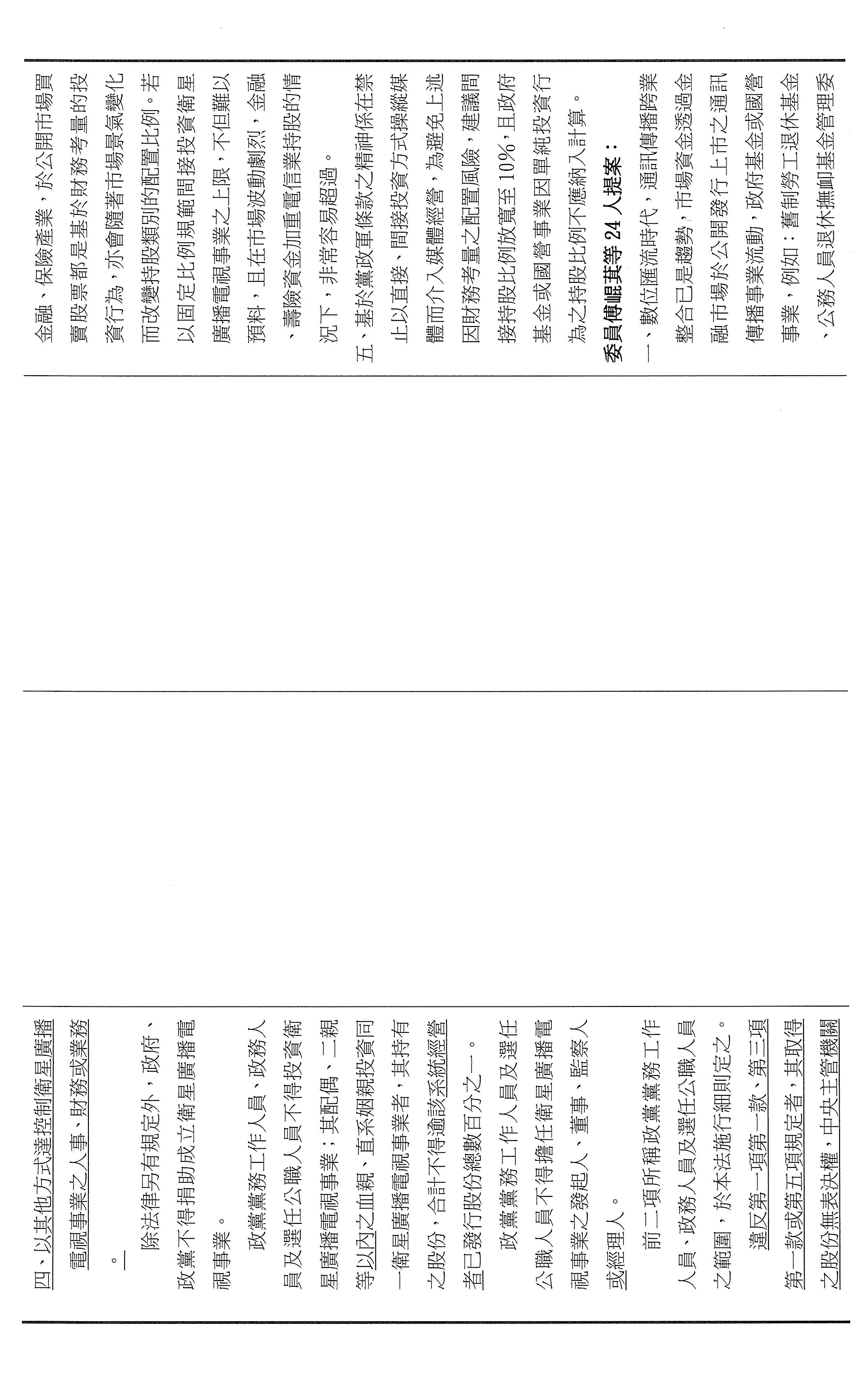 主席:確實啊,翁委員講的確實是一個市場上的狀況,就是被投資者它沒有辦法拒絕任何投資,不然就可能要請金管會要求哪一些人不能投資它,但是目前是沒有這樣的狀況,可是如果說當它不知情被投資了,然後結果因為觸犯黨政軍條款,反而是媒體要承受處罰,這也很奇怪,這一點確實是相對來講很奇怪,而且如果說過去有這些判決,也是到最後又撤銷。