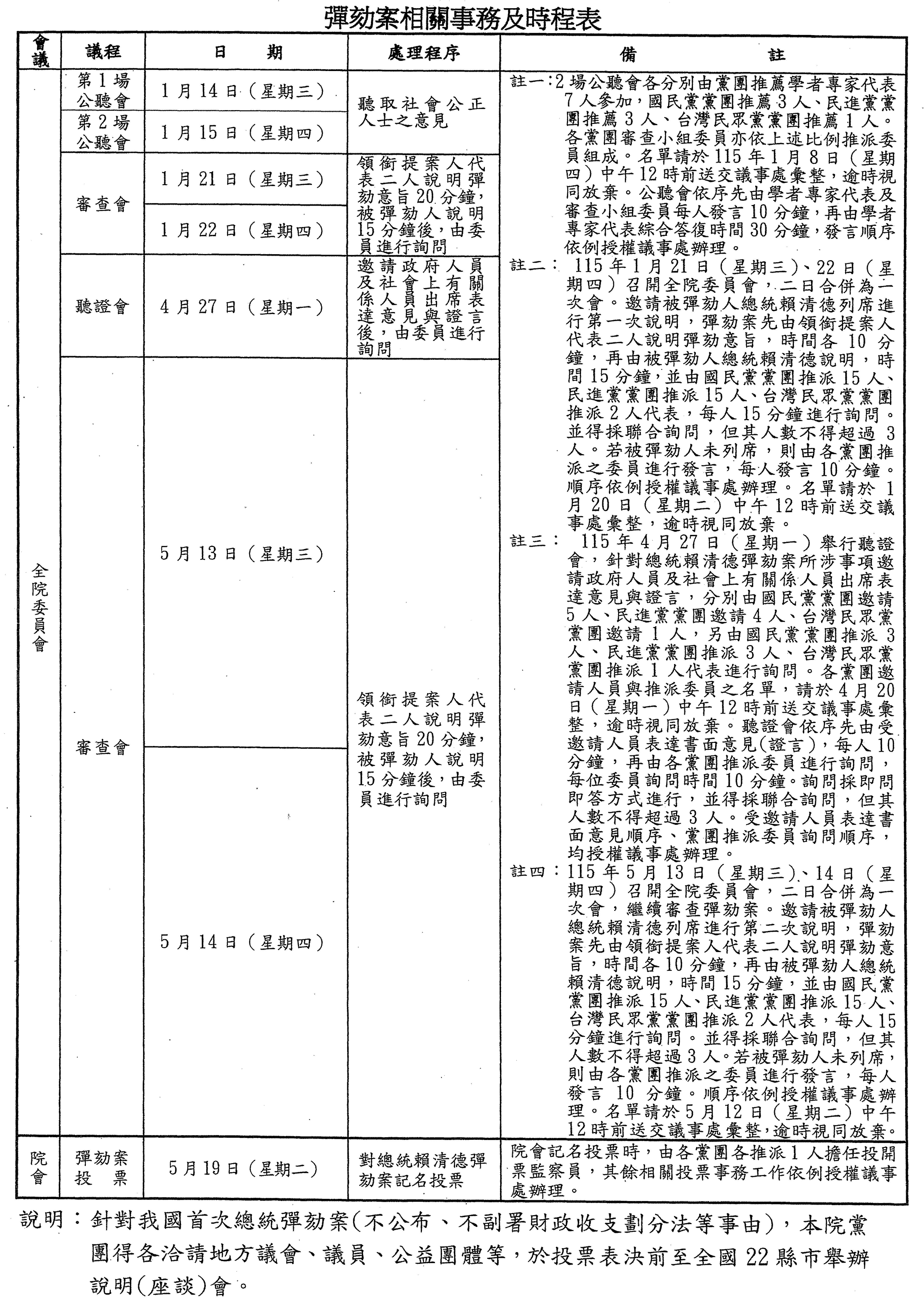 (一)115年1月14日(星期三)、15日(星期四)舉行總統賴清德彈劾案公聽會2場,各分別由黨團推薦學者專家代表7人參加,國民黨黨團推薦3人、民進黨黨團推薦3人、台灣民眾黨黨團推薦1人。各黨團審查小組委員亦依上述比例推派委員組成。名單請於115年1月8日(星期四)中午12時前送交議事處彙整,逾時視同放棄。