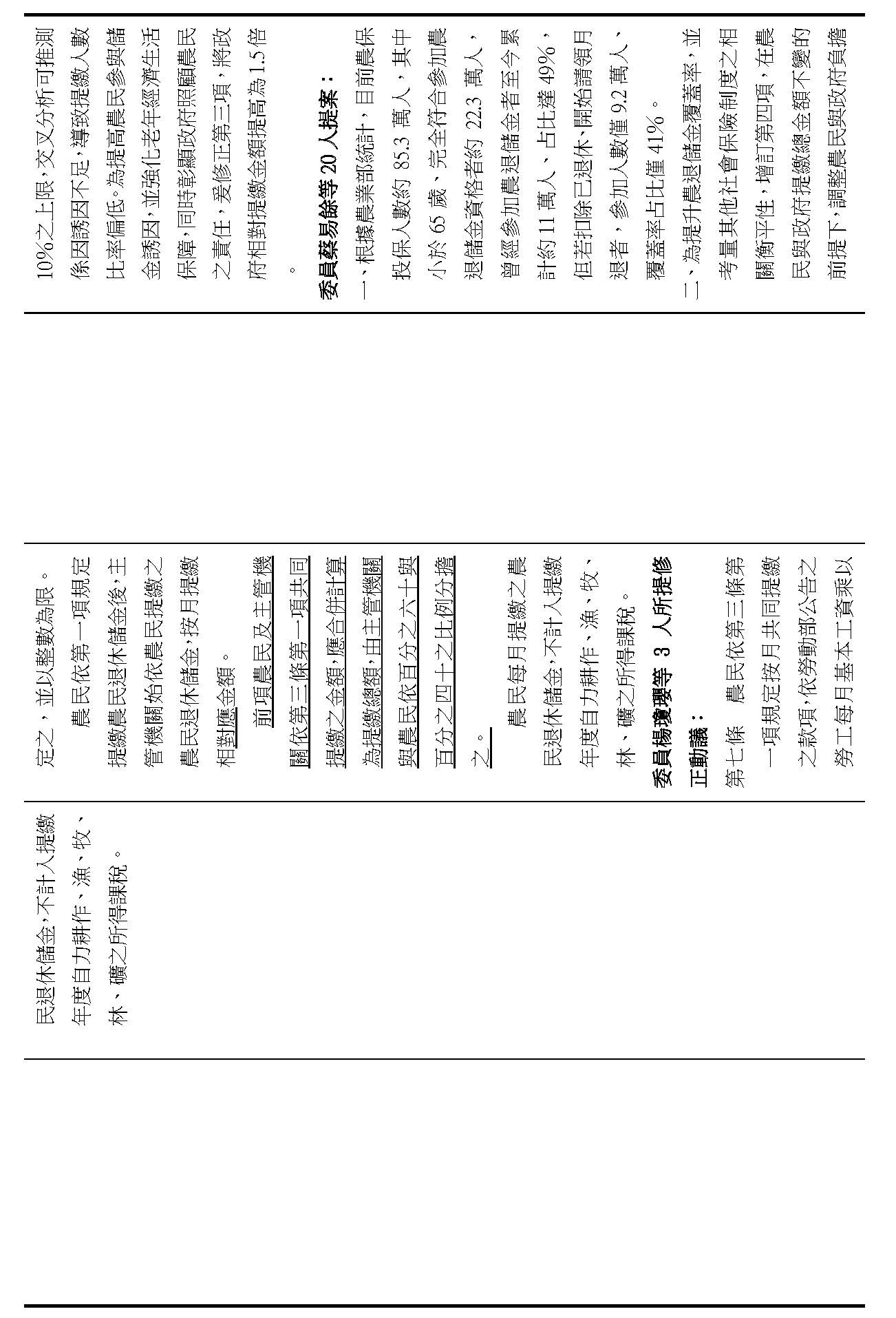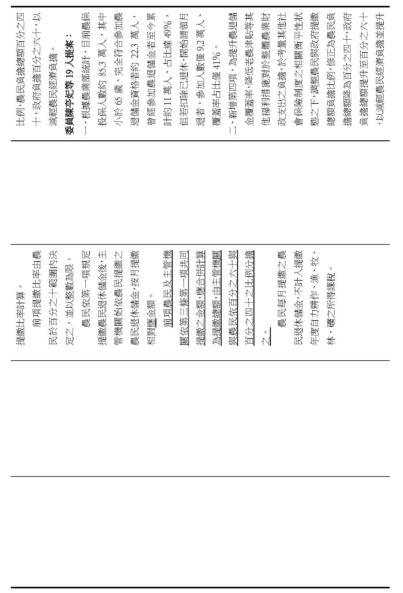 (十九)本院委員陳俊宇等20人擬具「農民退休儲金條例第二條及第七條條文修正草案」,請審議案。