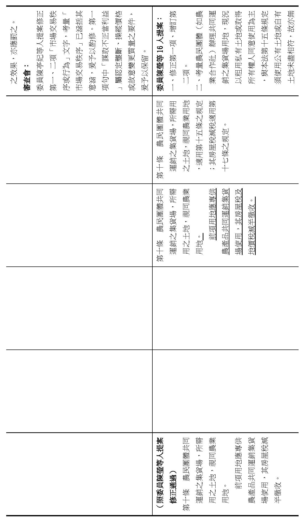 (2)第十條條文修正草案:委員陳瑩、莊瑞雄等16人提案修正刪除第一項農民團體共同運銷之集貨場土地須適用第十五條規定之限制,並新增第二項維持房屋稅及地價稅減半徵收之優惠,及明定土地應專供農民團體共同運銷集貨場使用。