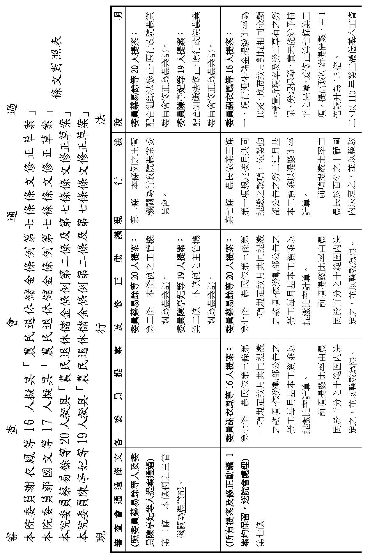 主旨:院會交付本會審查本院委員謝衣鳯等16人擬具「農民退休儲金條例第七條條文修正草案」、委員郭國文等17人擬具「農民退休儲金條例第七條條文修正草案」、委員蔡易餘等20人擬具「農民退休儲金條例第二條及第七條條文修正草案」及委員陳亭妃等19人擬具「農民退休儲金條例第二條及第七條條文修正草案」等4案,業經併案審查完竣,並決議須交由黨團協商,復請提報院會討論。