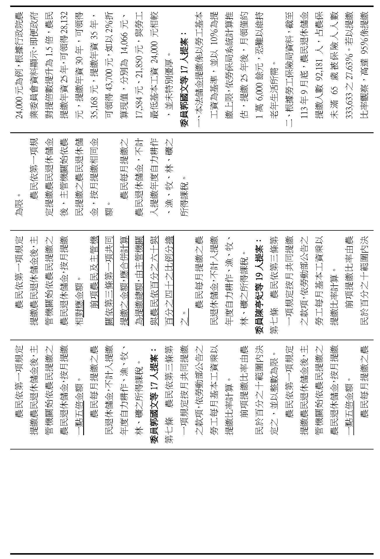 (二十四)本院委員鄭天財Sra Kacaw等17人擬具「農民退休儲金條例第九條及第十四條條文修正草案」,請審議案。