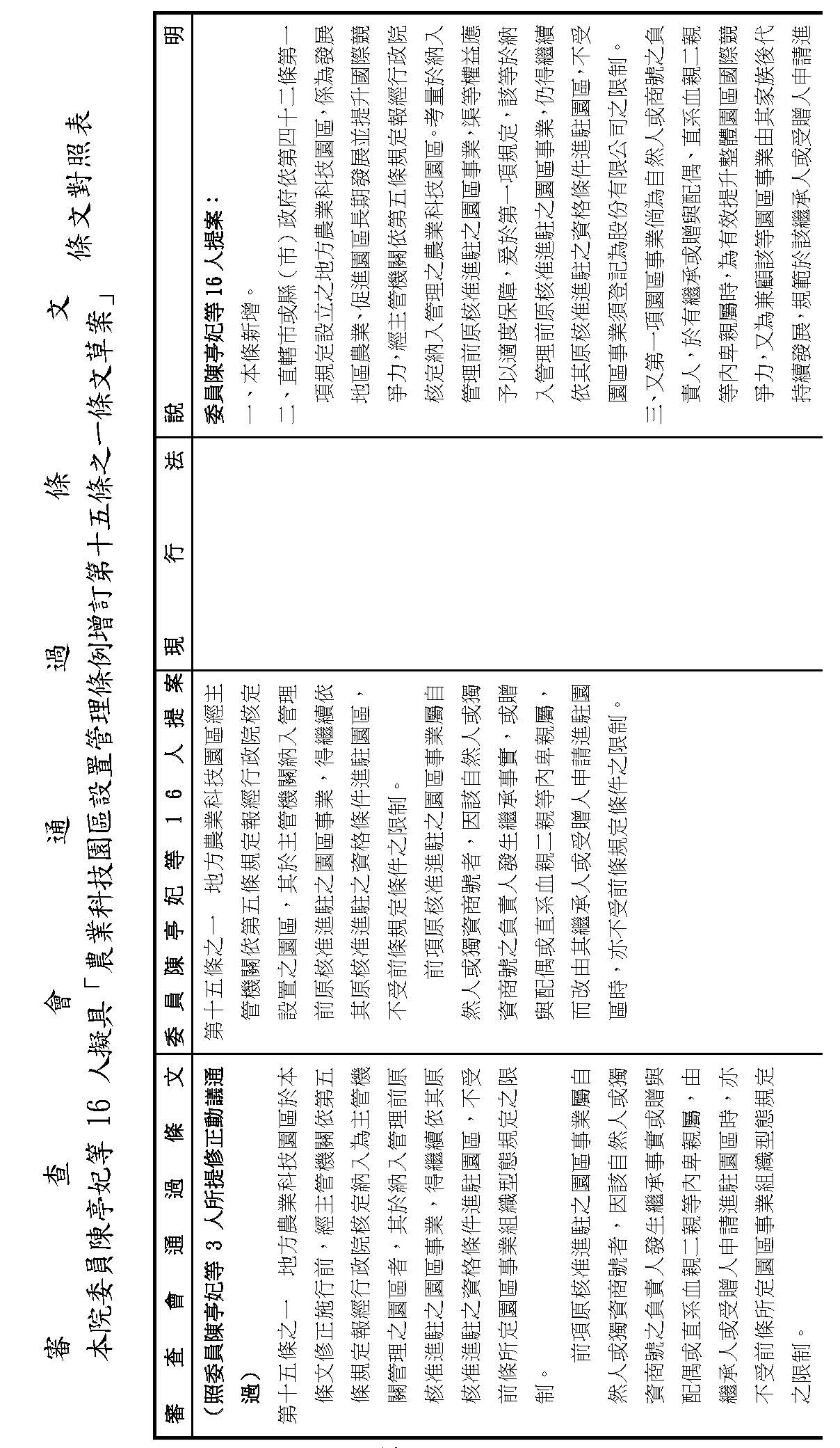 審查本院委員陳亭妃等16人擬具「農業科技園區設置管理條例增訂第十五條之一條文草案」審查報告