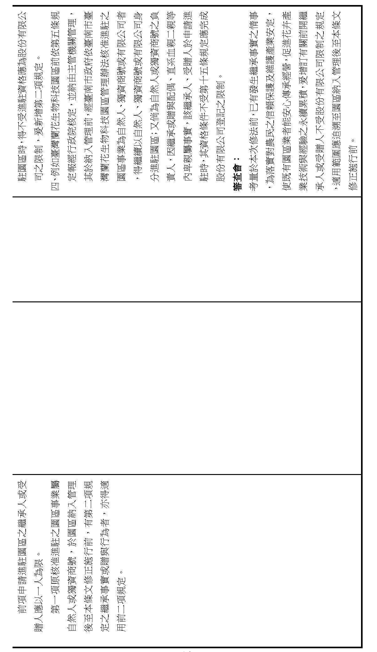 花卉創新園區(原臺灣蘭花生物科技園區)於112年1月1日納入本部管理,目前進駐業者共68家,其中自然人及獨資商號達40家,占比近6成,多為長期在地經營之小型蘭園。依農業科技園區設置管理條例(下稱設管條例)第十五條規定,園區事業應為依公司法組織之股份有限公司(略以)。為顧及既有業者信賴保護,本部業增訂設管條例施行細則第十六條之一,明定納管前經臺南市政府核准進駐者,得續依原核准資格條件進駐。為維護自然人或獨資商號進駐業者渠等權益,使其繼承人或受贈人不受上開園區事業組織型態規定限制,爰擬增訂設管條例第十五條之一,該修正草案業於113年10月15日函陳行政院並送立法院審議中。