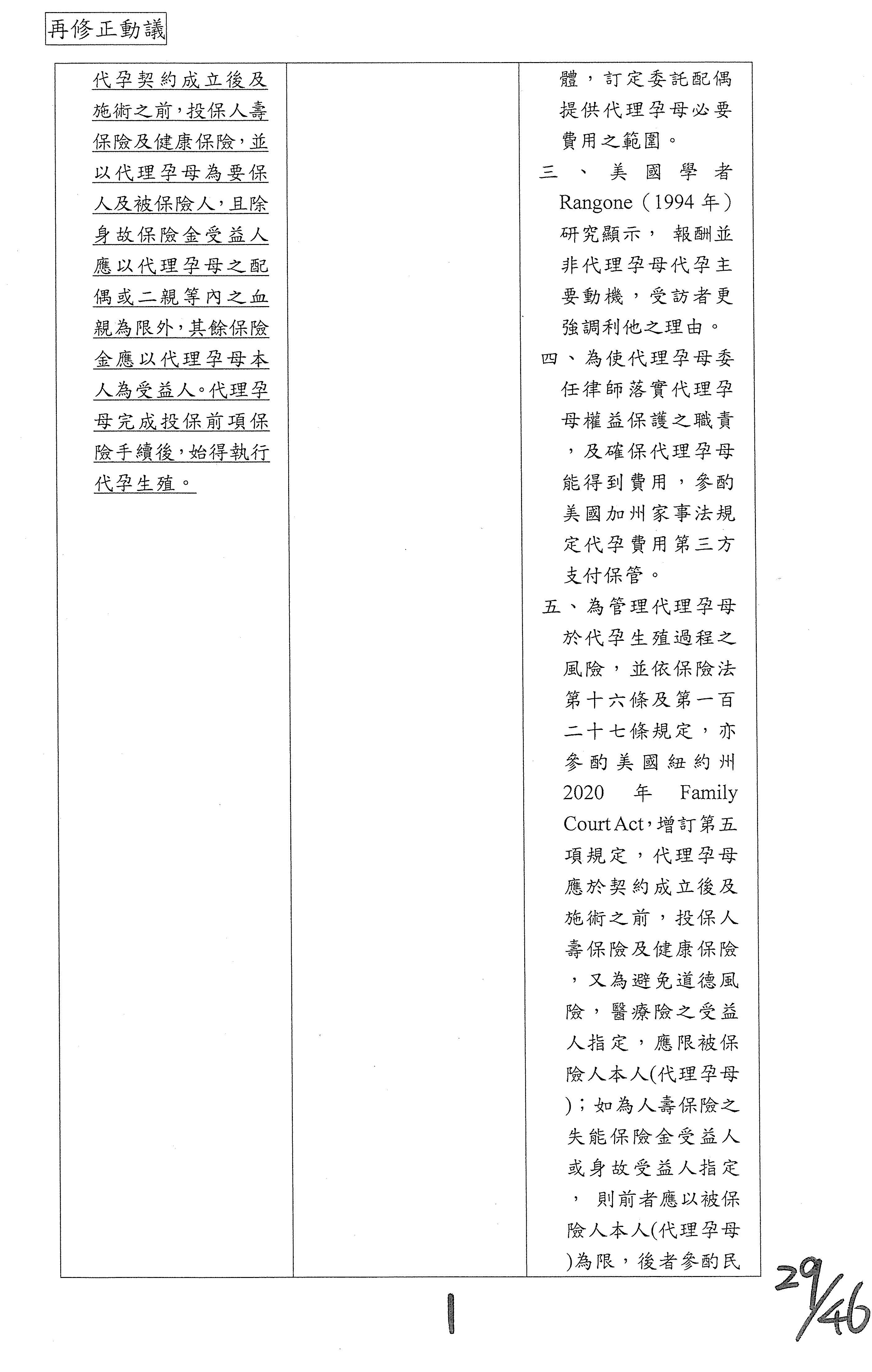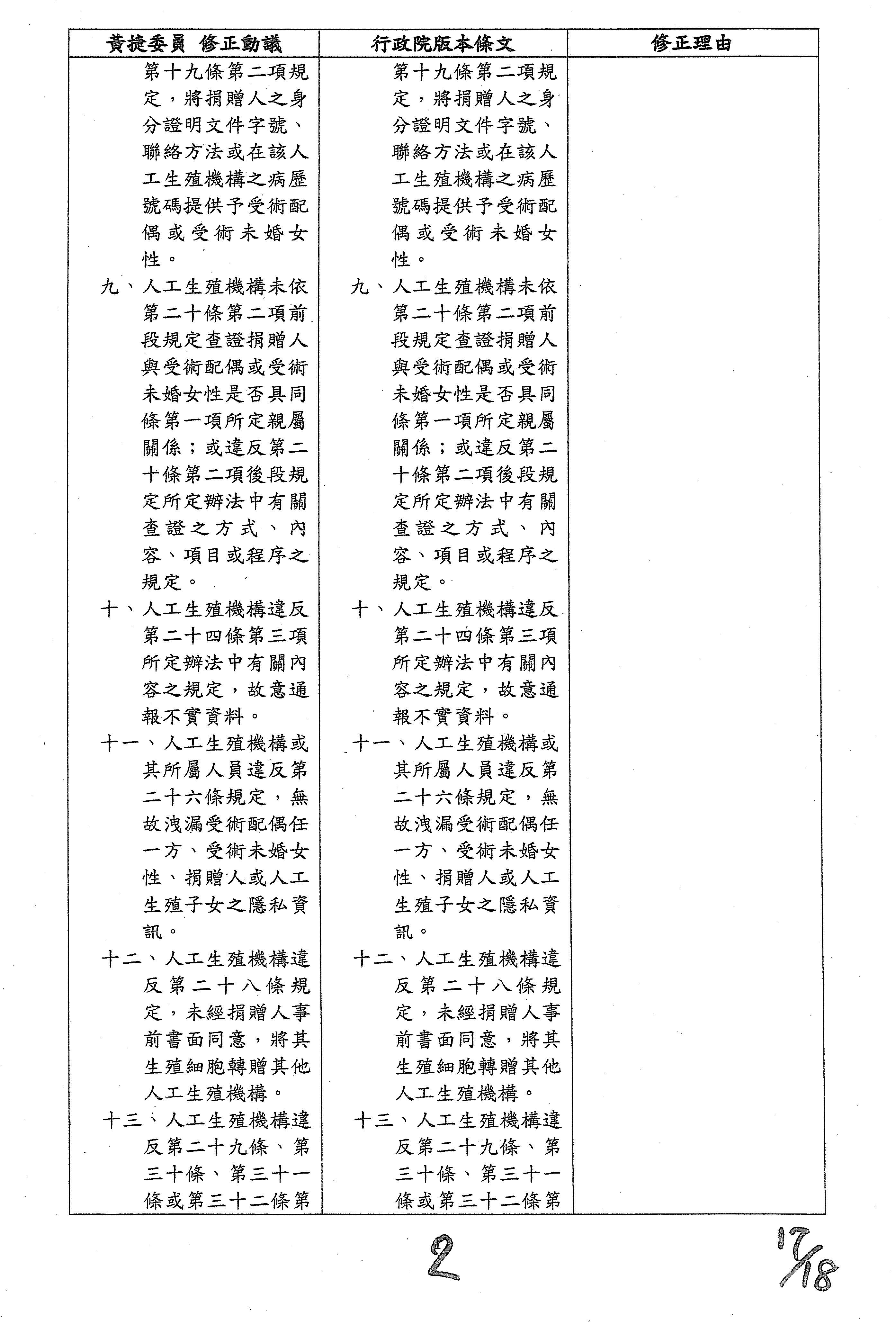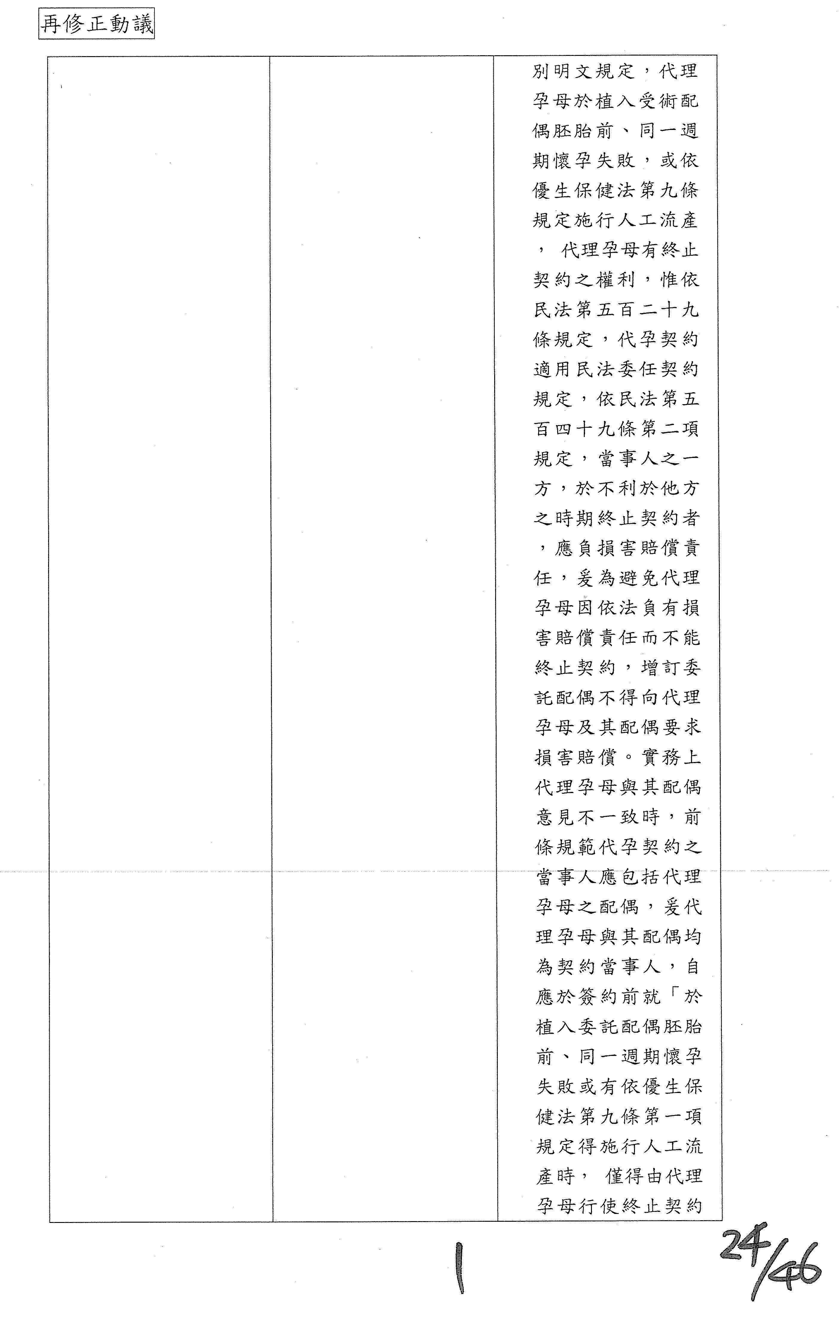 回應到第一條的修法,我們是堅決反對,就把社會最有爭議、最有疑義,而且在所有的版本當中也都欠缺共識的代理孕母就這樣塞進來了。如果要專法、其他的制度,go ahead,硬要把它擠到人工生殖法來,我想這就是一個核心的爭議議題,我們沒有辦法接受,請大家一起來支持行政院的院版,謝謝。