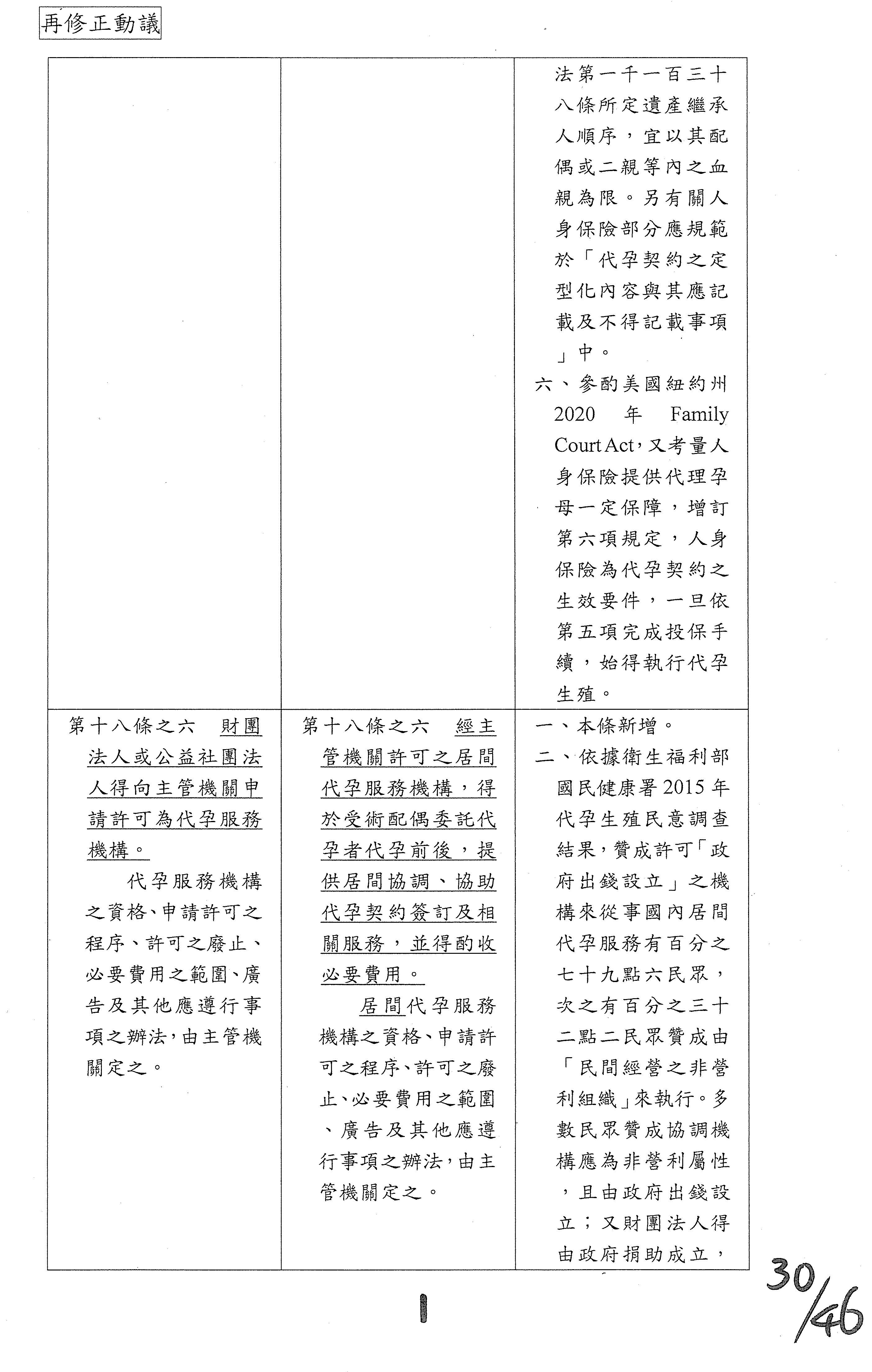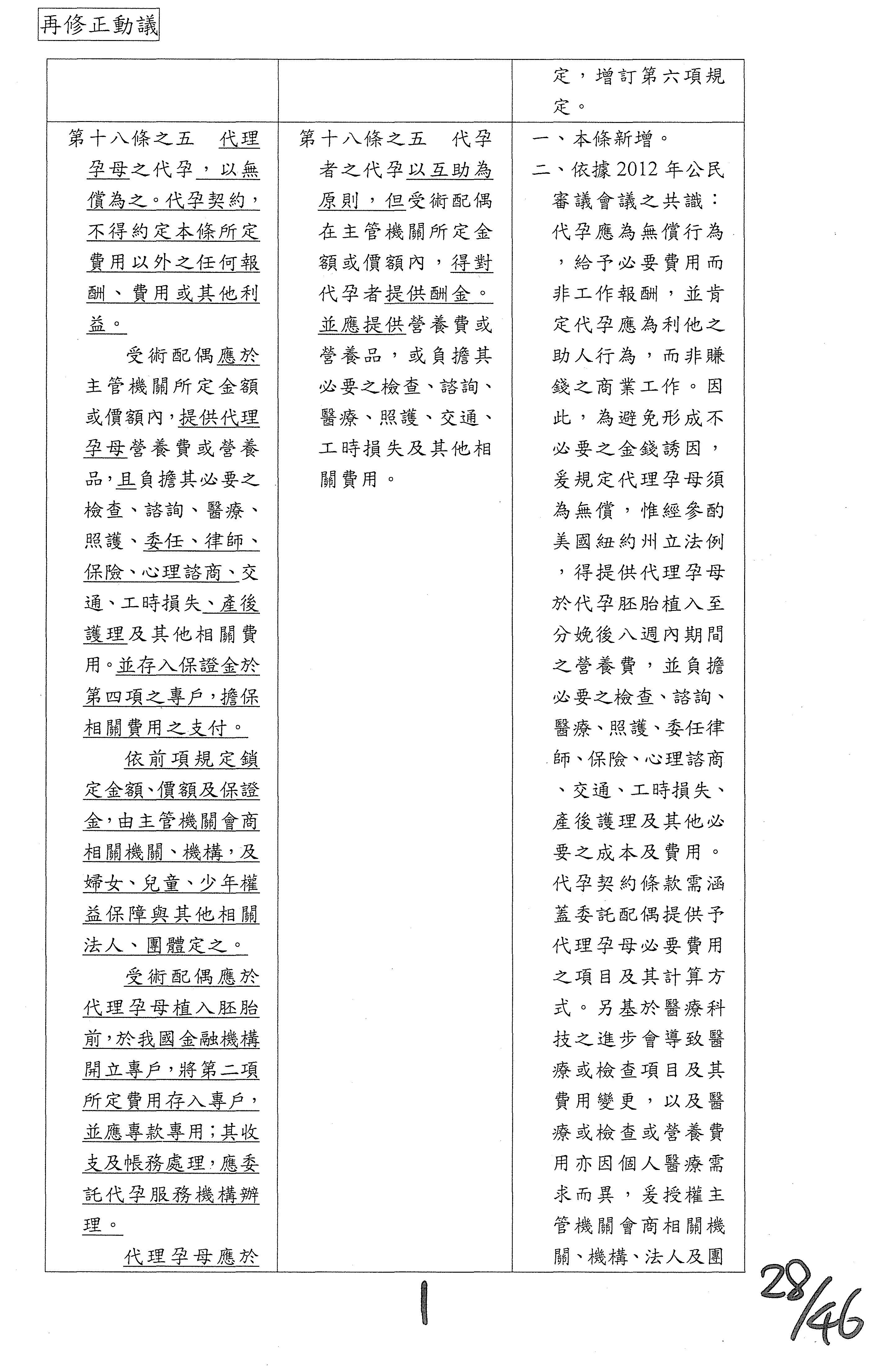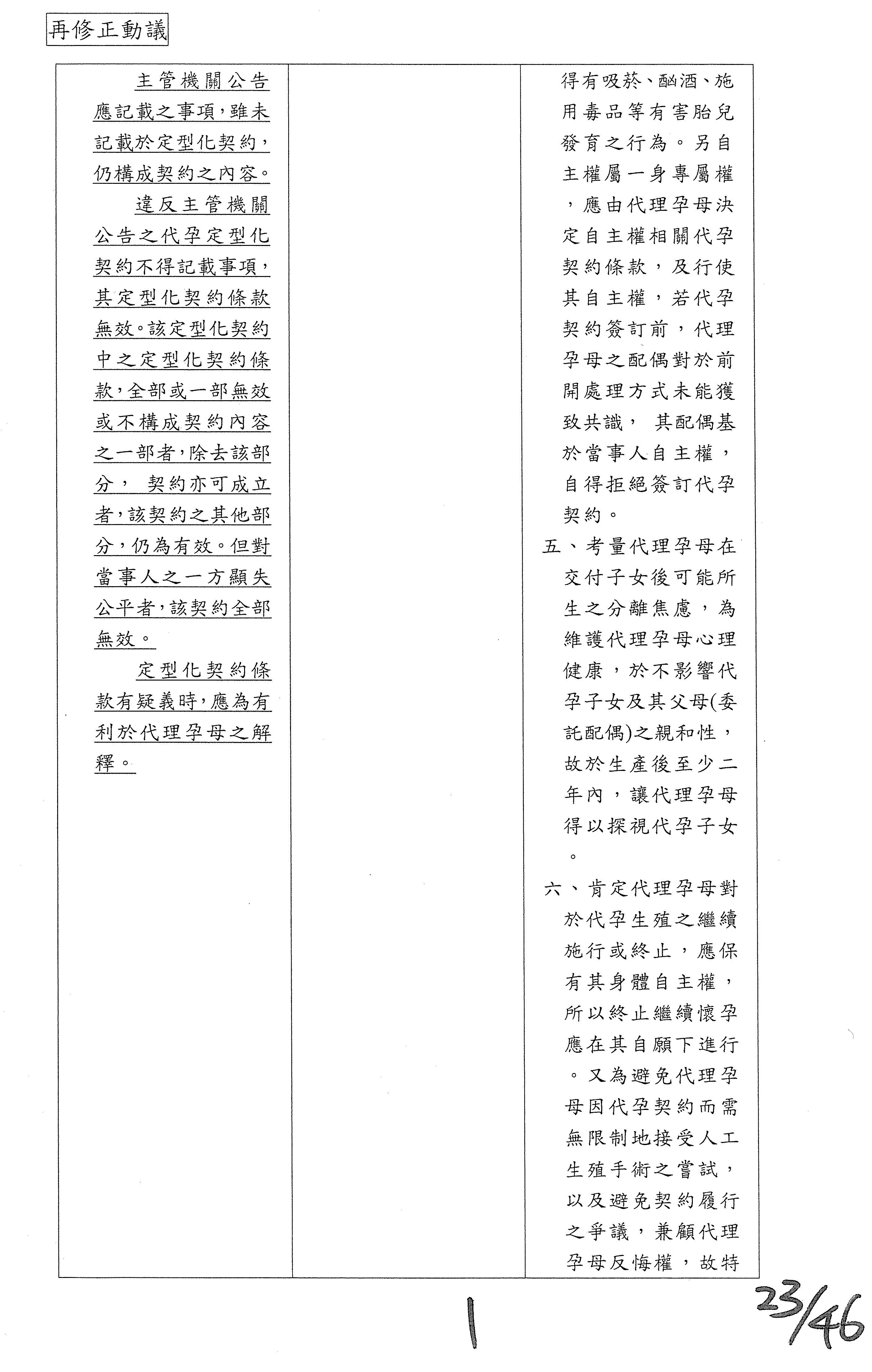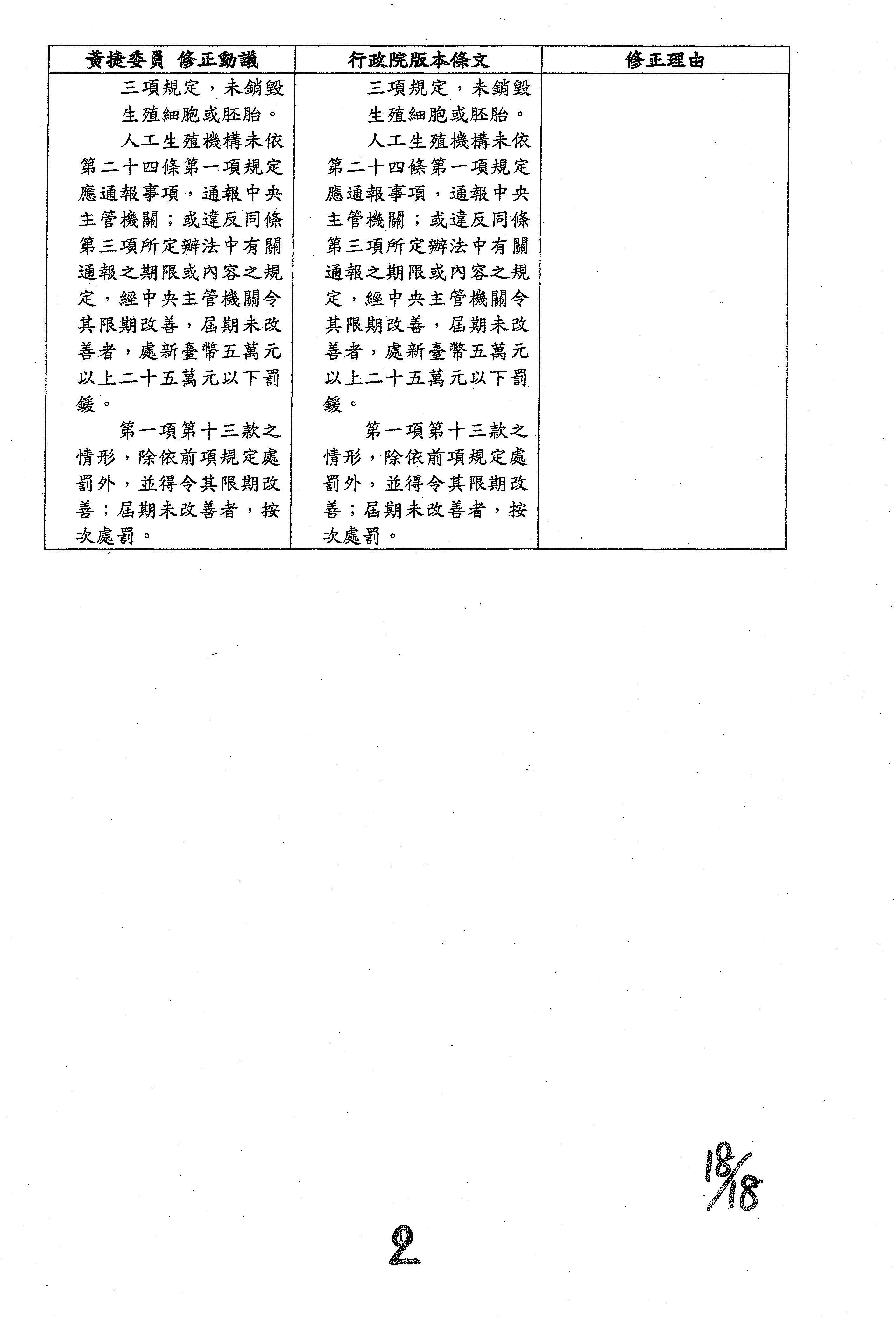 回應到第一條的修法,我們是堅決反對,就把社會最有爭議、最有疑義,而且在所有的版本當中也都欠缺共識的代理孕母就這樣塞進來了。如果要專法、其他的制度,go ahead,硬要把它擠到人工生殖法來,我想這就是一個核心的爭議議題,我們沒有辦法接受,請大家一起來支持行政院的院版,謝謝。