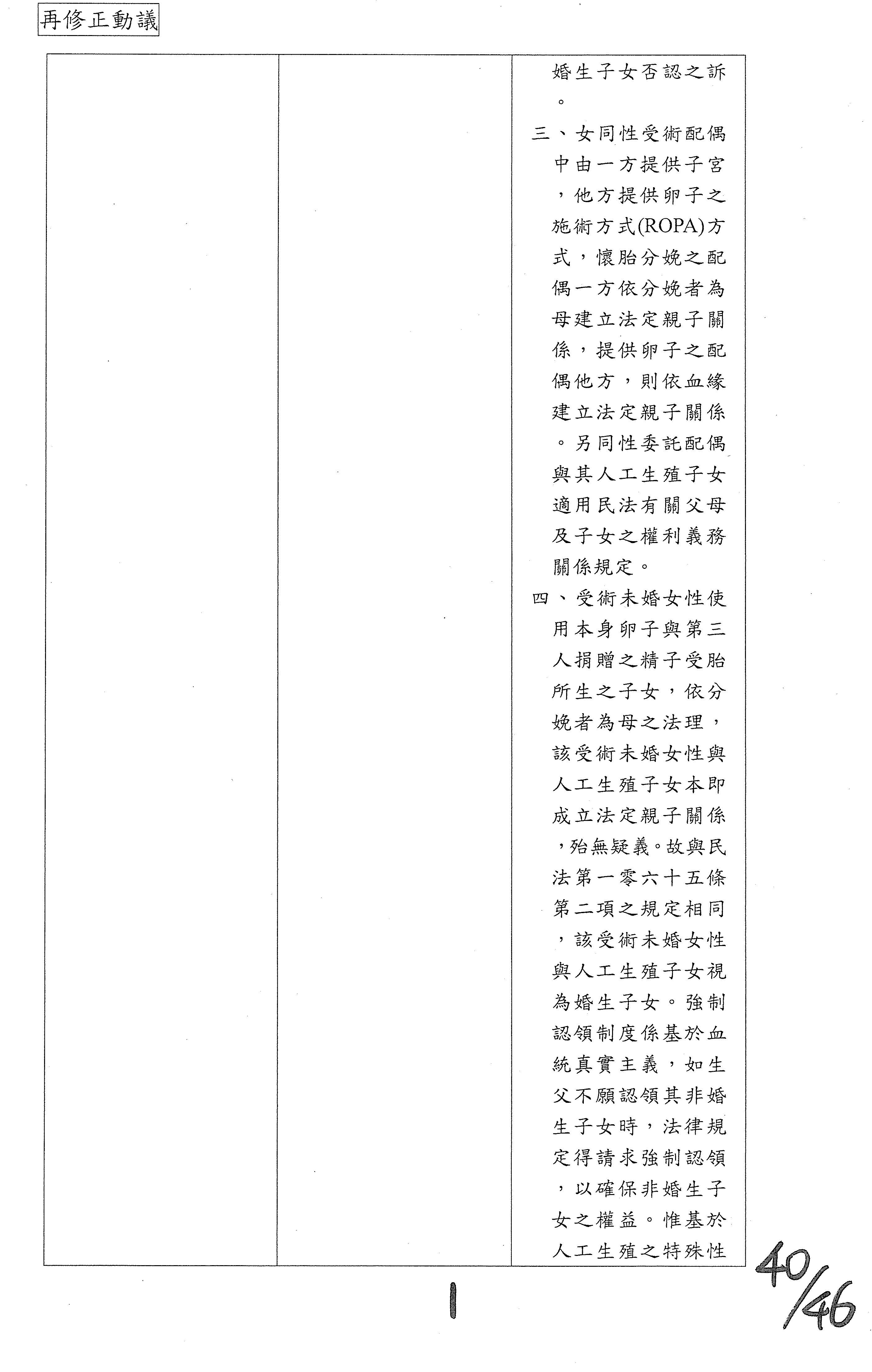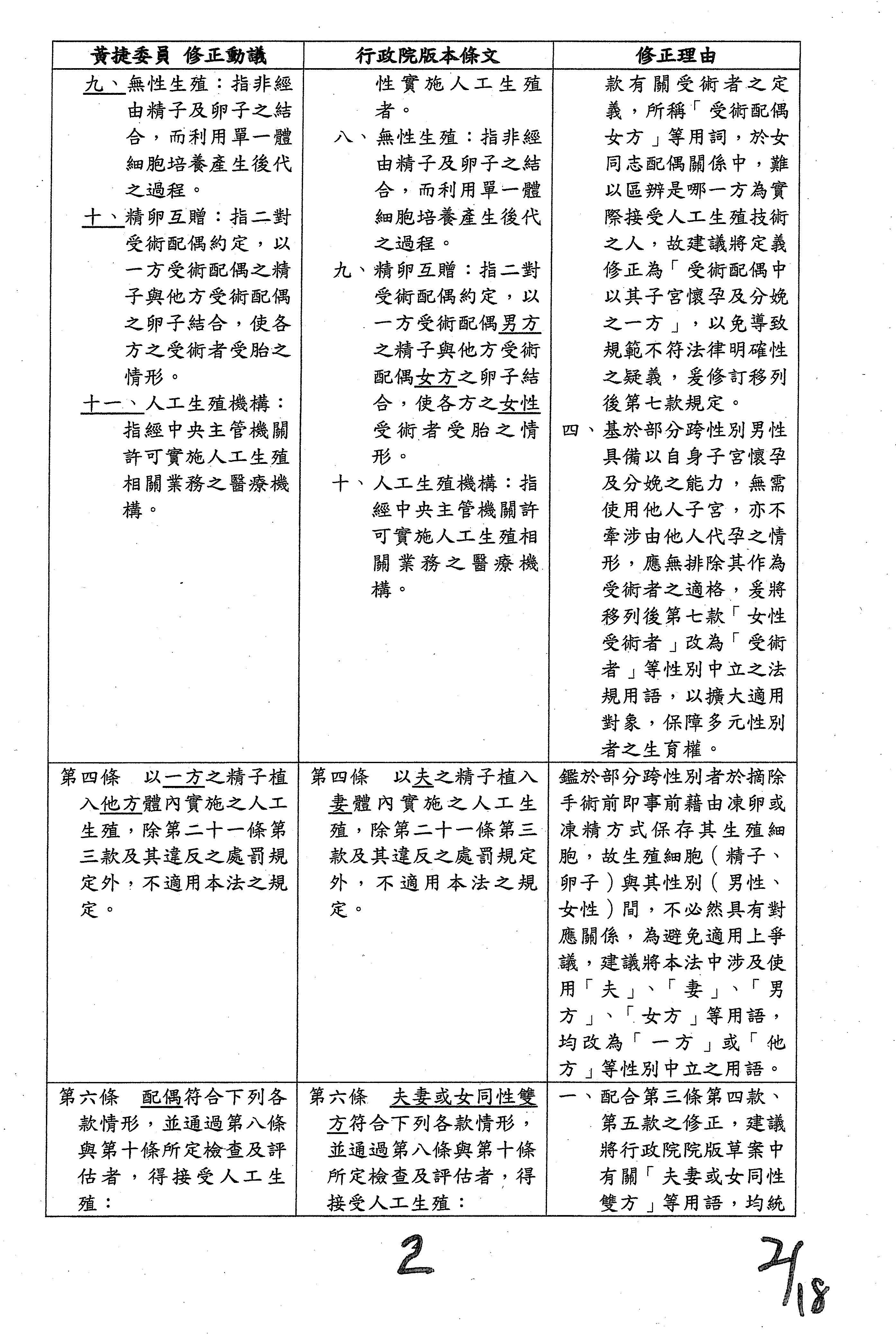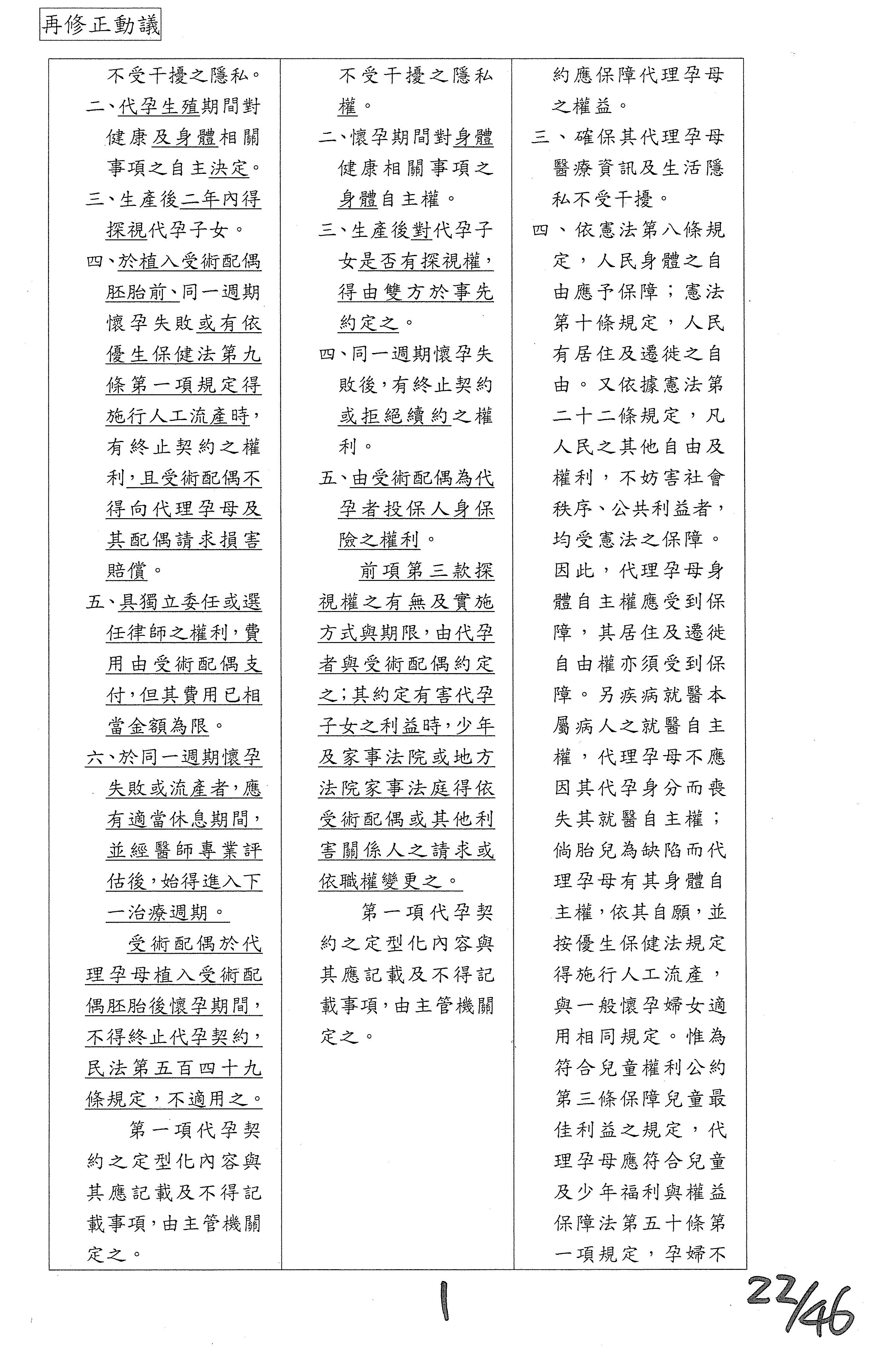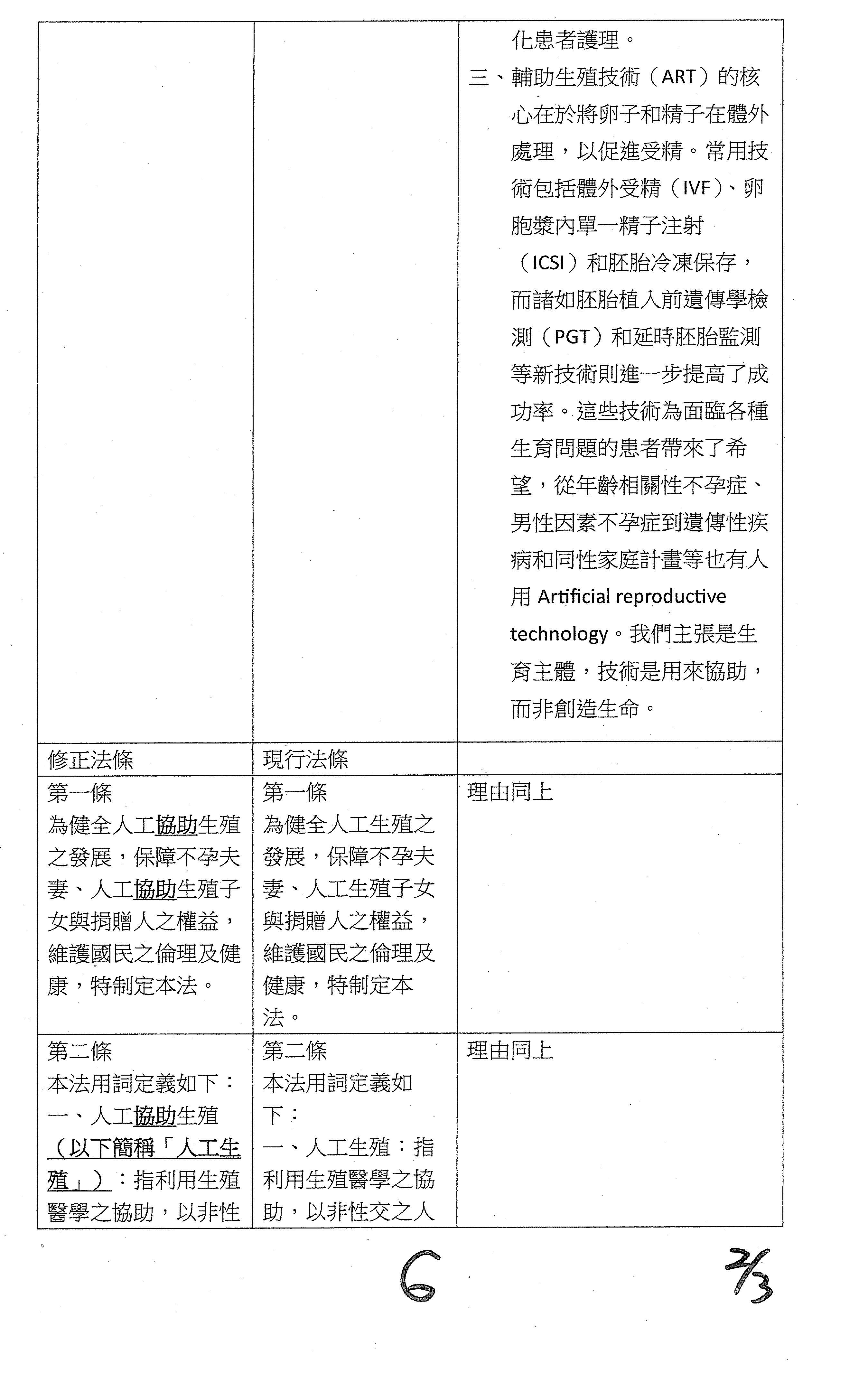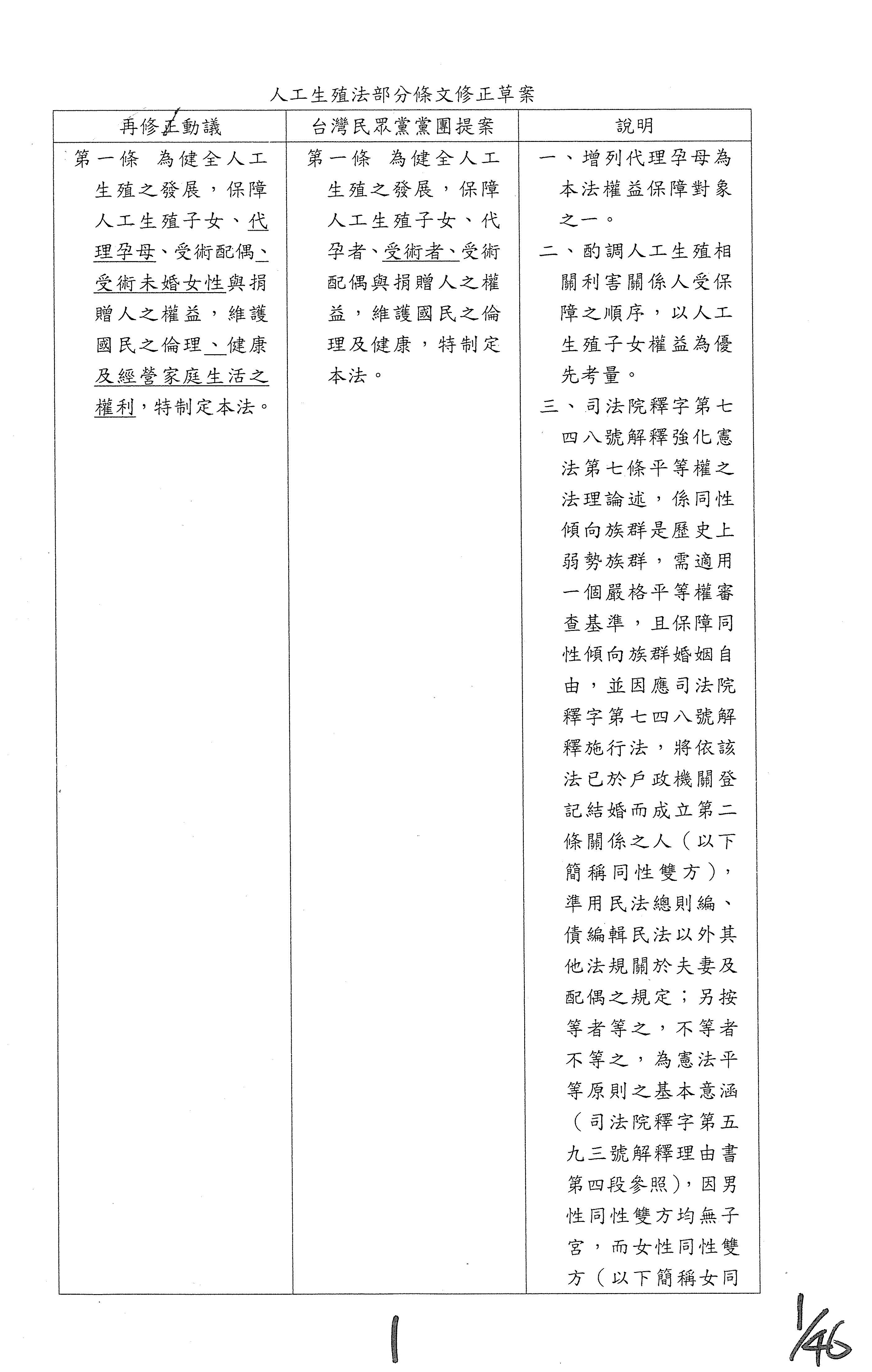 陳委員昭姿:我們基於這個……你們愛引用聯合國也罷,愛引用歐洲人權公約也罷,生育權、家庭權,尤其根據司法院解釋,所謂的家庭權的保障範圍包含組成家庭的權利,享有能力等等我們都要一併納入,所以民眾黨版的部分,請麻煩看再修正動議,全部都是再修正動議。我們第一條,為了健全人工生殖發展,保障人工生殖子女、代理孕母受術配偶、受術未婚女性與捐贈人之權益、維護國民之倫理健康及經營家庭生活權益,特制定本法。我們寫的次序是有意義的,我們第一個就是要保障子女的最佳利益,所以我們把保障人工生殖子女放在最前面,再來就是代理孕母,代理孕母也是我們整個核心要保護最重要的前兩個對象,然後再來就是受術配偶、受術未婚女性等等。所以基本上我們的再修正動議範圍包括需求代孕的家庭,以及女女同志跟單身部分,我們大概用這樣的精神寫我們的修正動議。以上。