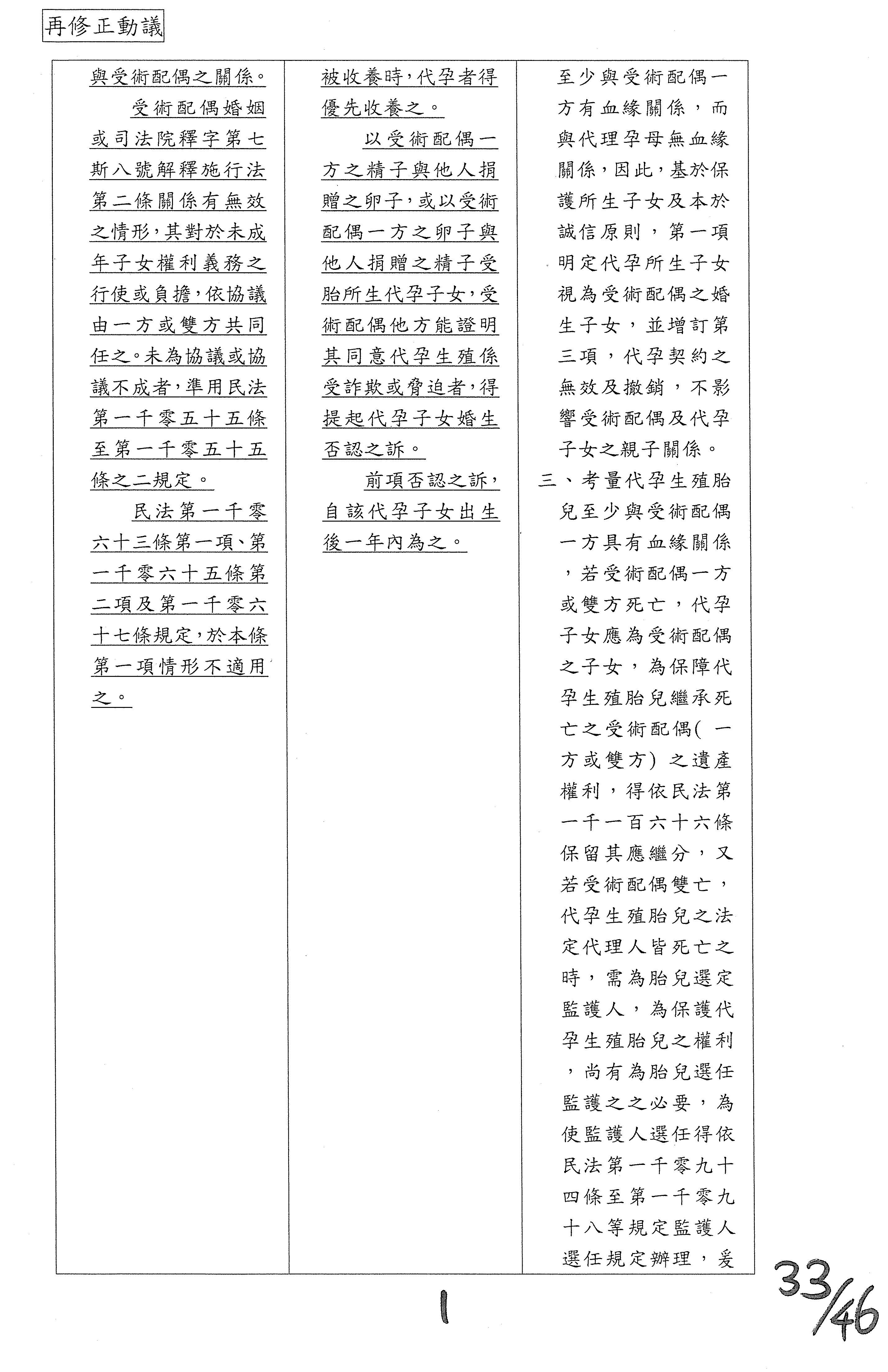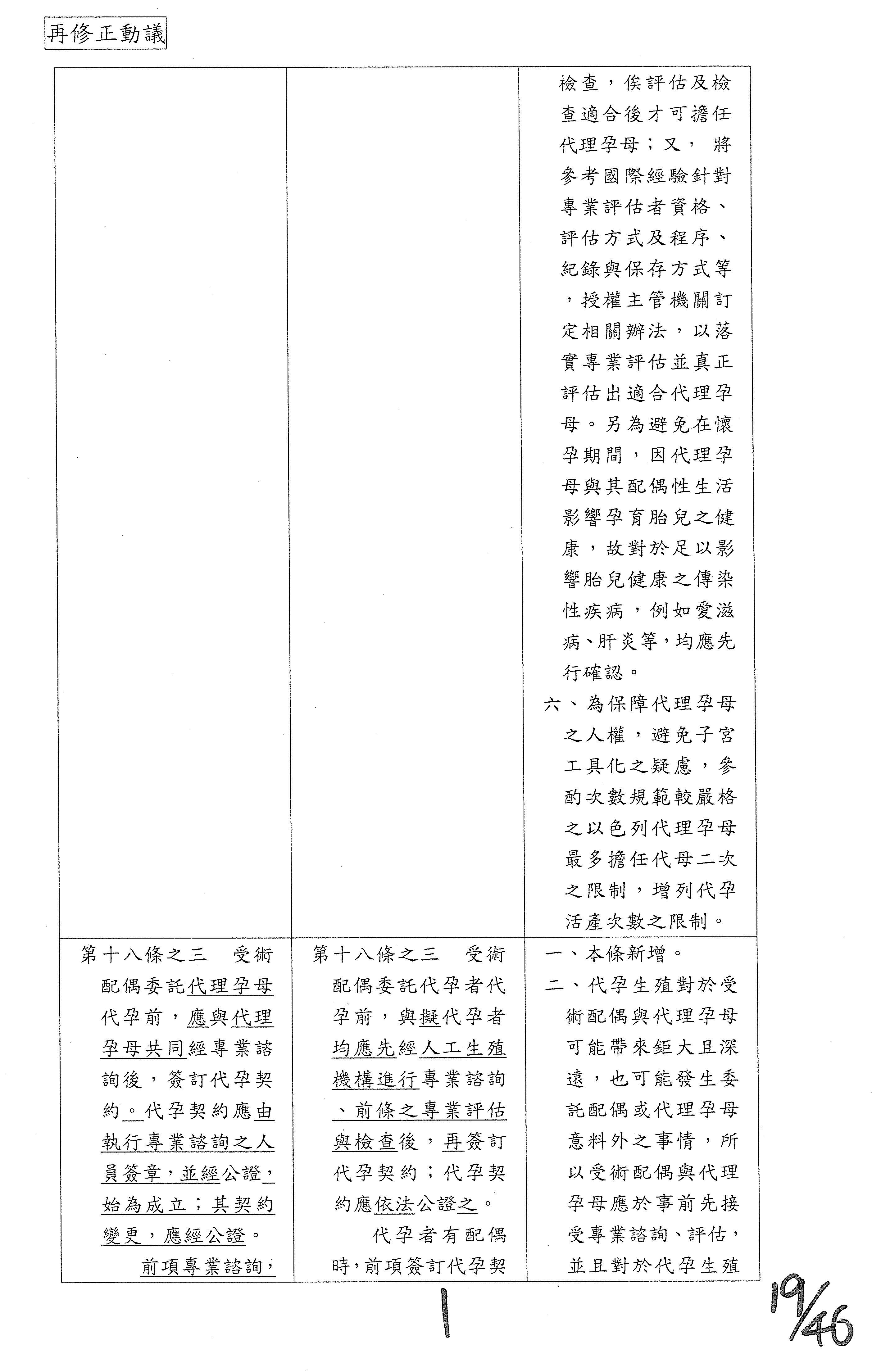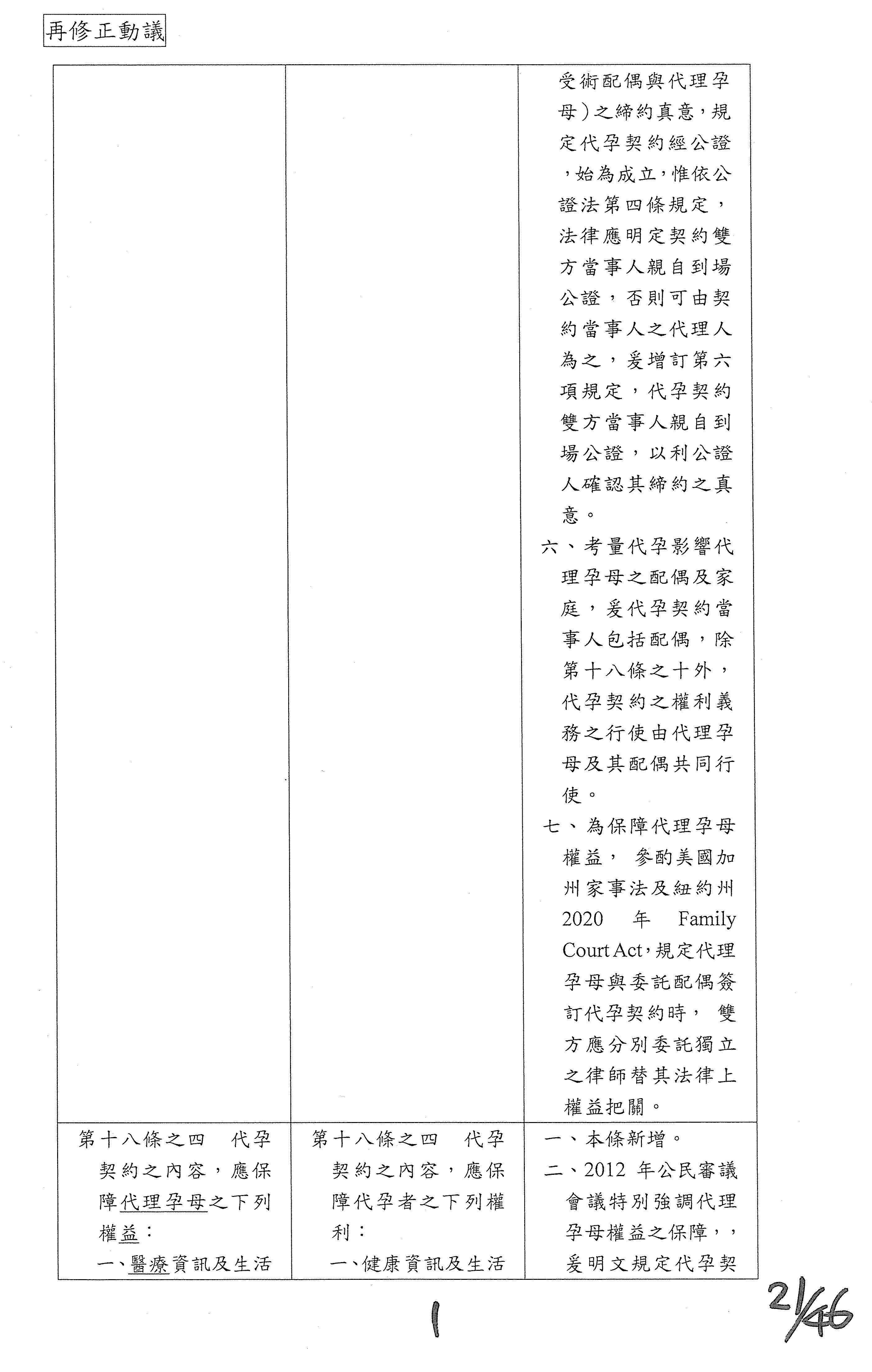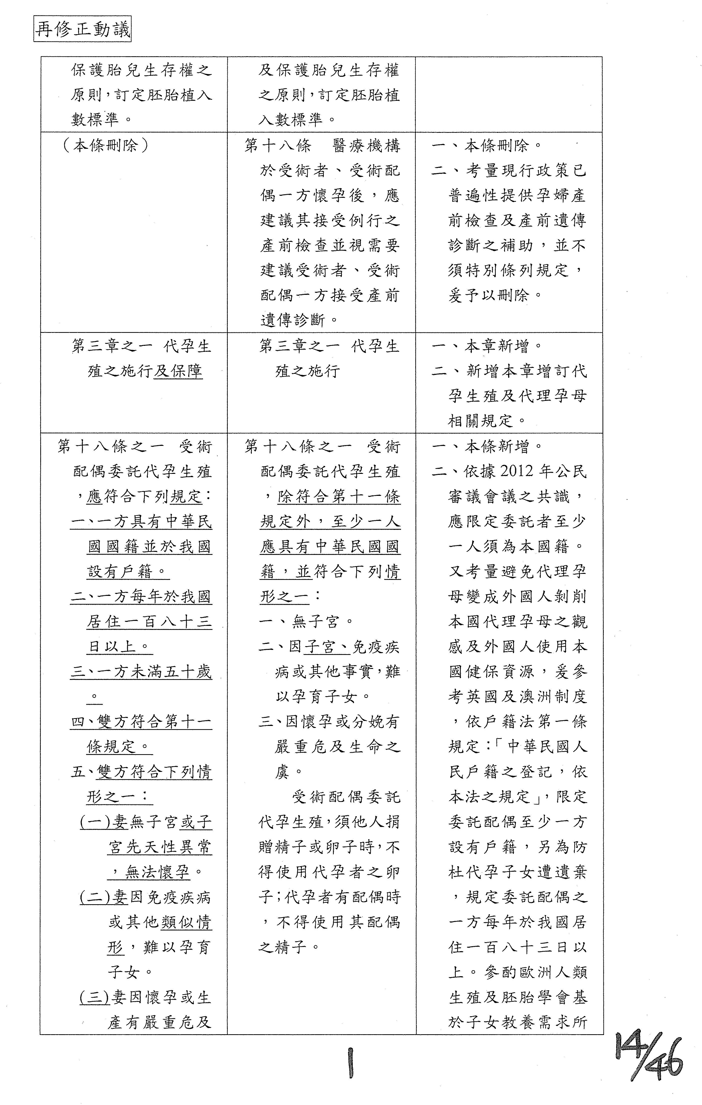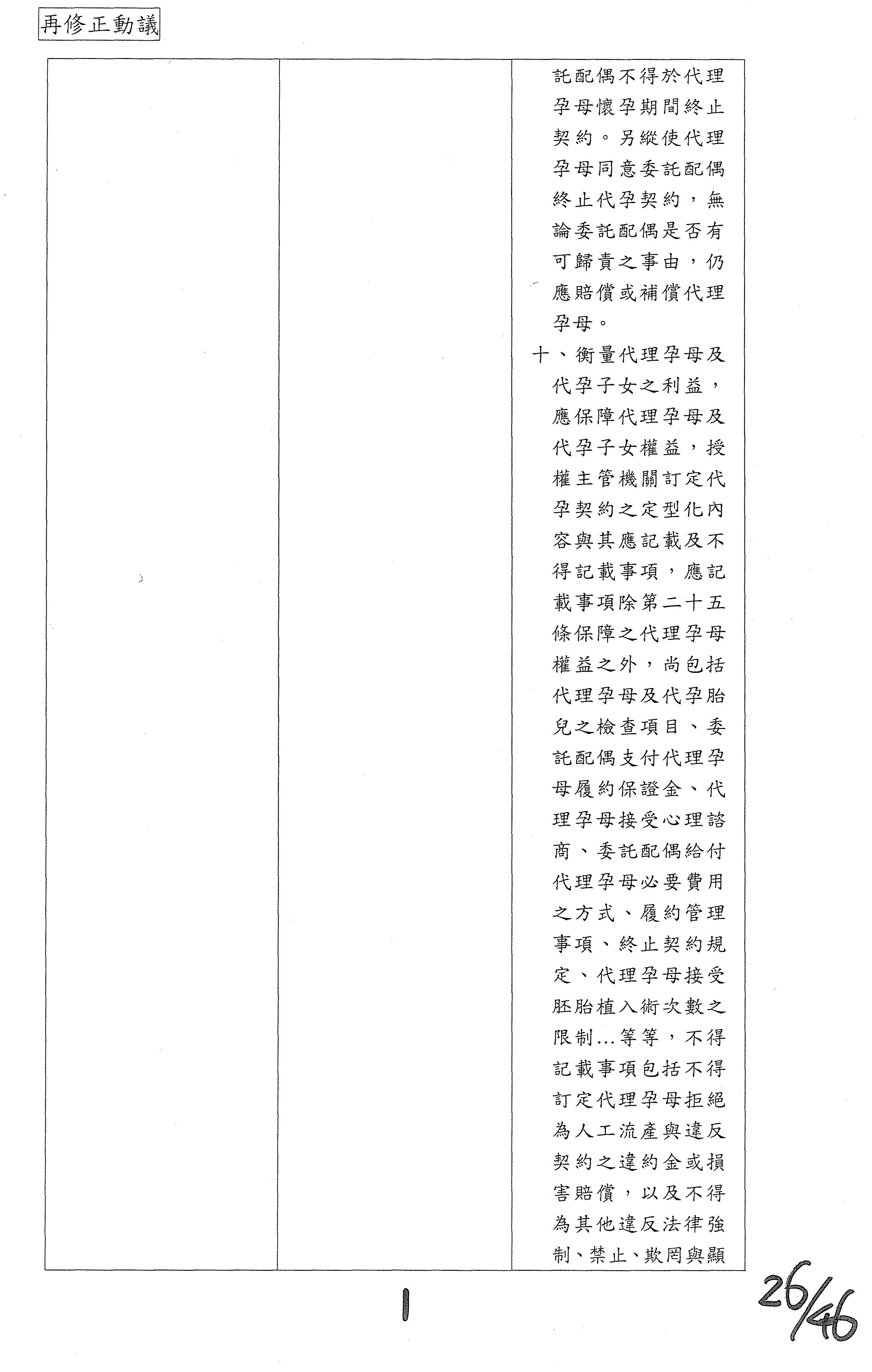 陳委員昭姿:我們基於這個……你們愛引用聯合國也罷,愛引用歐洲人權公約也罷,生育權、家庭權,尤其根據司法院解釋,所謂的家庭權的保障範圍包含組成家庭的權利,享有能力等等我們都要一併納入,所以民眾黨版的部分,請麻煩看再修正動議,全部都是再修正動議。我們第一條,為了健全人工生殖發展,保障人工生殖子女、代理孕母受術配偶、受術未婚女性與捐贈人之權益、維護國民之倫理健康及經營家庭生活權益,特制定本法。我們寫的次序是有意義的,我們第一個就是要保障子女的最佳利益,所以我們把保障人工生殖子女放在最前面,再來就是代理孕母,代理孕母也是我們整個核心要保護最重要的前兩個對象,然後再來就是受術配偶、受術未婚女性等等。所以基本上我們的再修正動議範圍包括需求代孕的家庭,以及女女同志跟單身部分,我們大概用這樣的精神寫我們的修正動議。以上。