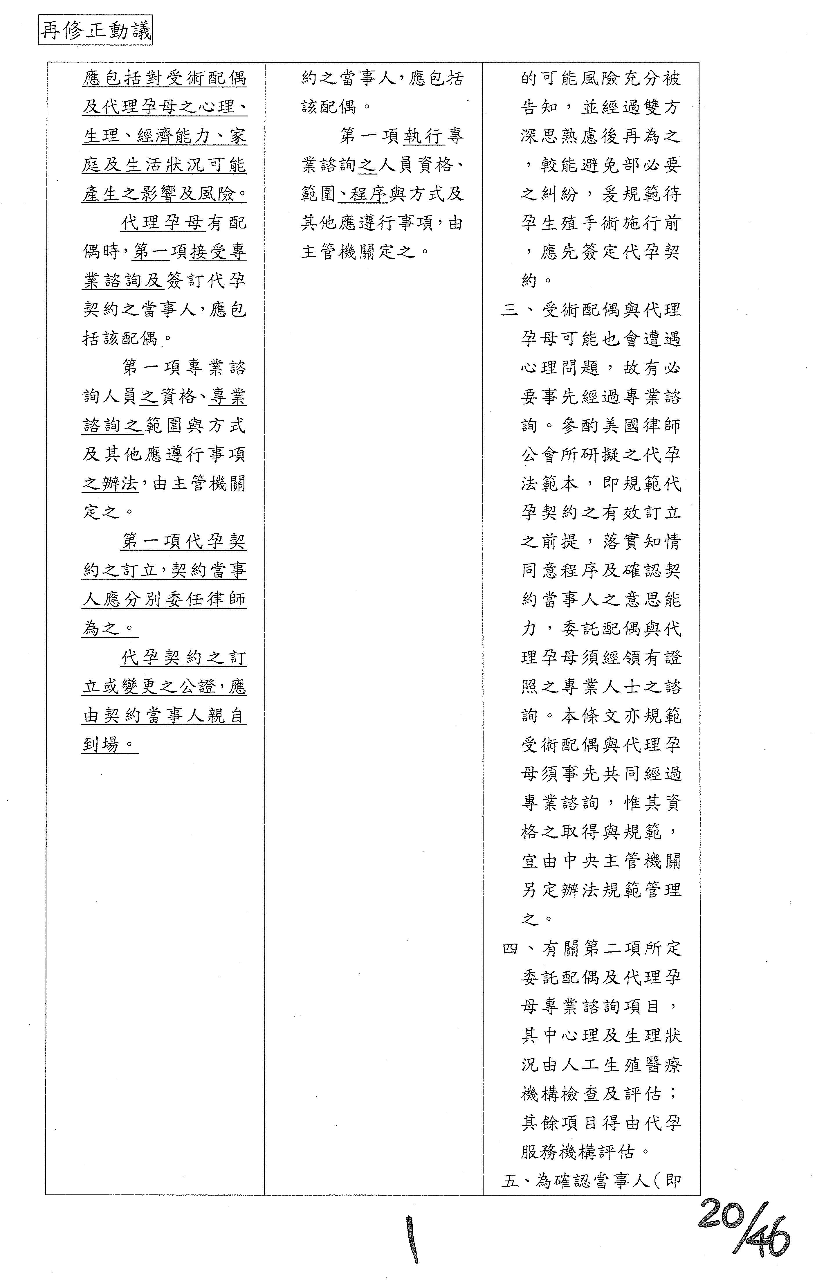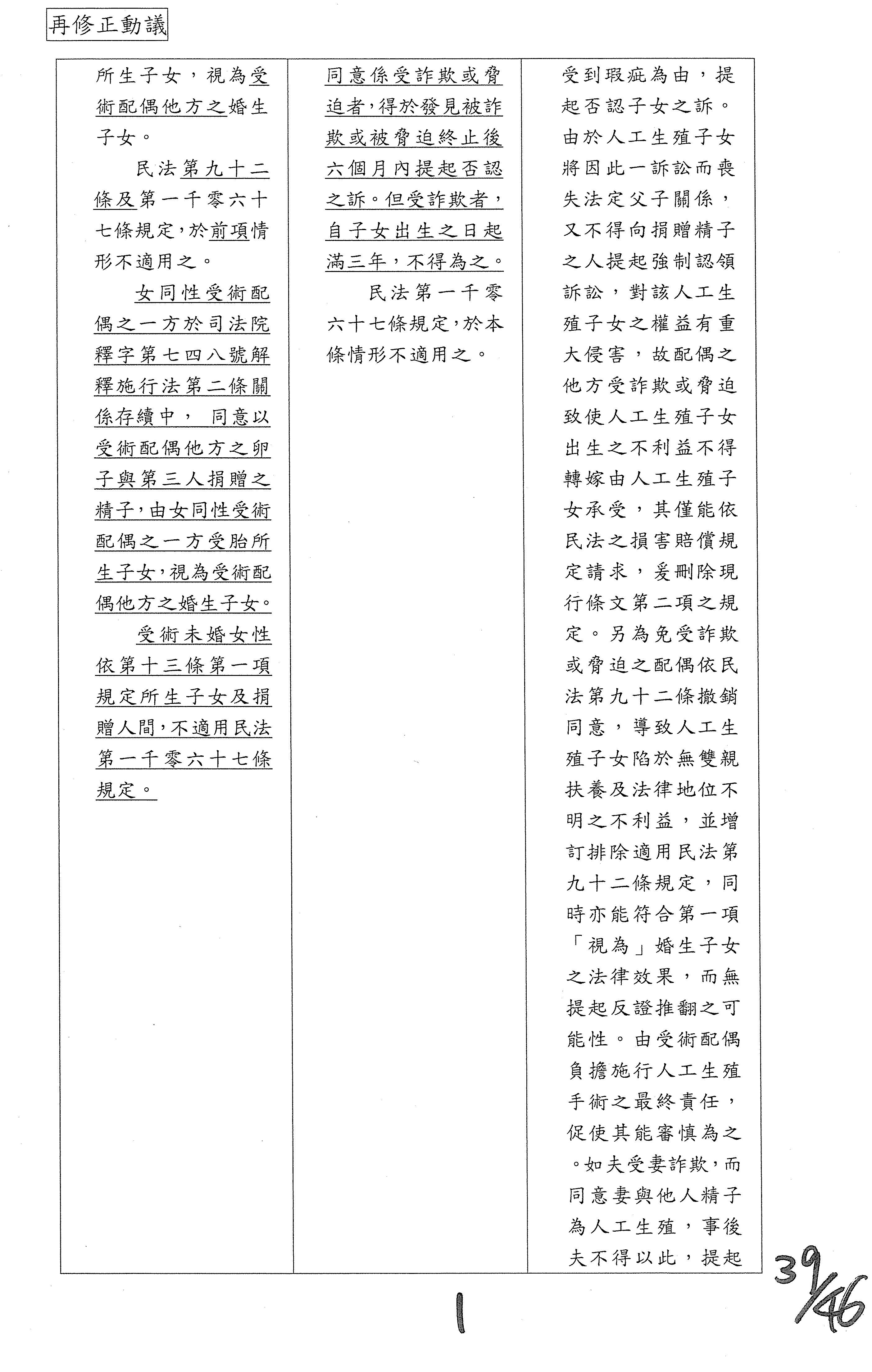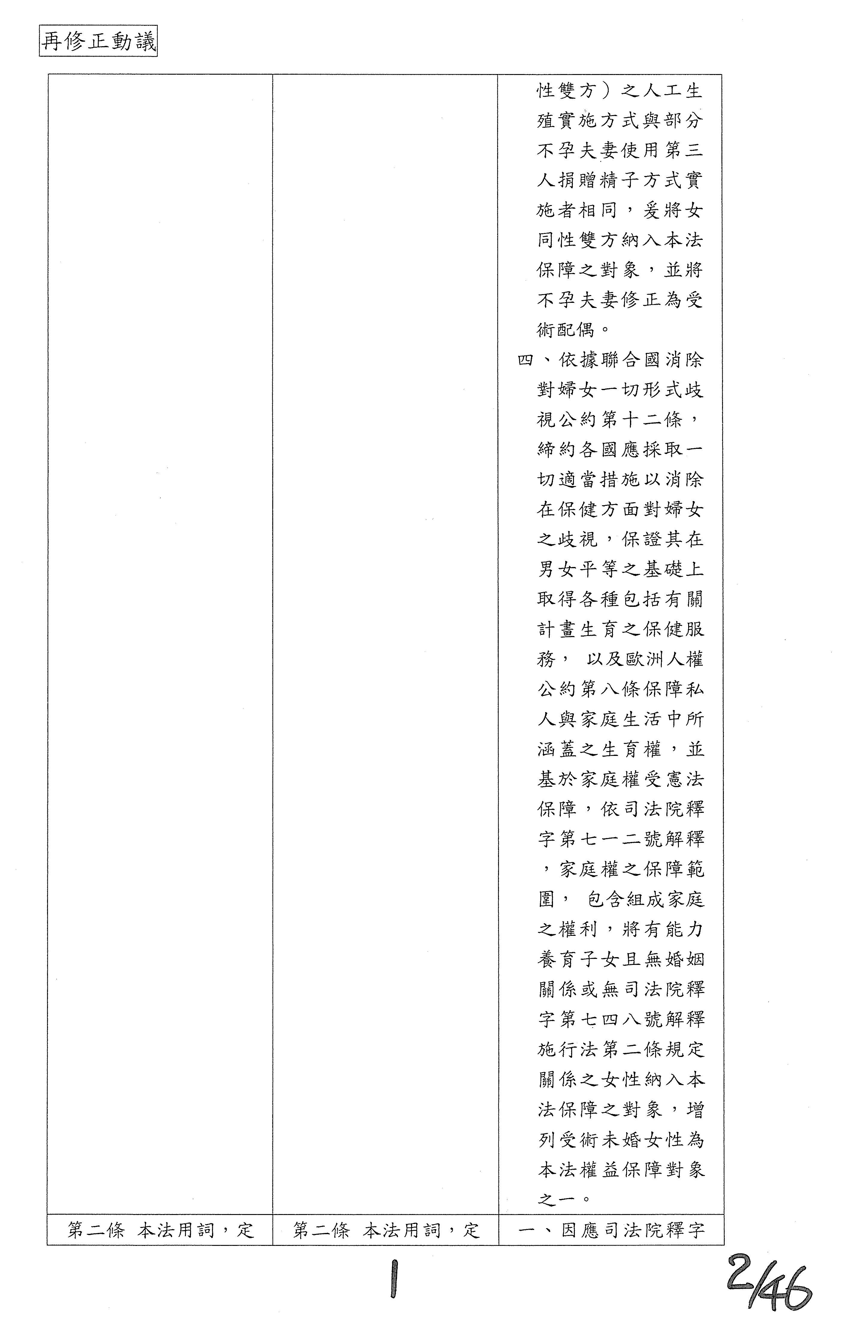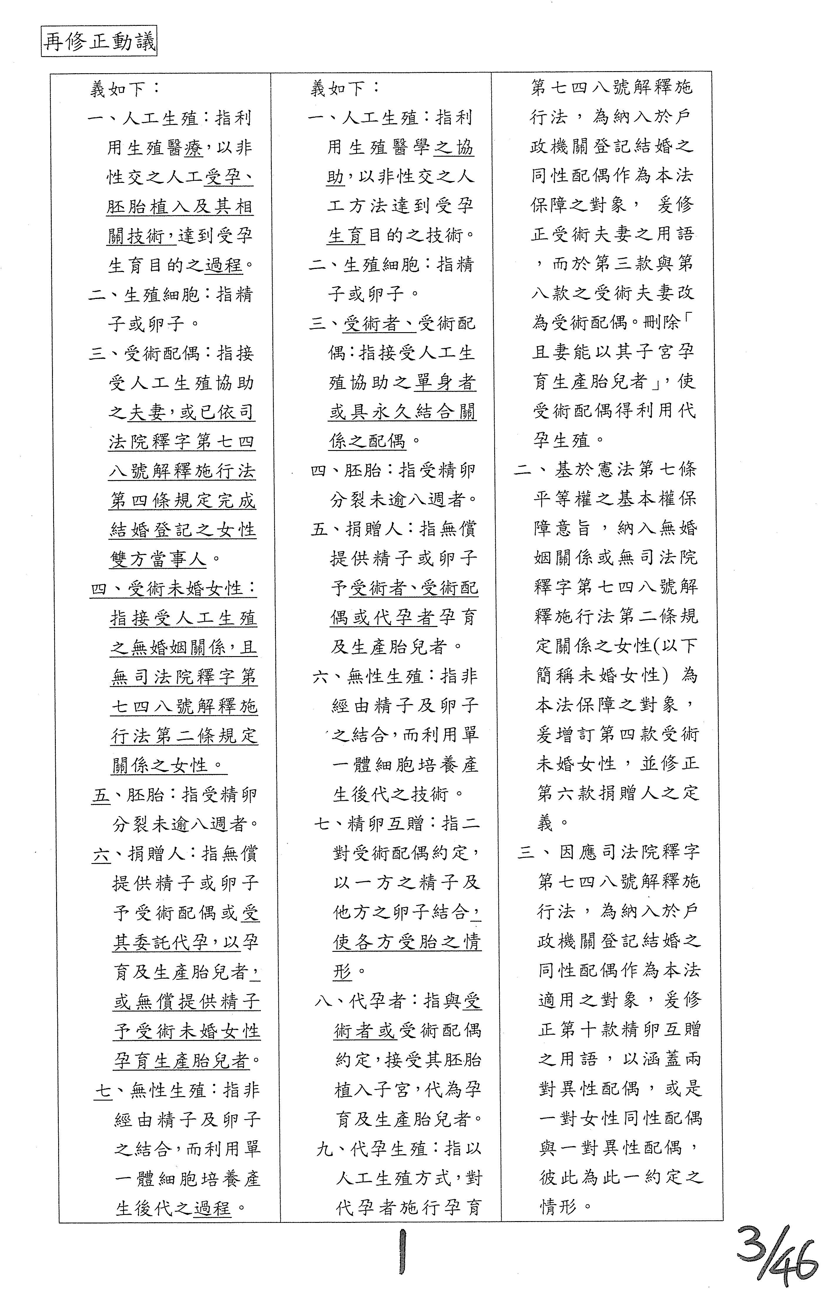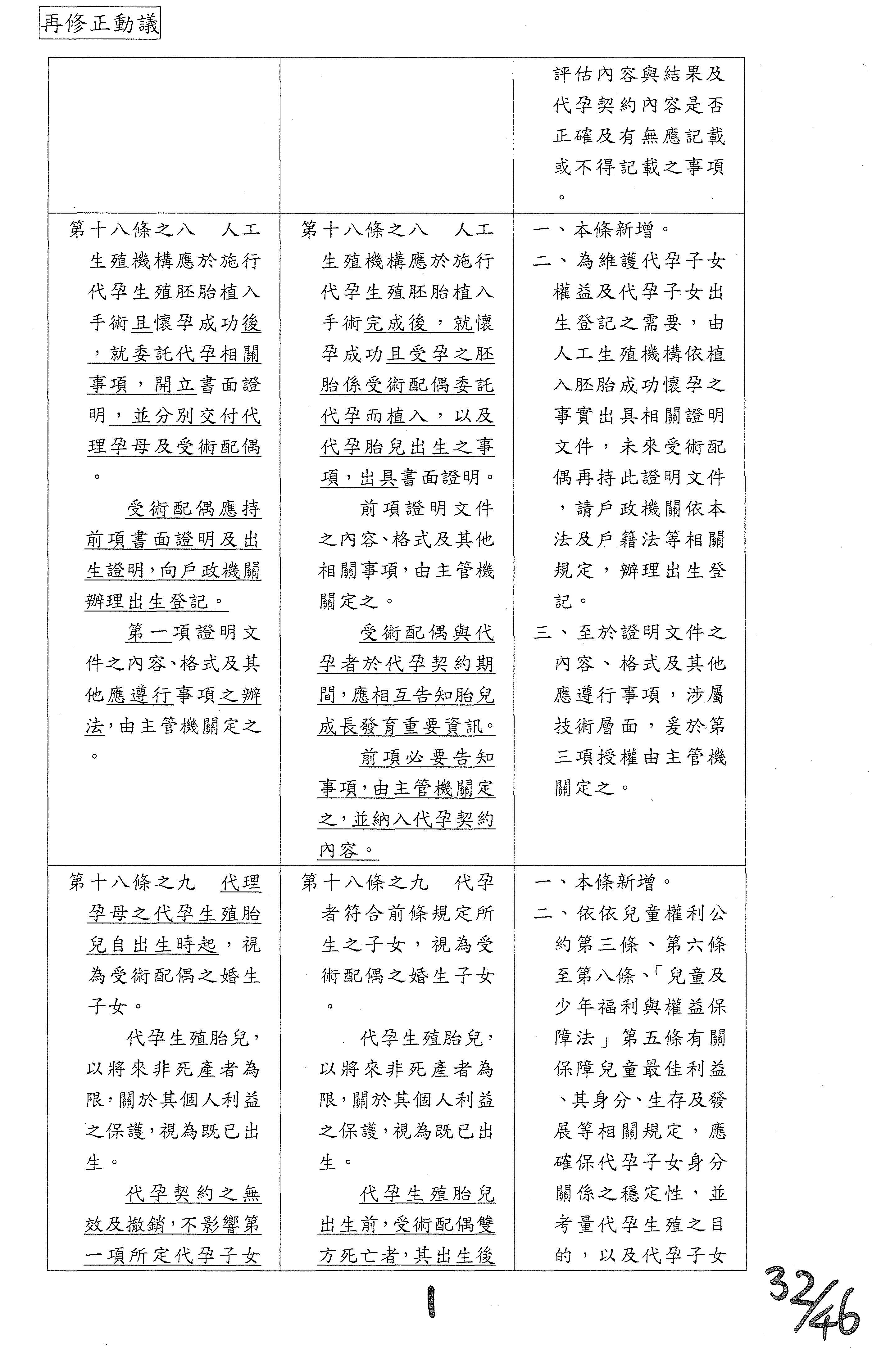 陳委員昭姿:我們基於這個……你們愛引用聯合國也罷,愛引用歐洲人權公約也罷,生育權、家庭權,尤其根據司法院解釋,所謂的家庭權的保障範圍包含組成家庭的權利,享有能力等等我們都要一併納入,所以民眾黨版的部分,請麻煩看再修正動議,全部都是再修正動議。我們第一條,為了健全人工生殖發展,保障人工生殖子女、代理孕母受術配偶、受術未婚女性與捐贈人之權益、維護國民之倫理健康及經營家庭生活權益,特制定本法。我們寫的次序是有意義的,我們第一個就是要保障子女的最佳利益,所以我們把保障人工生殖子女放在最前面,再來就是代理孕母,代理孕母也是我們整個核心要保護最重要的前兩個對象,然後再來就是受術配偶、受術未婚女性等等。所以基本上我們的再修正動議範圍包括需求代孕的家庭,以及女女同志跟單身部分,我們大概用這樣的精神寫我們的修正動議。以上。