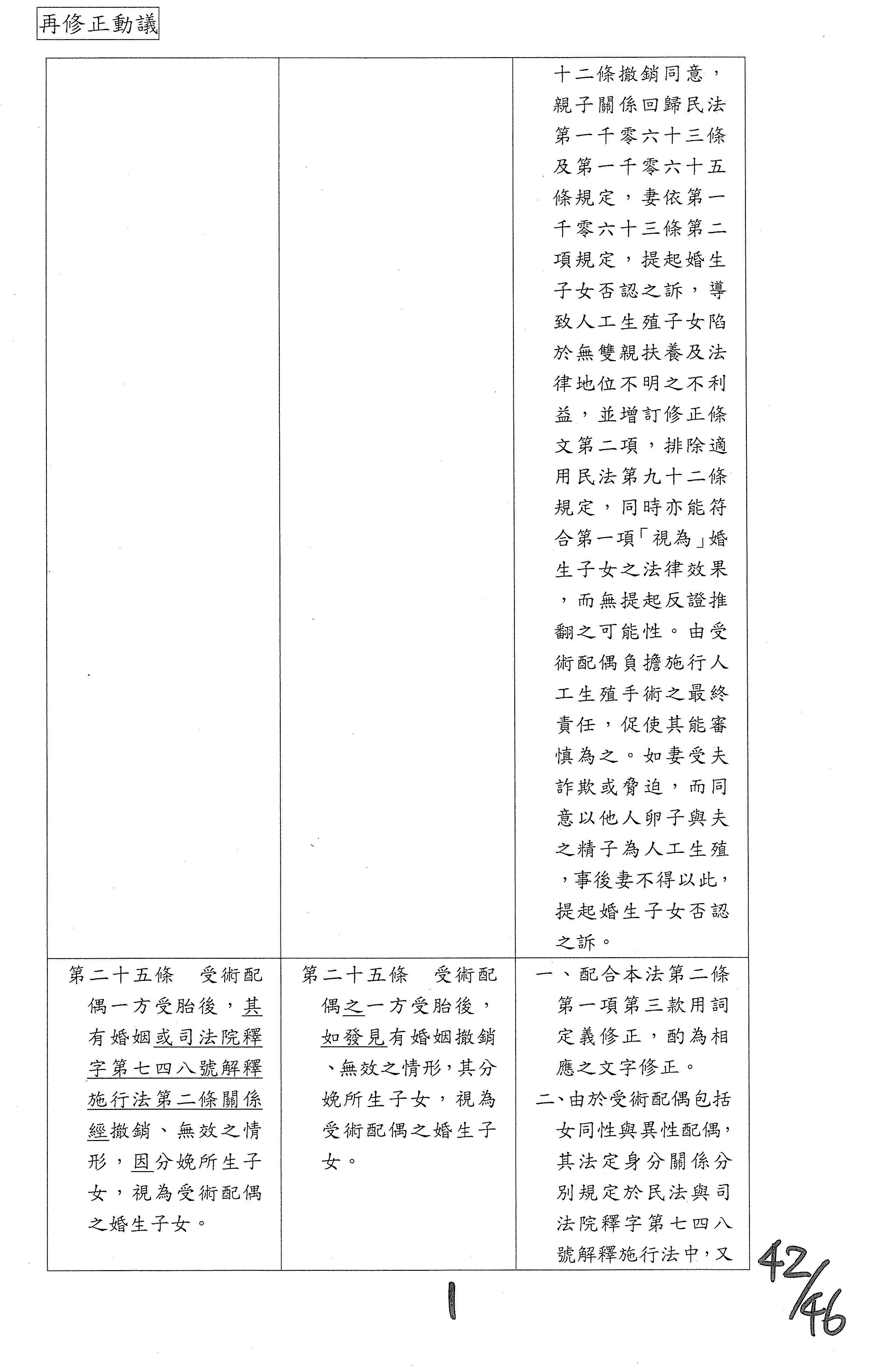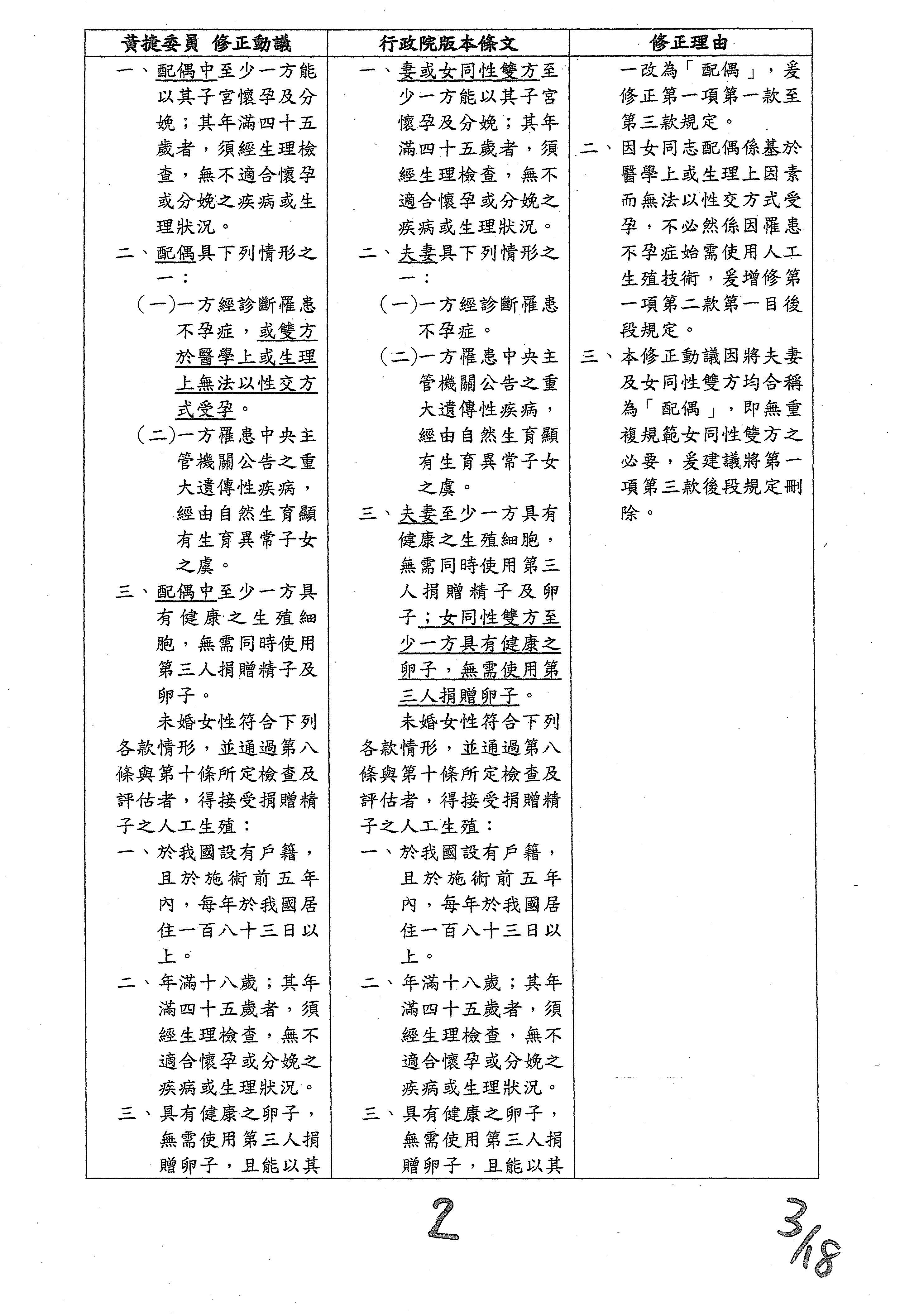 范委員雲:這邊解釋一下,我的版本原本是把不孕夫妻直接改成使用人工生殖者,主要是因為這樣可以涵蓋受術配偶跟受術的單身女性,但是我剛剛聽到行政院是不是有把受術未婚女性的字眼改成受術單身女性?這樣子我也覺得可以接受,因為我本來想提未婚的部分,當然我覺得我的版本更簡潔,但是這邊我不會堅持。