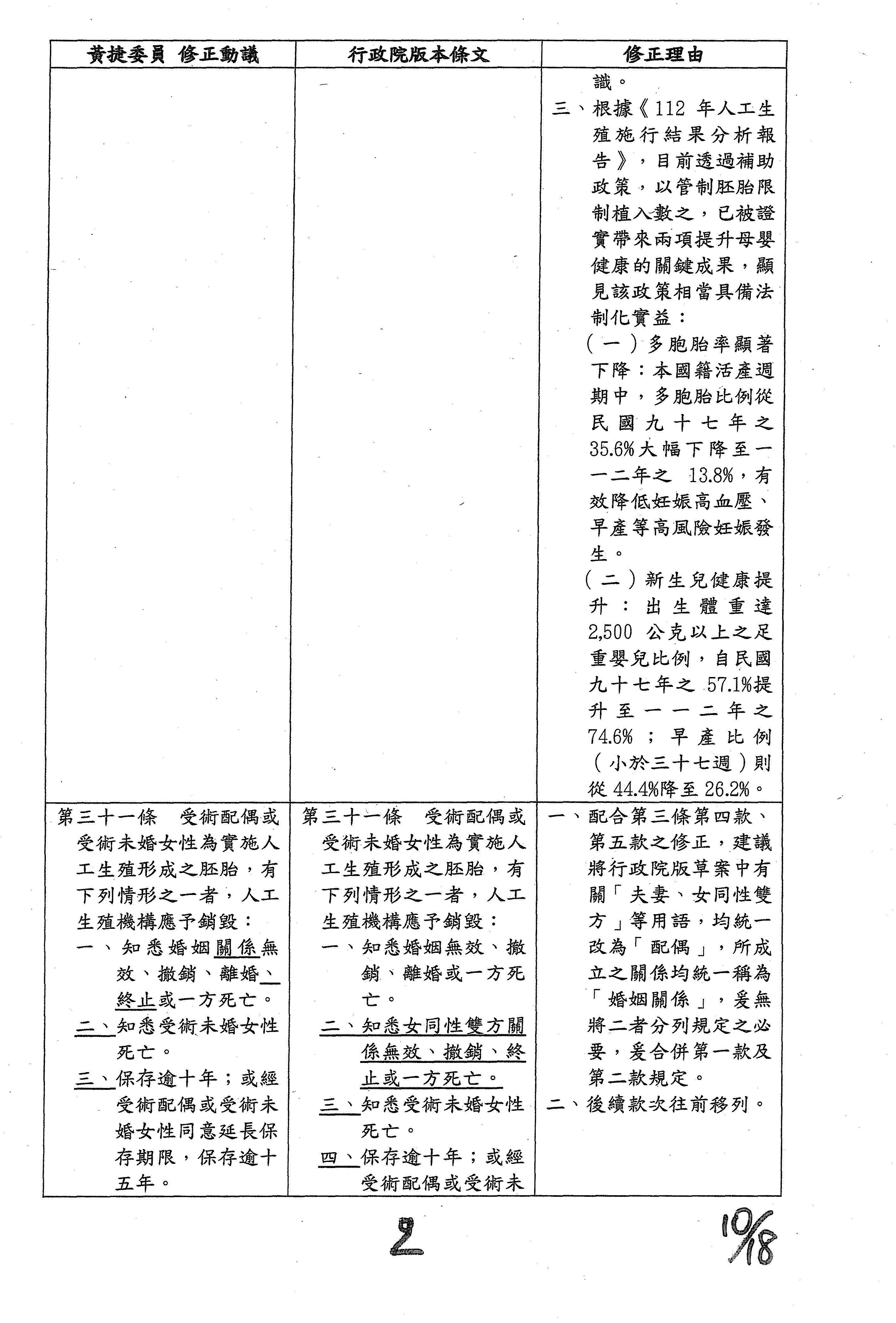 陳委員培瑜:好,我想要講一下就是關於民眾黨團的提案,我們當然是不支持的,因為代孕議題真的是太複雜,真的不應該就這樣隨便放進來,但是我們當然尊重提案委員的想法。另外,關於談到受術單身女性這件事情,我當然可以理解我們當時在提這個版本的時候,大家對於婚姻關係的存在與否視為單身,這個是我們一般人都可以理解的。可是我們要講的是,當我們決定把「經營家庭生活之權利」拿掉,代表我們都認同現在是多元家庭或是多元伴侶的時代,也確實有非常多這樣的狀況。有一個部分,我們辦公室有想到,當然就提出來讓大家討論,就是關於他可能有伴侶,但是沒有結婚的女性,實質上他在法理上當然還是屬於單身,可是在實質生活上,他應該是非單身,這樣的人到底可不可以使用人工生殖?他到底歸不歸入單女?這個部分我們本來是希望建議寫成一個叫做:無法律上婚姻關係的女性,當然這樣寫比較繞口,可是我想我還是做一個提醒,當然我們還是尊重目前這個寫法,就是受術單身女性的部分,以上,謝謝。