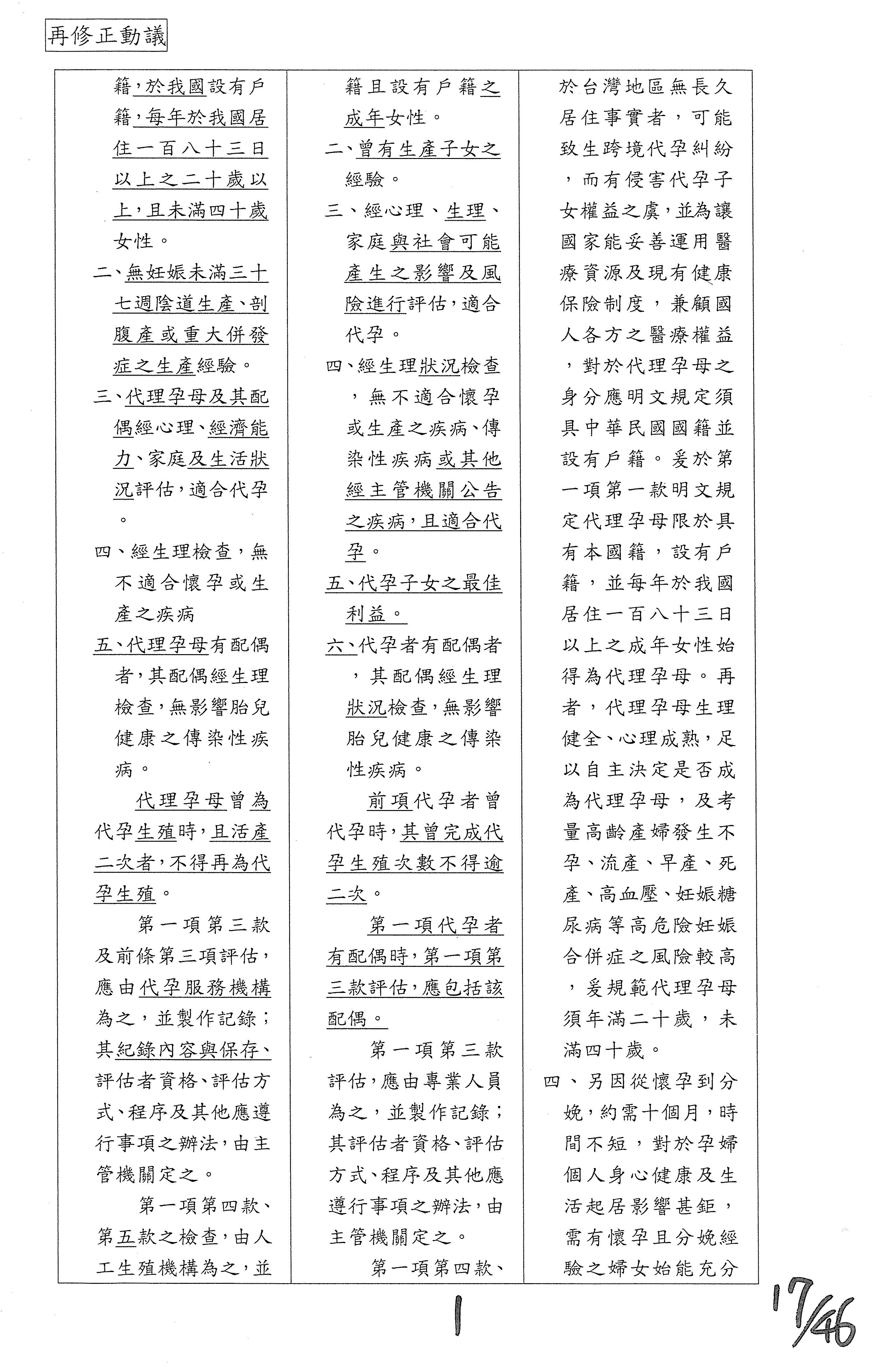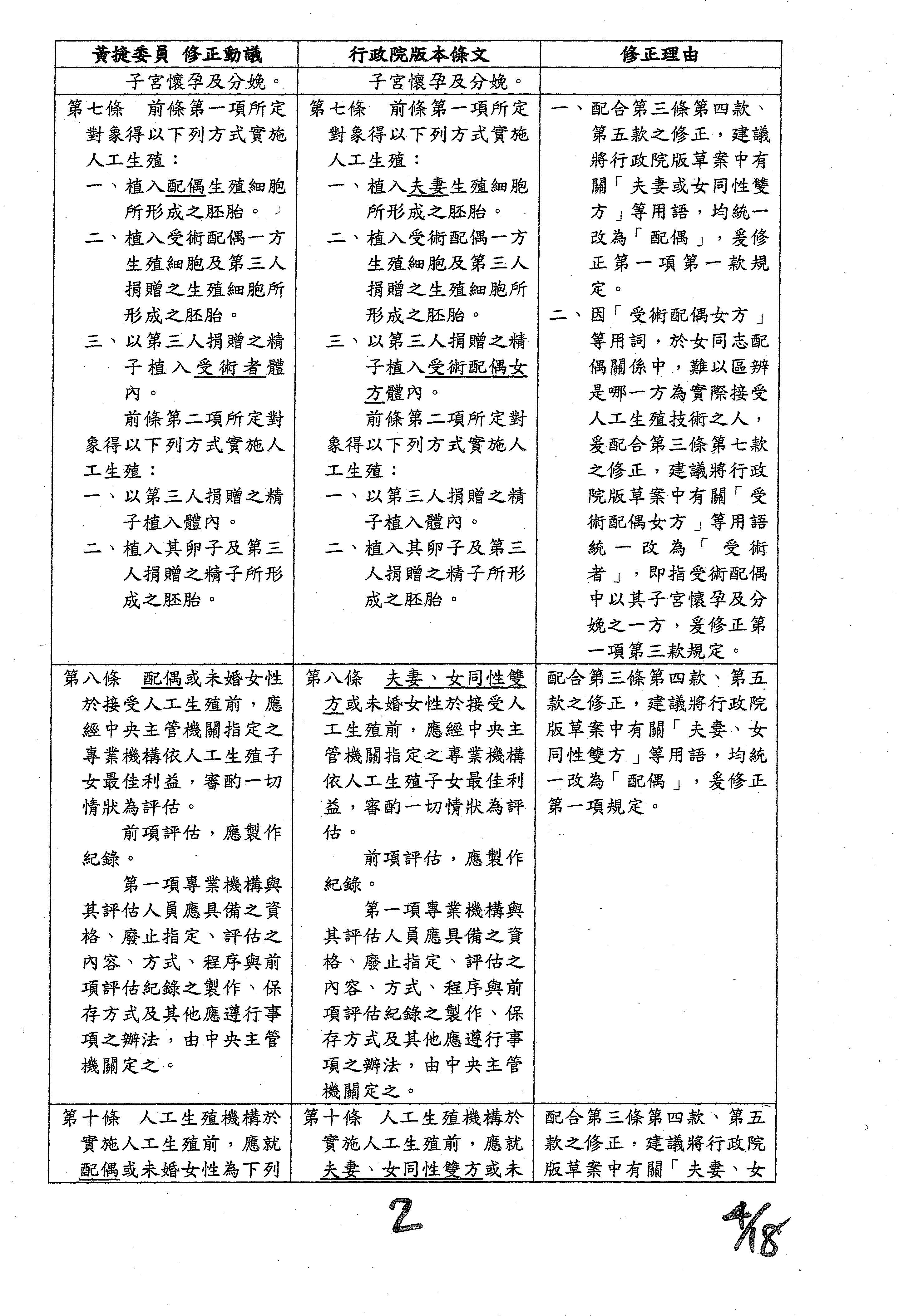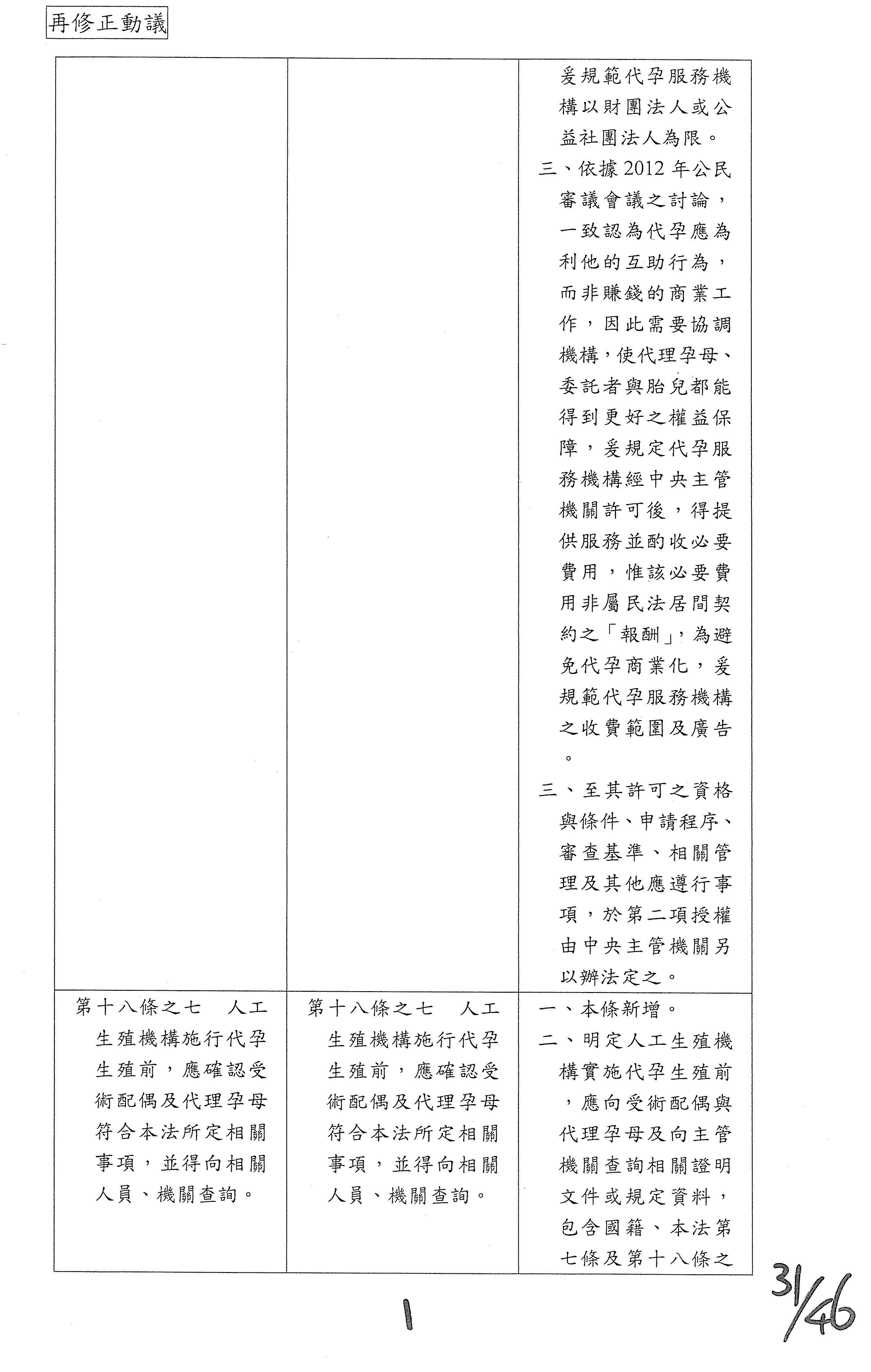 陳委員昭姿:因為我一直在看再修正動議,不好意思,我們一直在看,而且再修正動議都是取自2024年行政院版本的名詞。主席,如果有單條保留,單條後面是刪除的,但是這條還是得保留,因為我們還是主張要將代理孕母列入人工生殖法,謝謝。
