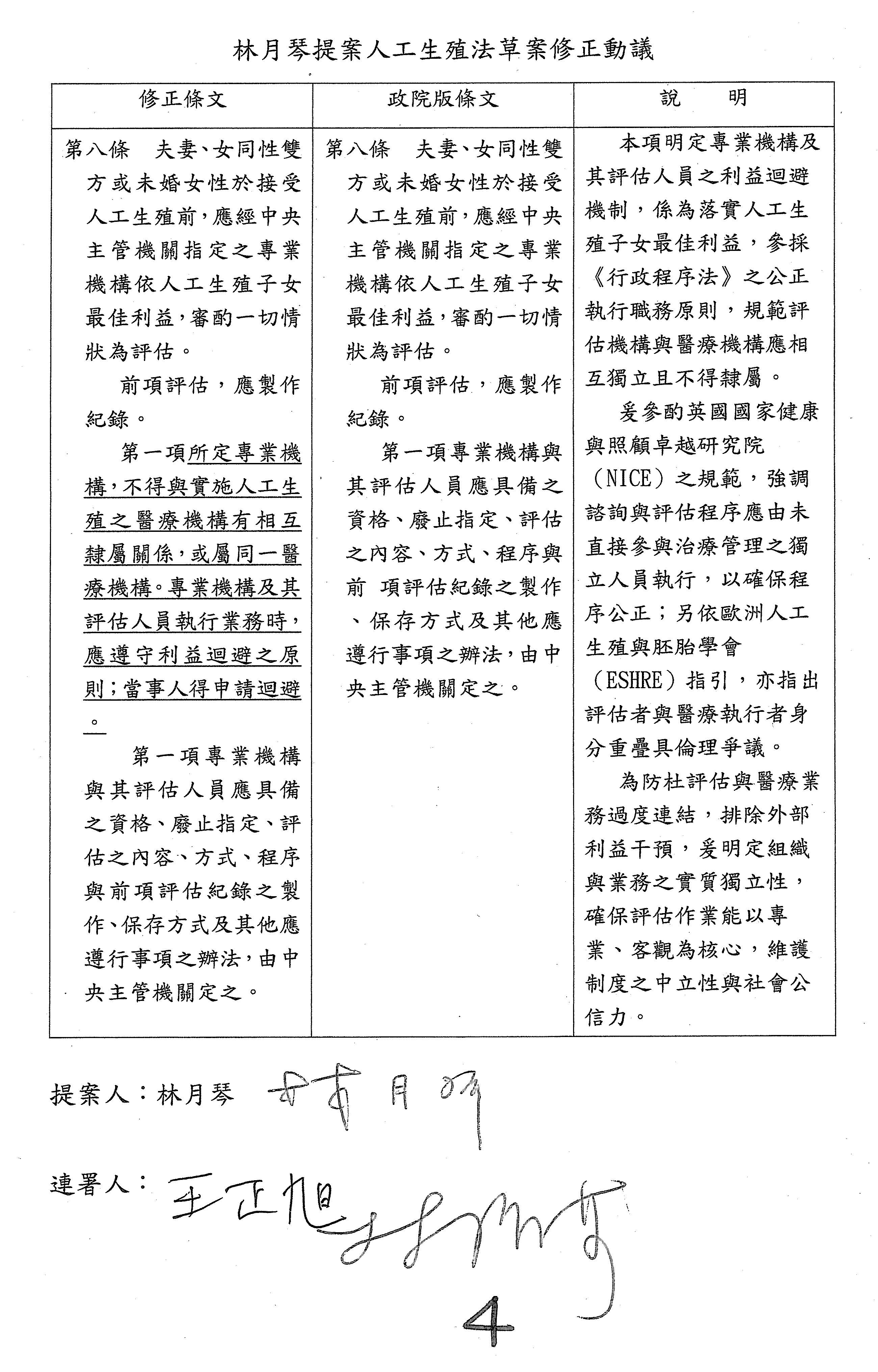(四)委員林宜瑾等19人擬具「人工生殖法部分條文修正草案」案。