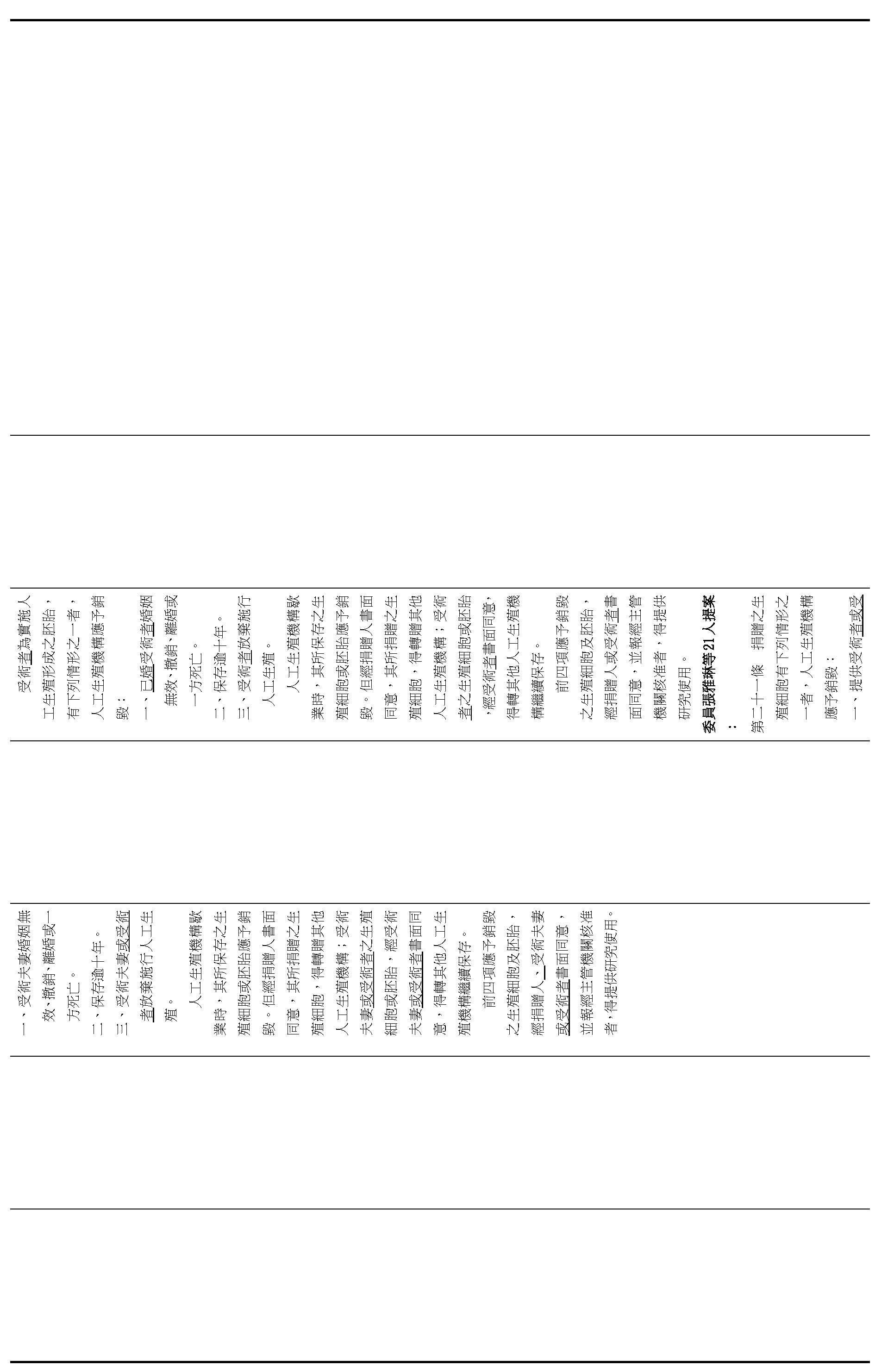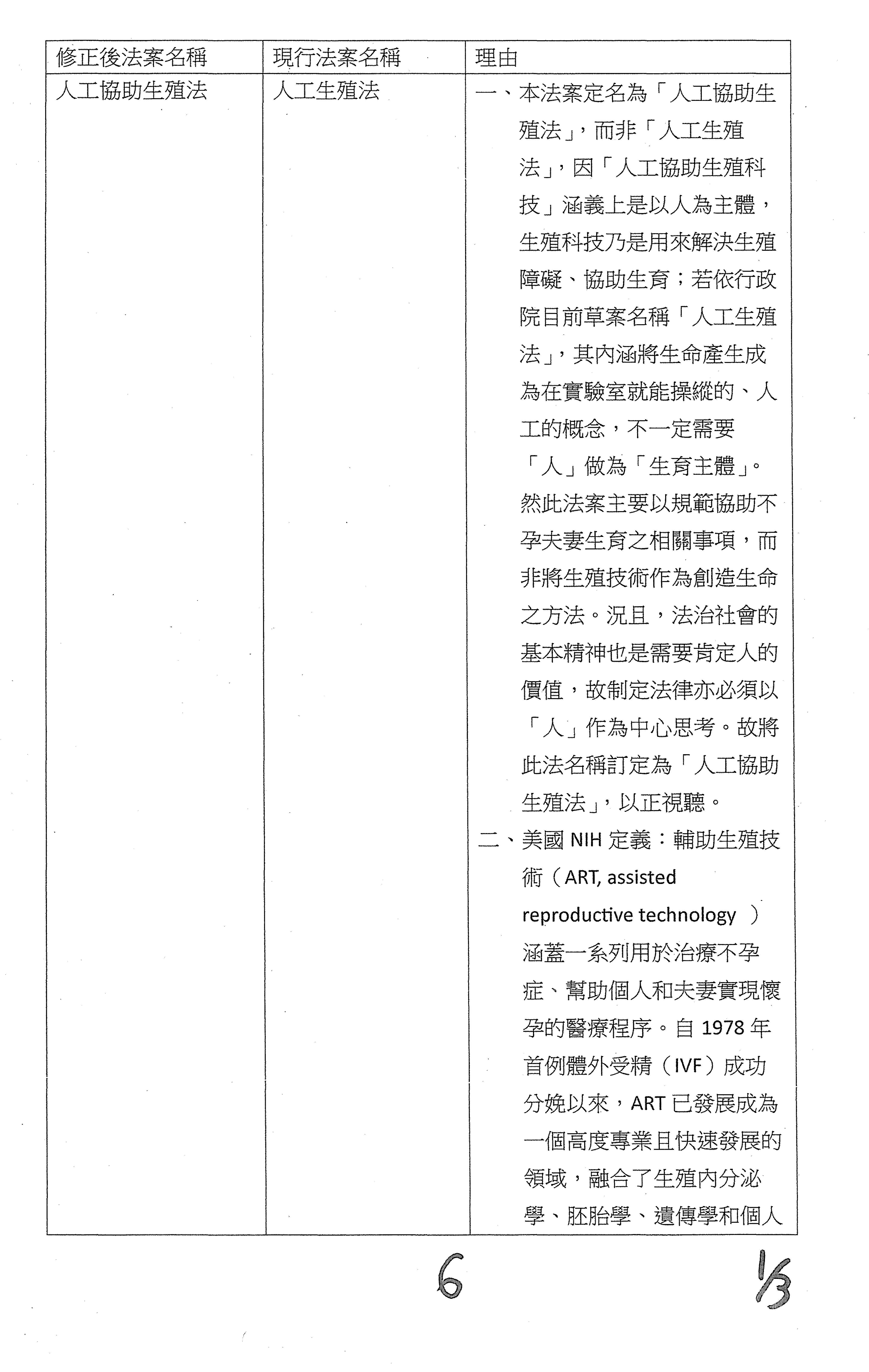 石部長崇良:行政院版本的話,建議就修正:「為健全人工生殖之發展,保障人工生殖子女、受術配偶、受術單身女性及捐贈人之權益,維護國民之倫理及健康,特制定本法。」