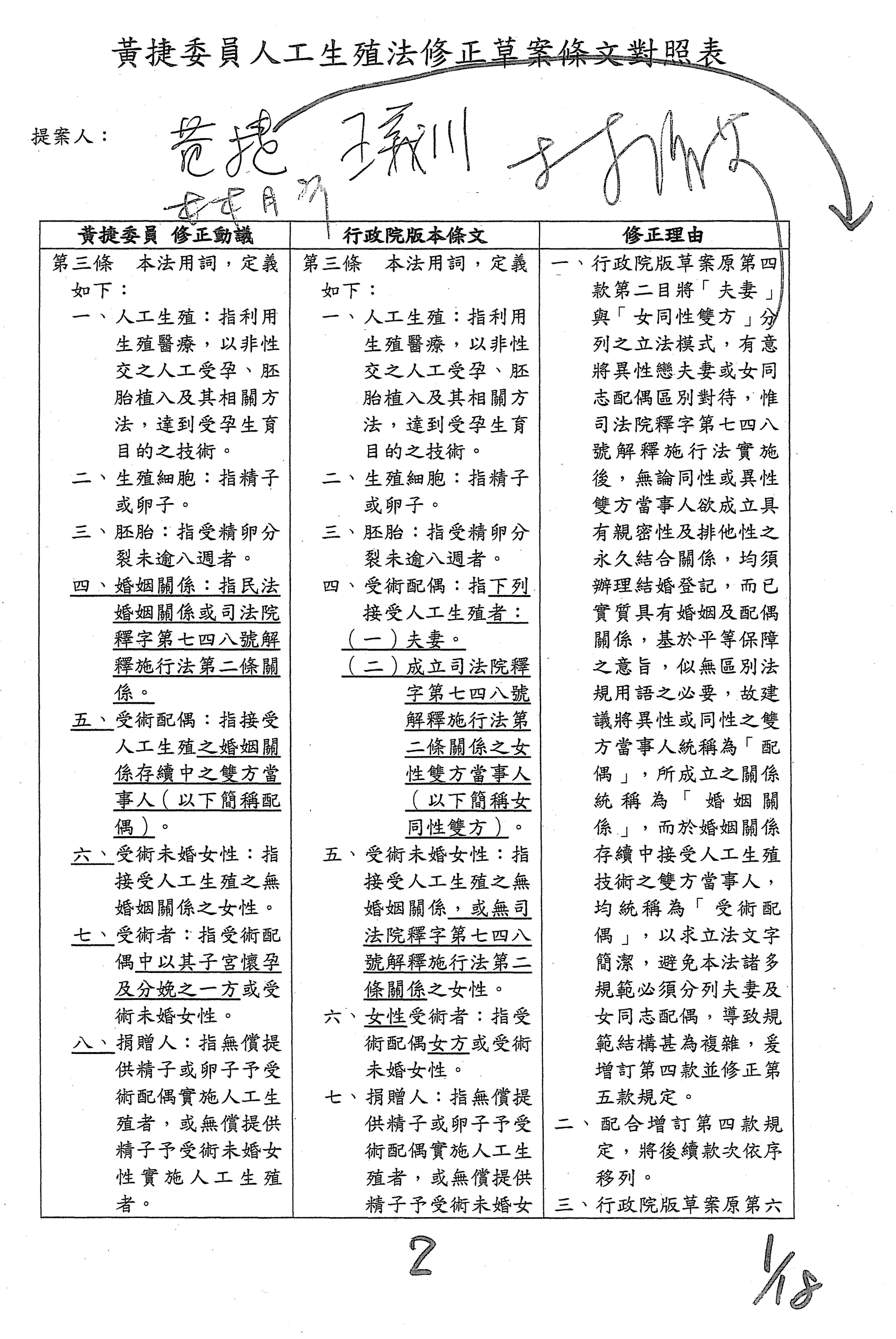 (三)委員黃捷等22人擬具「人工生殖法部分條文修正草案」案。