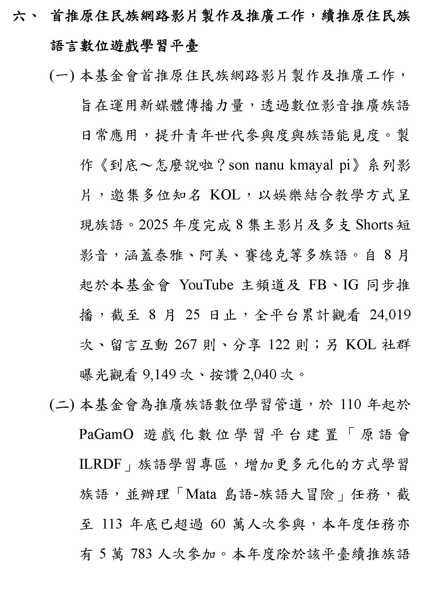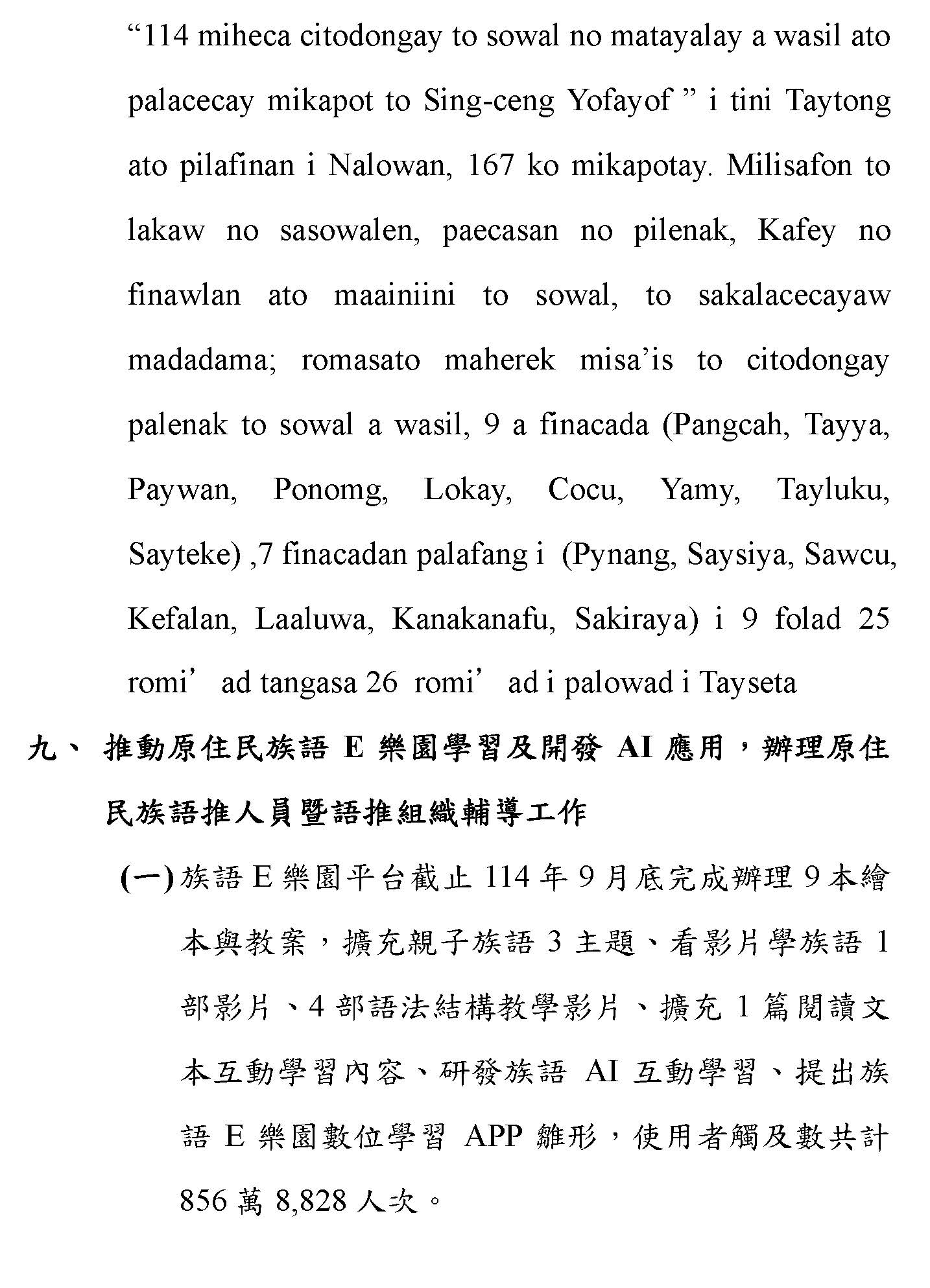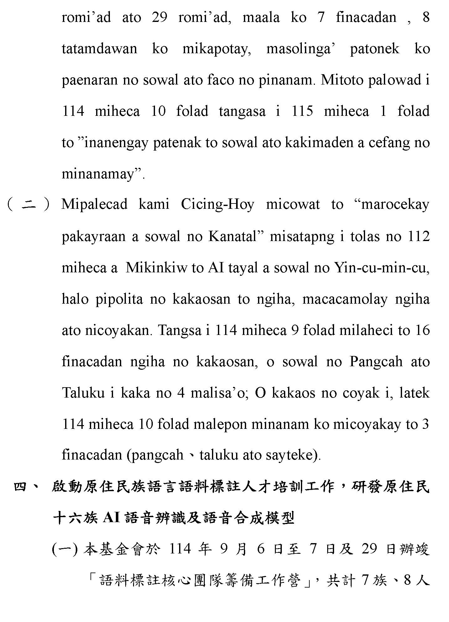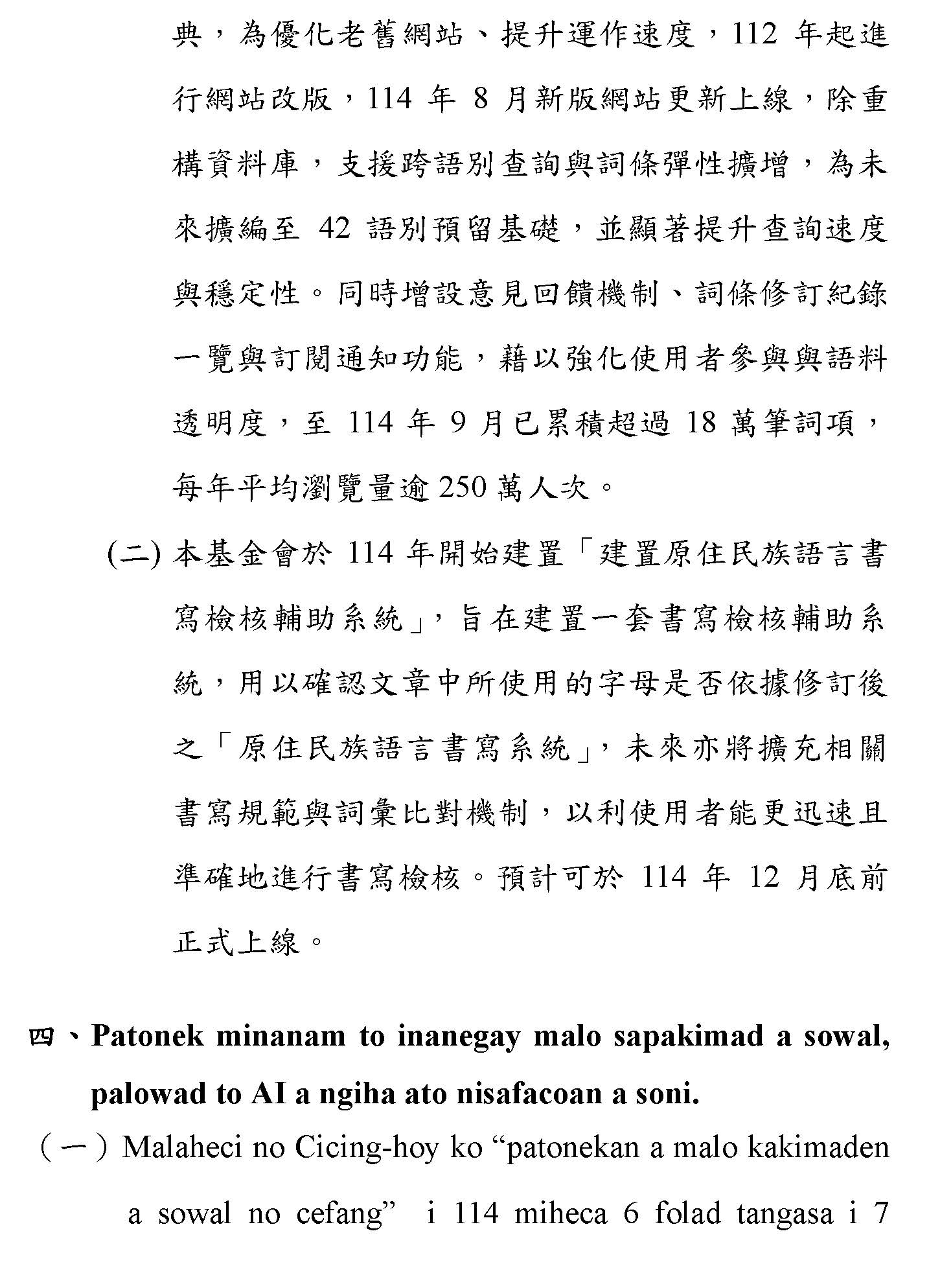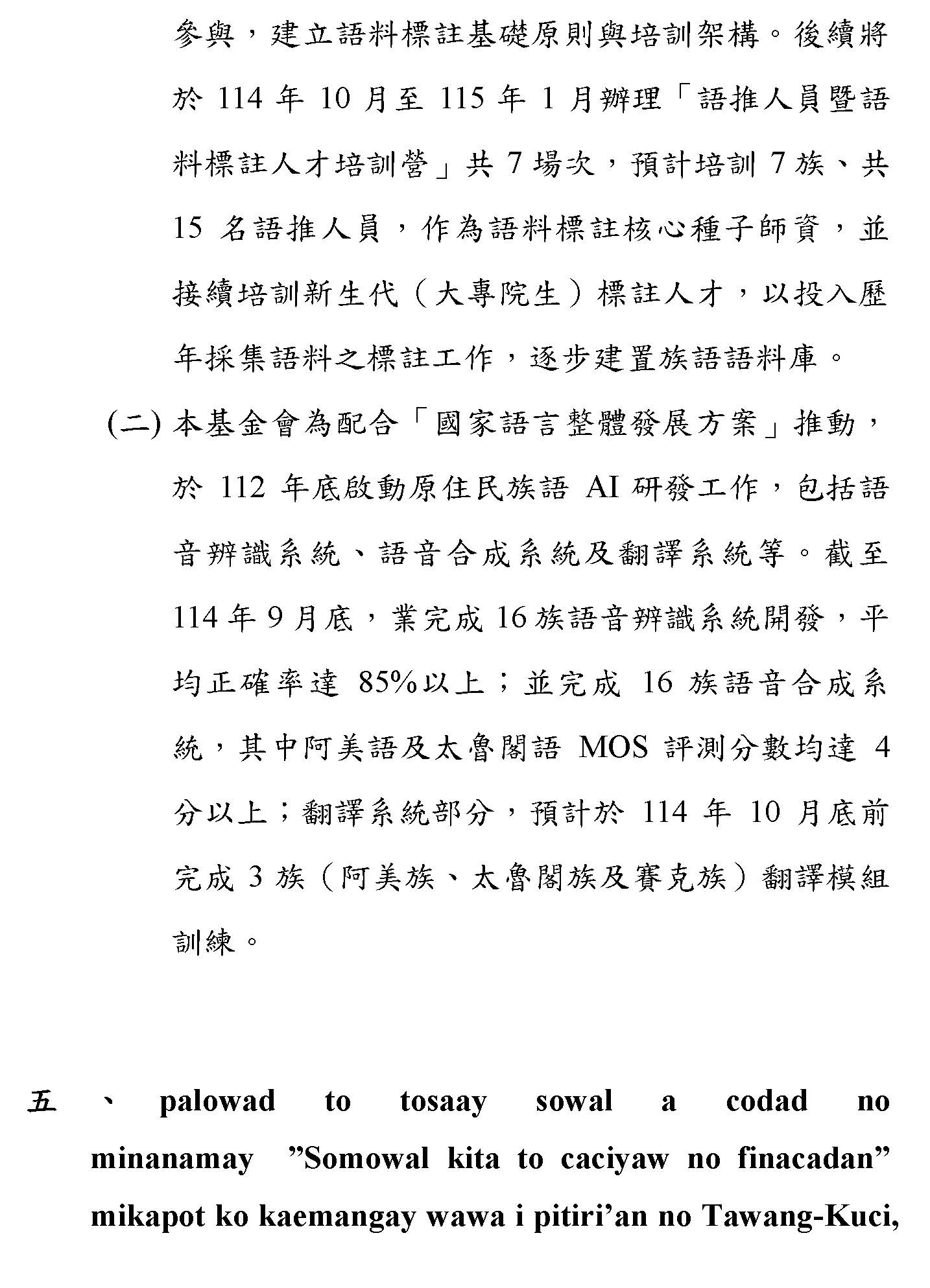 (一)根據財團法人原住民族語言研究發展基金會(下稱原語會)之業務報告,該會已於114年9月完成16族語音辨識系統開發(平均正確率達85%以上)及16族語音合成系統,且阿美語及太魯閣語之評測分數均達4分以上。另原語會115年度預算亦編列520萬元用於「研發族語人工智慧AI應用」。顯示族語AI核心技術已具備基礎,現階段關鍵在於如何將「實驗室技術」轉化為「部落生活應用」。