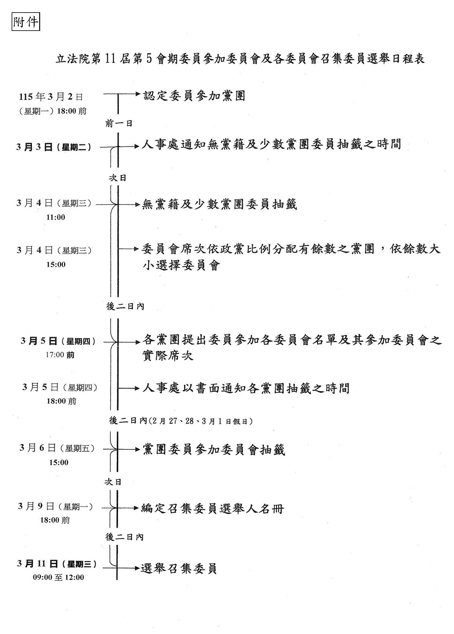 四、本(第5)會期委員參加委員會及各委員會召集委員之選舉,不受本院組織法、各委員會組織法及其相關授權規定之限制,各委員會召集委員選舉,定於3月11日(星期三)舉行,其日程表如附件。