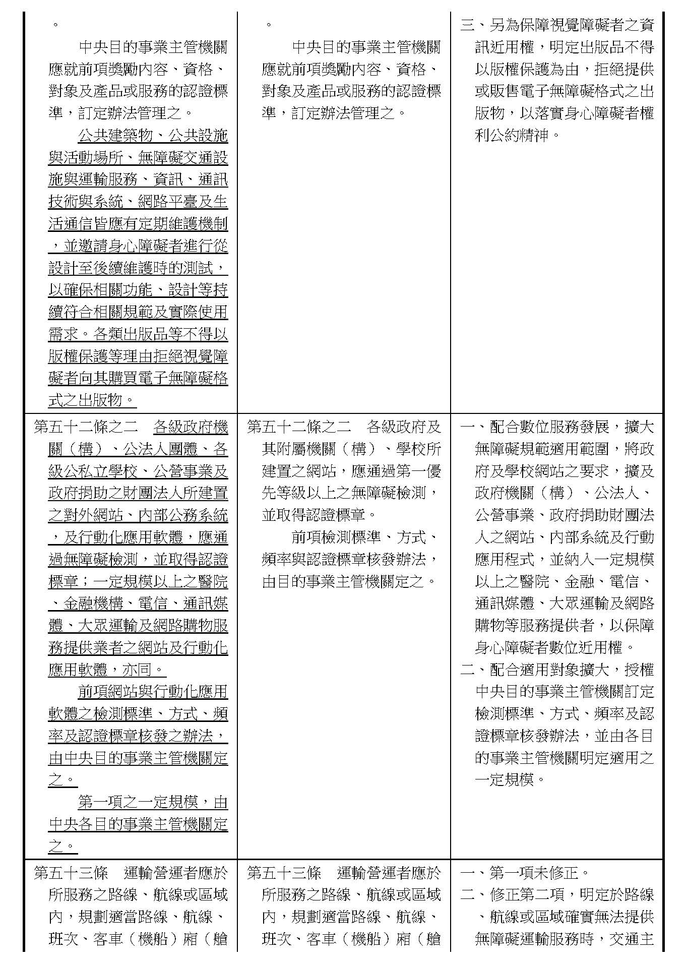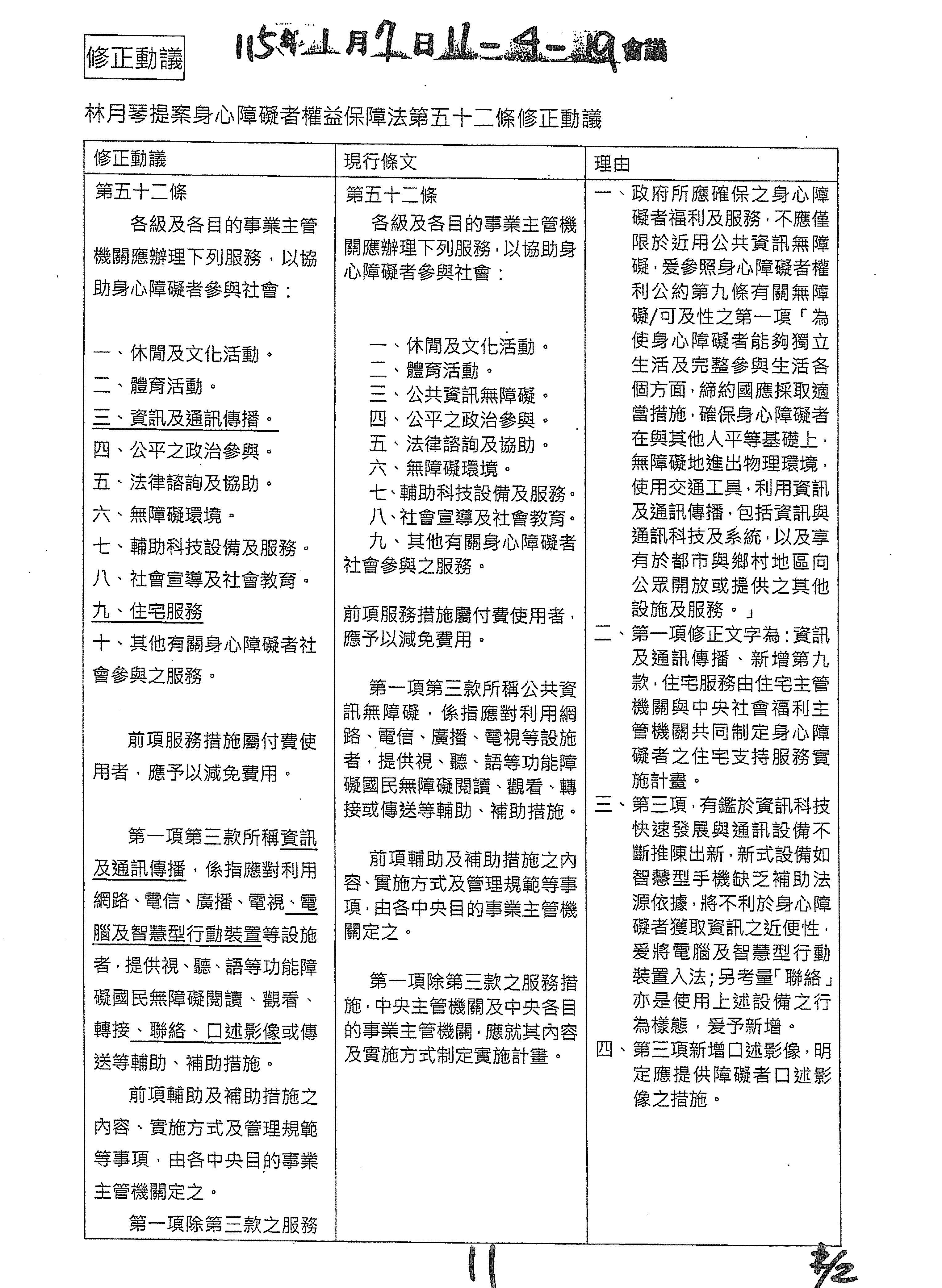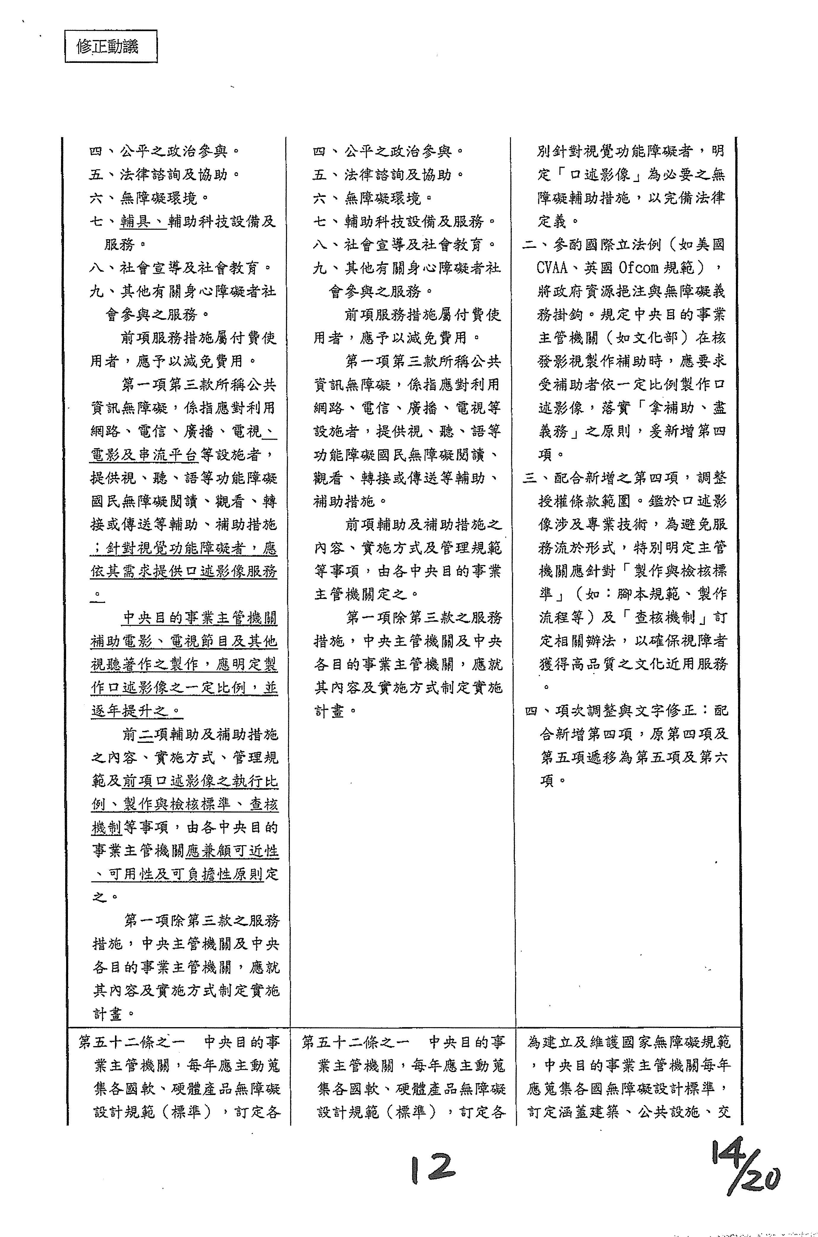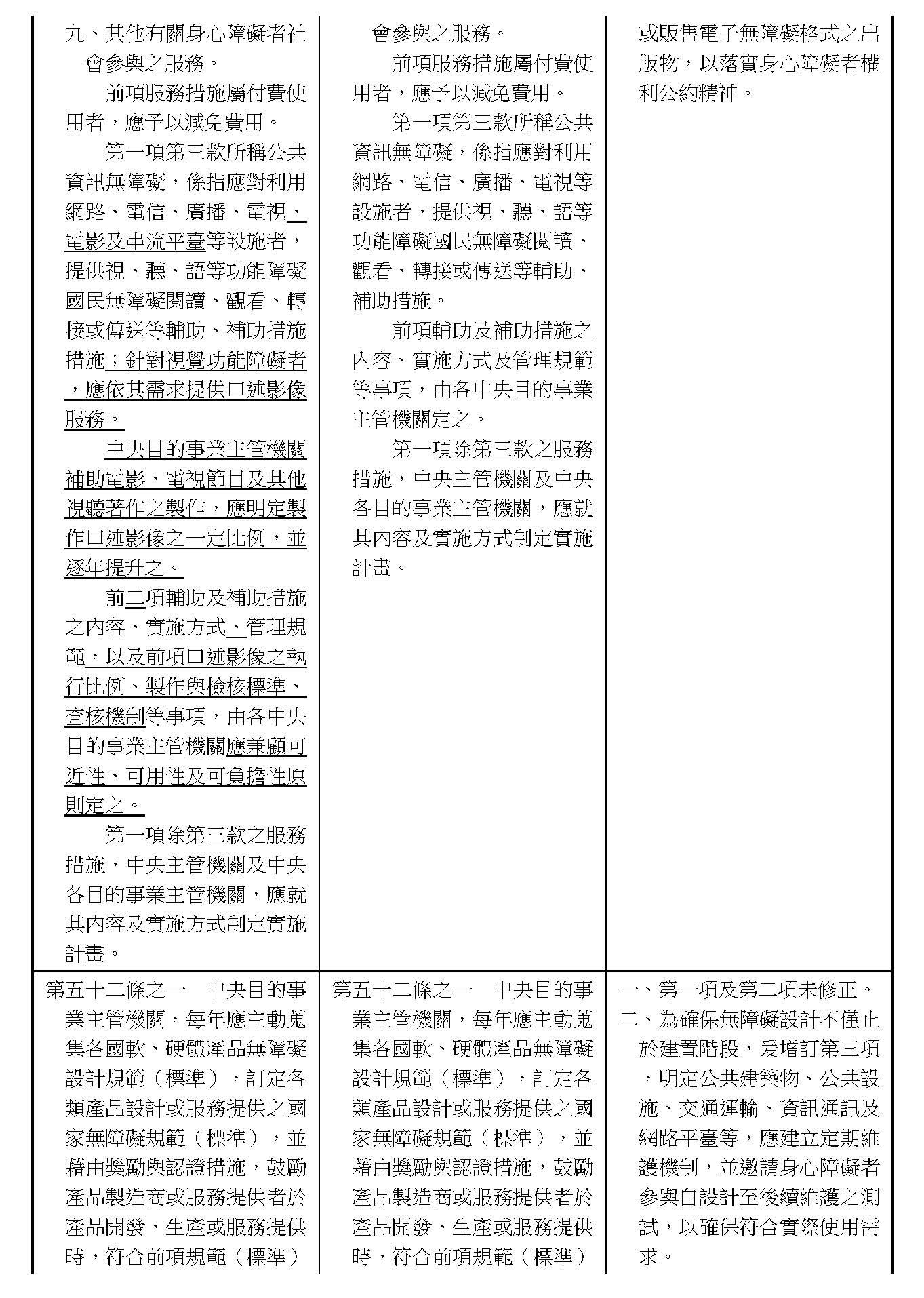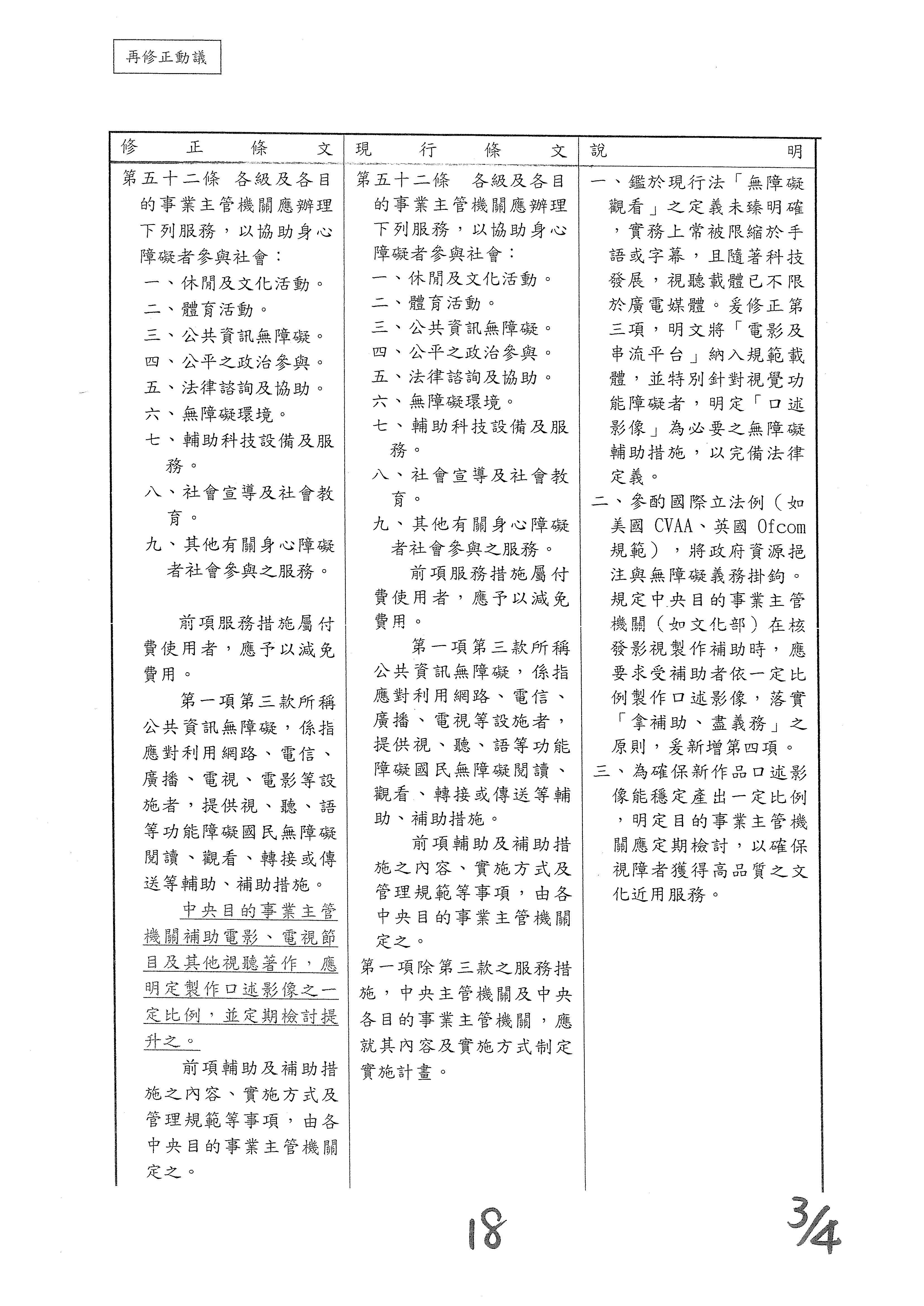 周署長道君:這個部分,行政院版是沒有提案。各委員的版本,主要都是針對資訊通訊或無障礙運輸,大概對於服務內容的近用部分,都有一些相關的提議。比較需要注意的地方,在范雲委員、郭昱晴委員的版本都表示希望把口述影像的部分納進來,召委的版本也有一個相關的動議,要把口述影像的部分納進來,我們參採了幾位委員的提案有一個建議的文字,現在也有投影在螢幕上,主要是第五十二條第三項開始,我們有增列一些文字,我宣讀一下:「第一項第三款所稱公共資訊無障礙,係指應對利用網路、電信、廣播、電視、電影等設施者,提供視、聽、語等功能障礙國民無障礙閱讀、觀看、轉接或傳送等輔助、補助措施」,底下增列一項「中央目的事業主管機關補助電影、電視節目及其他視聽著作之製作,應鼓勵製作口述影像」,因為有增加一項的關係,所以原來是前一項就變成「前二項輔助及補助措施之內容,實施方式及管理規範等事項,由各中央目的事業主管機關定之」。最後一項的部分同現行條文。以上。