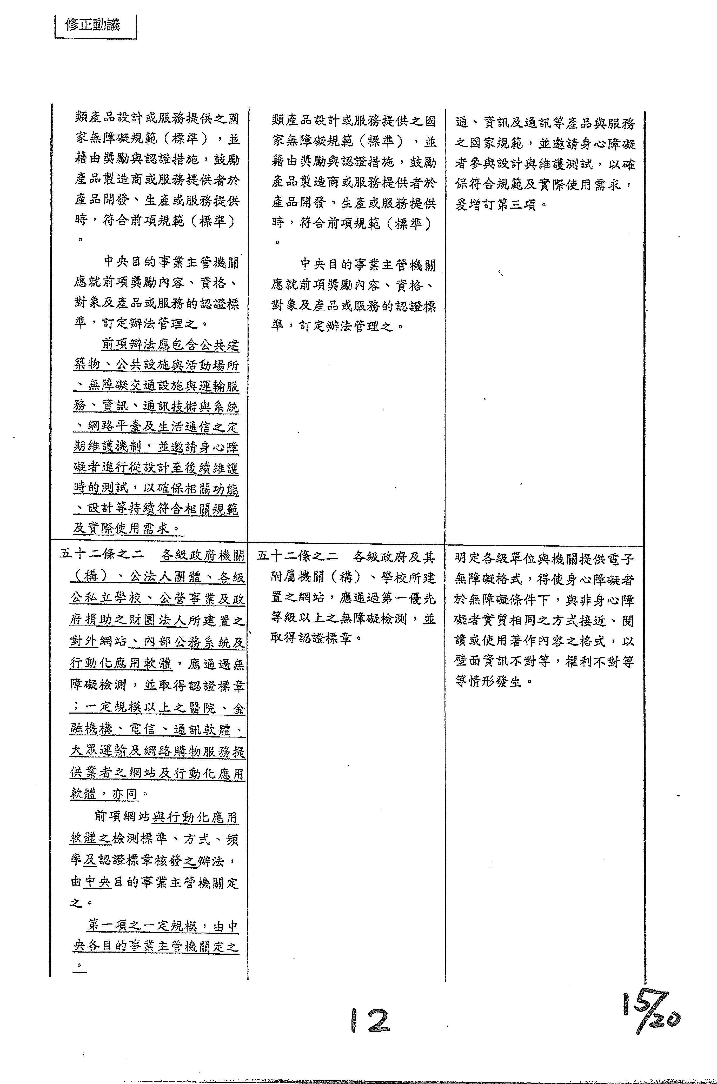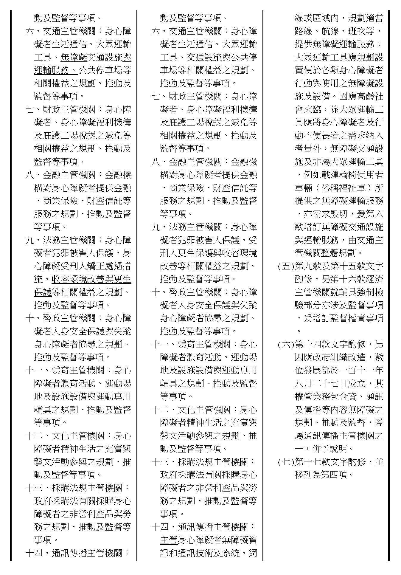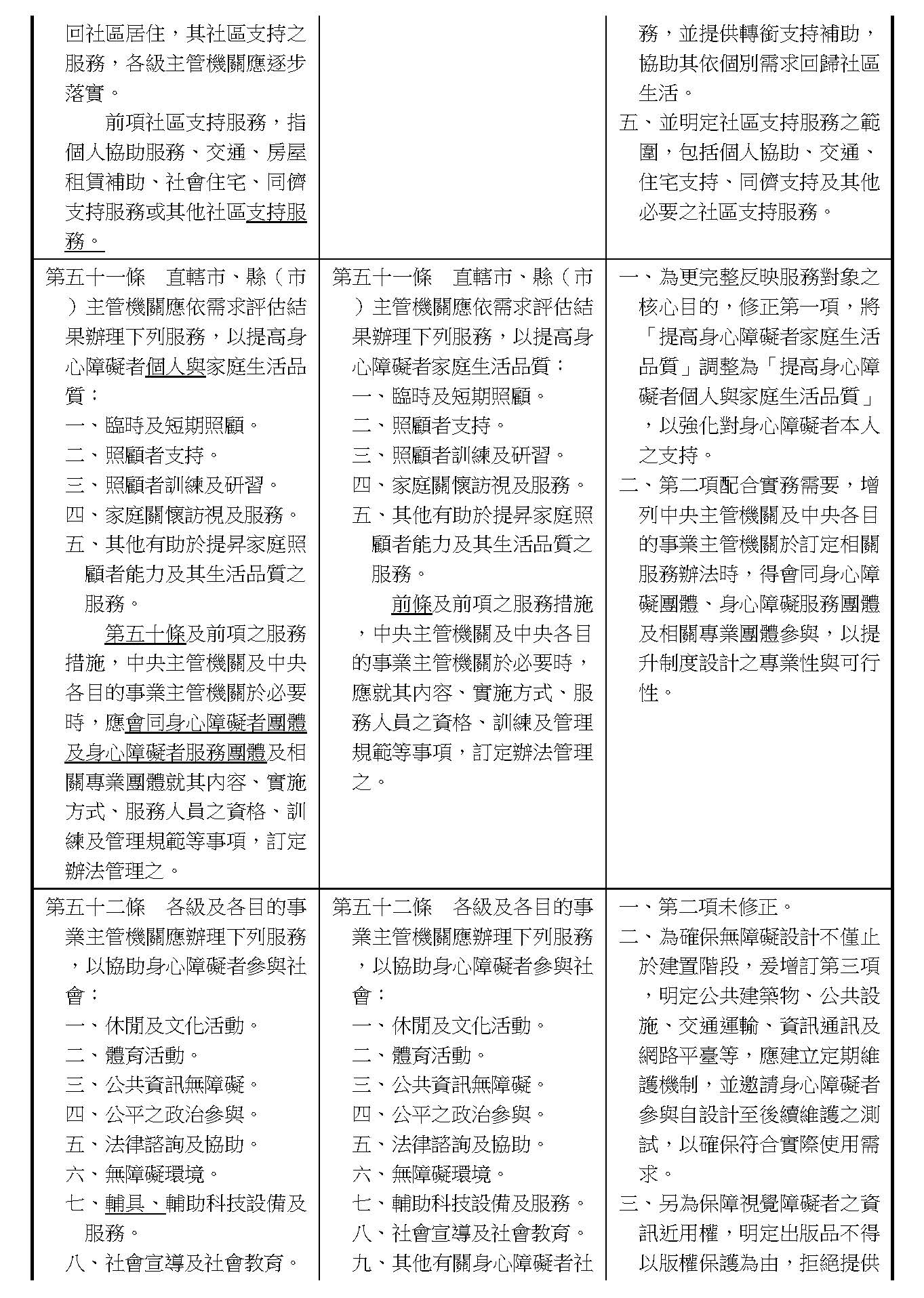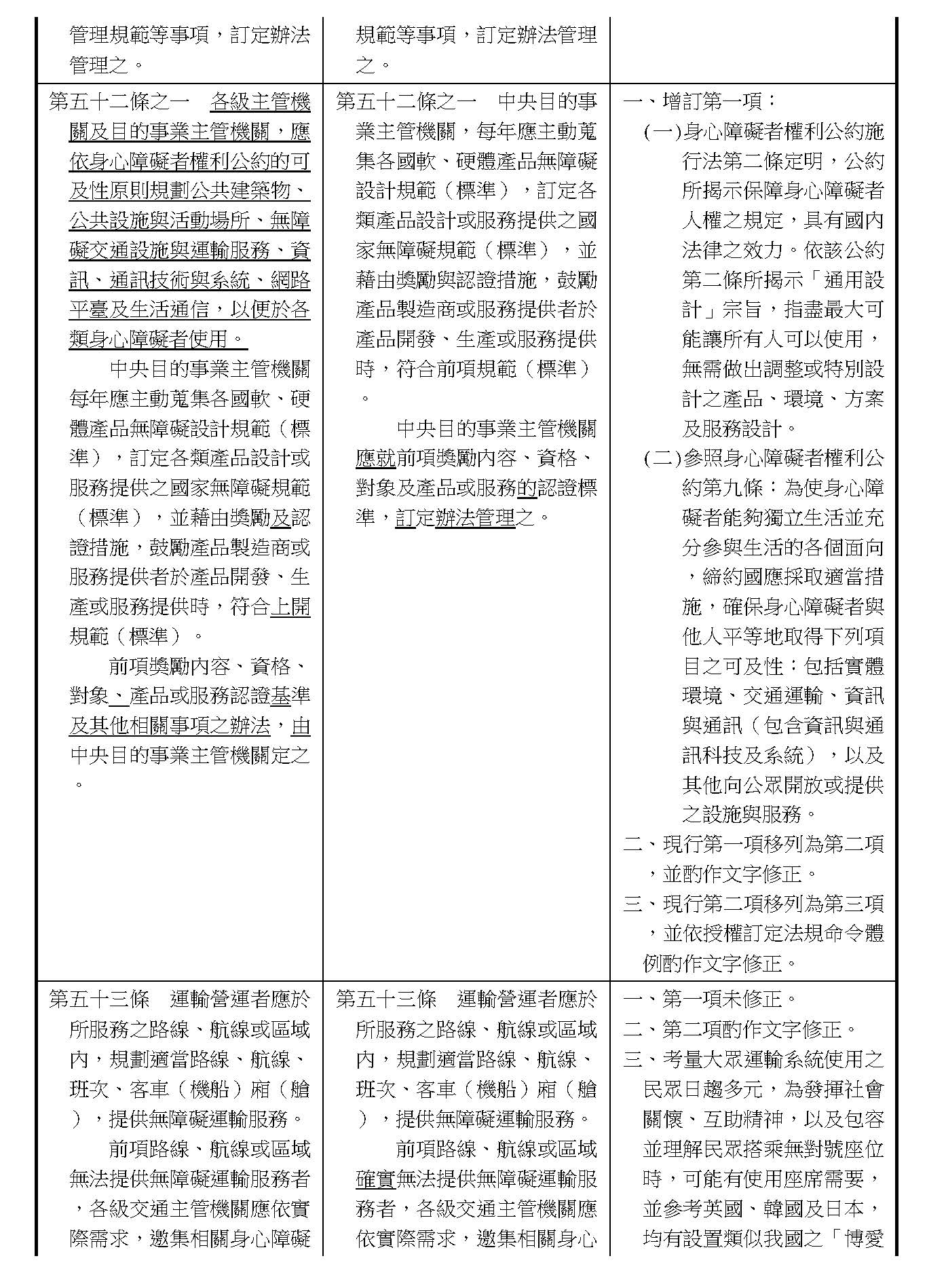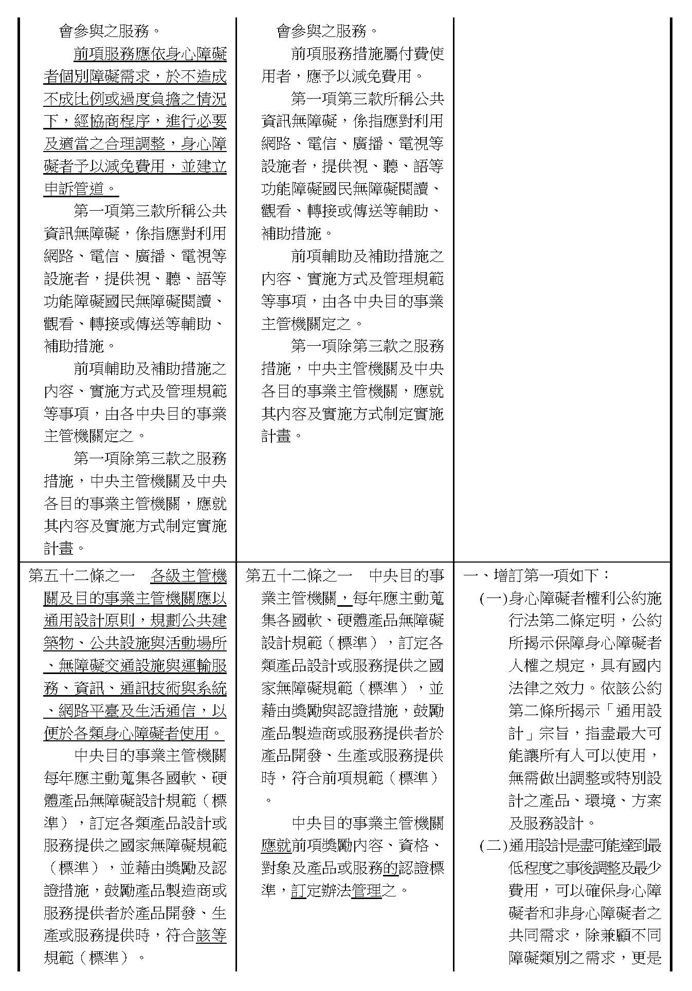 周署長道君:這個部分,行政院版是沒有提案。各委員的版本,主要都是針對資訊通訊或無障礙運輸,大概對於服務內容的近用部分,都有一些相關的提議。比較需要注意的地方,在范雲委員、郭昱晴委員的版本都表示希望把口述影像的部分納進來,召委的版本也有一個相關的動議,要把口述影像的部分納進來,我們參採了幾位委員的提案有一個建議的文字,現在也有投影在螢幕上,主要是第五十二條第三項開始,我們有增列一些文字,我宣讀一下:「第一項第三款所稱公共資訊無障礙,係指應對利用網路、電信、廣播、電視、電影等設施者,提供視、聽、語等功能障礙國民無障礙閱讀、觀看、轉接或傳送等輔助、補助措施」,底下增列一項「中央目的事業主管機關補助電影、電視節目及其他視聽著作之製作,應鼓勵製作口述影像」,因為有增加一項的關係,所以原來是前一項就變成「前二項輔助及補助措施之內容,實施方式及管理規範等事項,由各中央目的事業主管機關定之」。最後一項的部分同現行條文。以上。