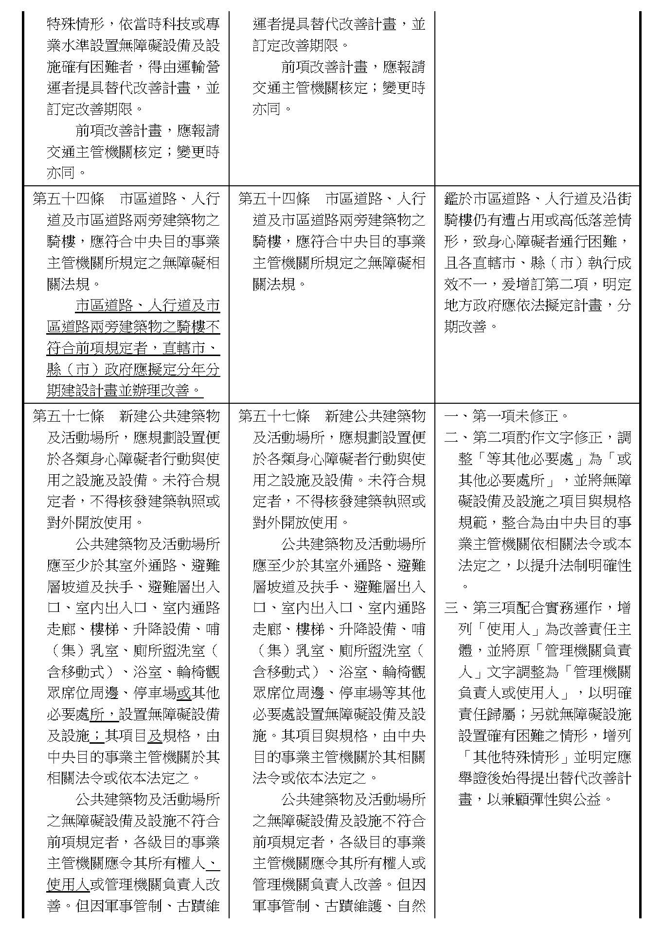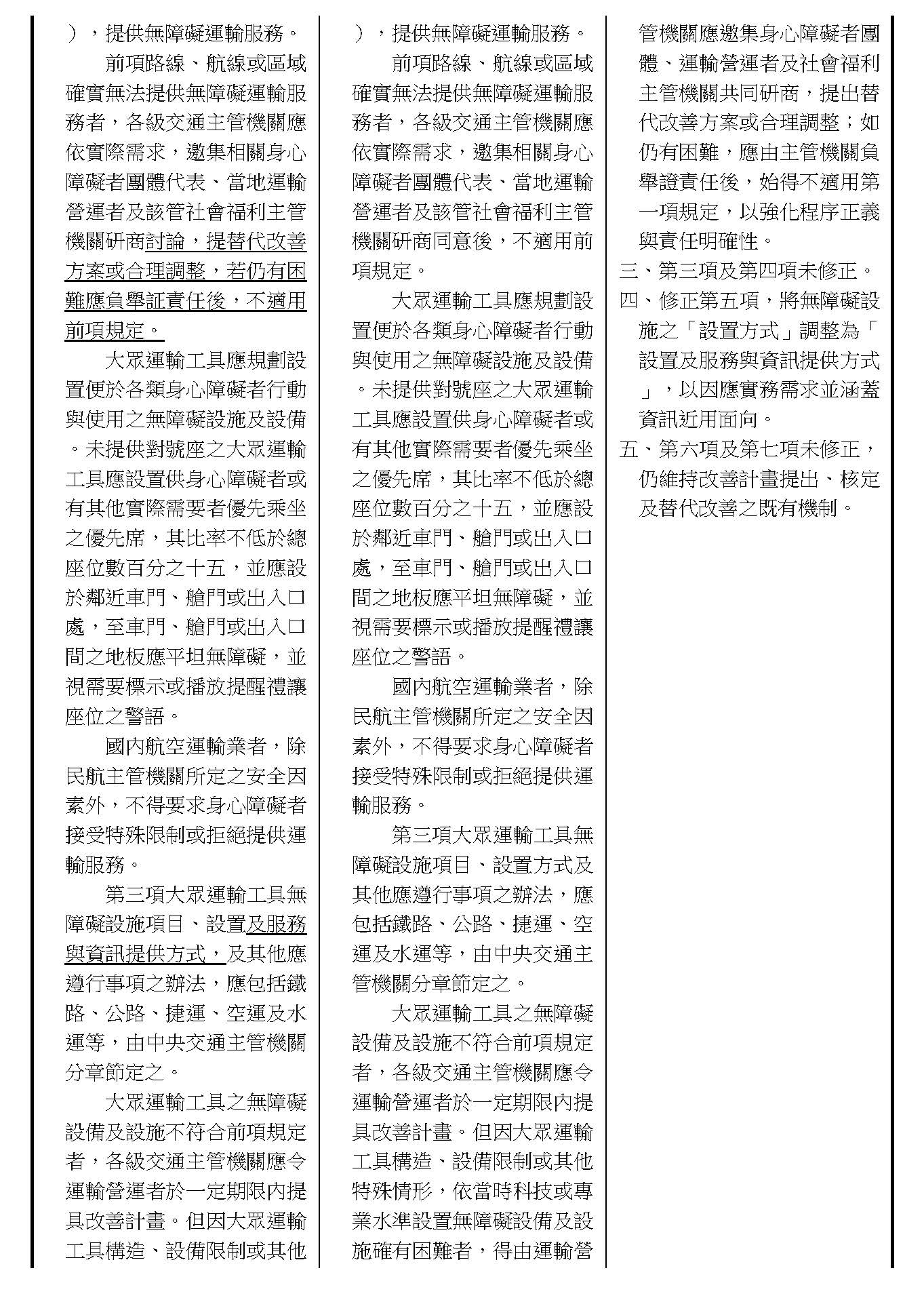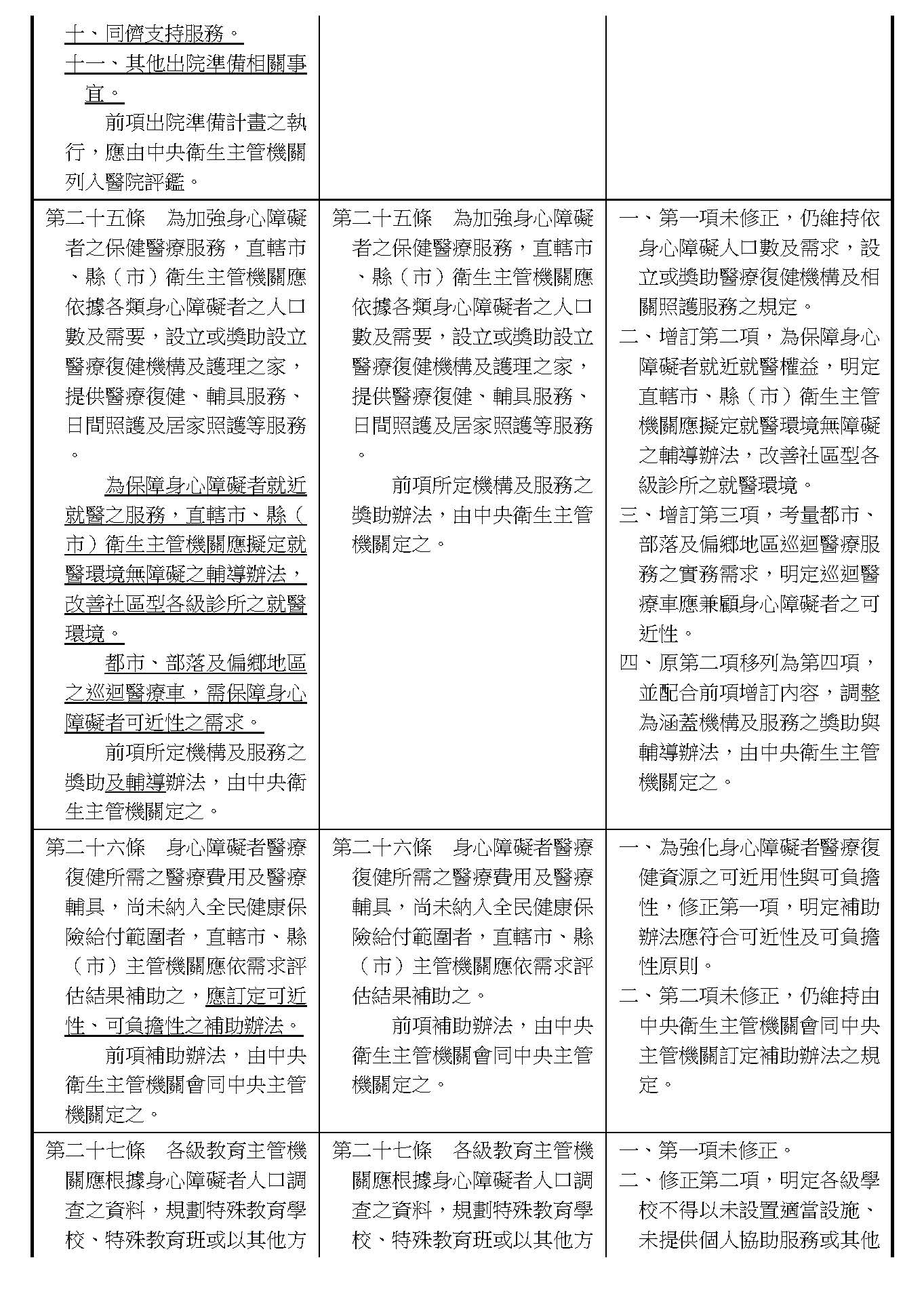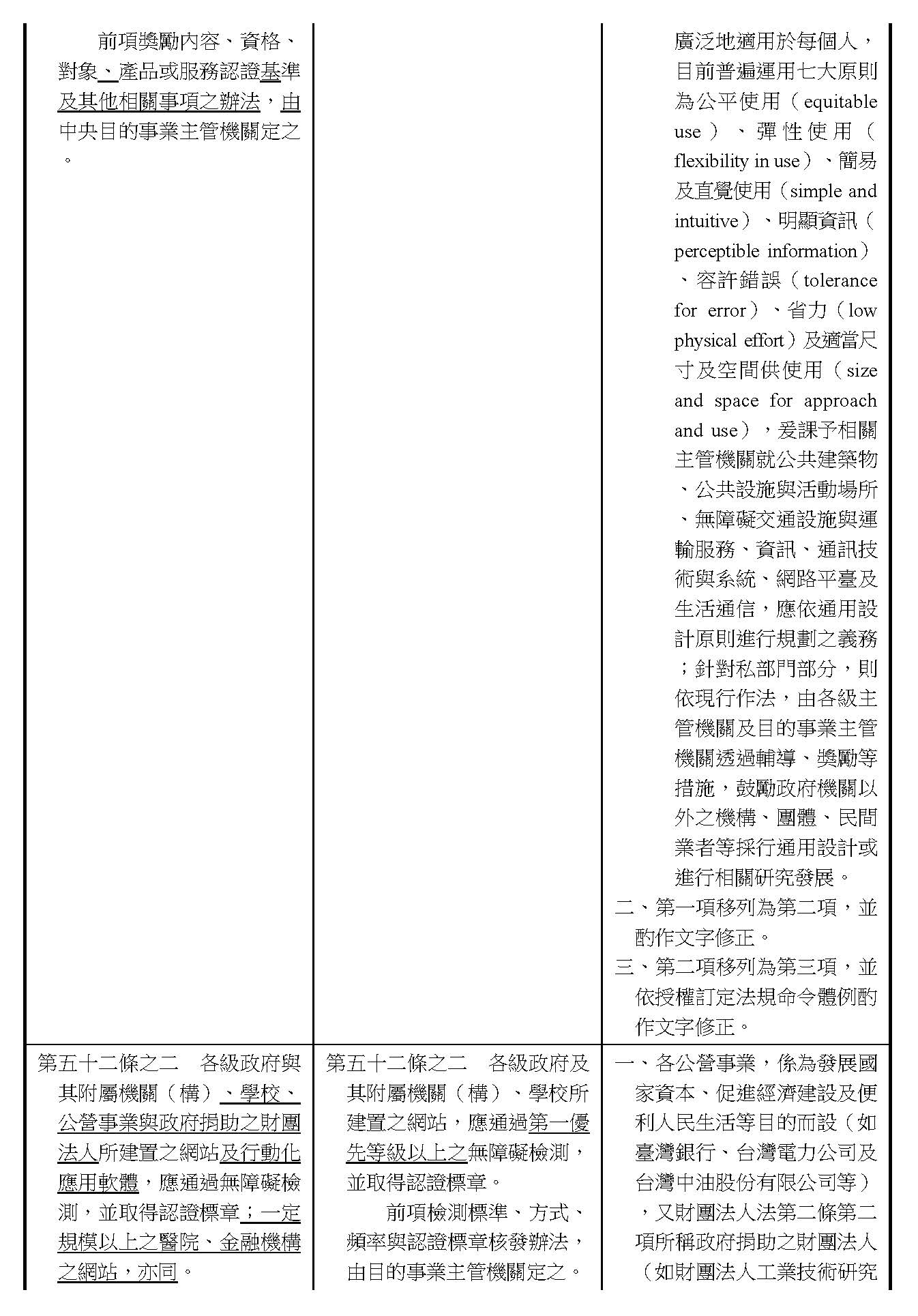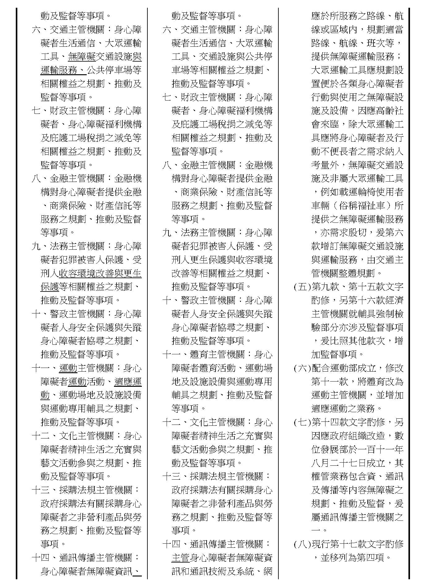 周署長道君:這個部分,行政院版是沒有提案。各委員的版本,主要都是針對資訊通訊或無障礙運輸,大概對於服務內容的近用部分,都有一些相關的提議。比較需要注意的地方,在范雲委員、郭昱晴委員的版本都表示希望把口述影像的部分納進來,召委的版本也有一個相關的動議,要把口述影像的部分納進來,我們參採了幾位委員的提案有一個建議的文字,現在也有投影在螢幕上,主要是第五十二條第三項開始,我們有增列一些文字,我宣讀一下:「第一項第三款所稱公共資訊無障礙,係指應對利用網路、電信、廣播、電視、電影等設施者,提供視、聽、語等功能障礙國民無障礙閱讀、觀看、轉接或傳送等輔助、補助措施」,底下增列一項「中央目的事業主管機關補助電影、電視節目及其他視聽著作之製作,應鼓勵製作口述影像」,因為有增加一項的關係,所以原來是前一項就變成「前二項輔助及補助措施之內容,實施方式及管理規範等事項,由各中央目的事業主管機關定之」。最後一項的部分同現行條文。以上。
