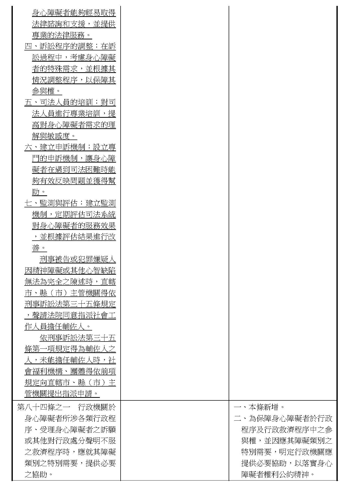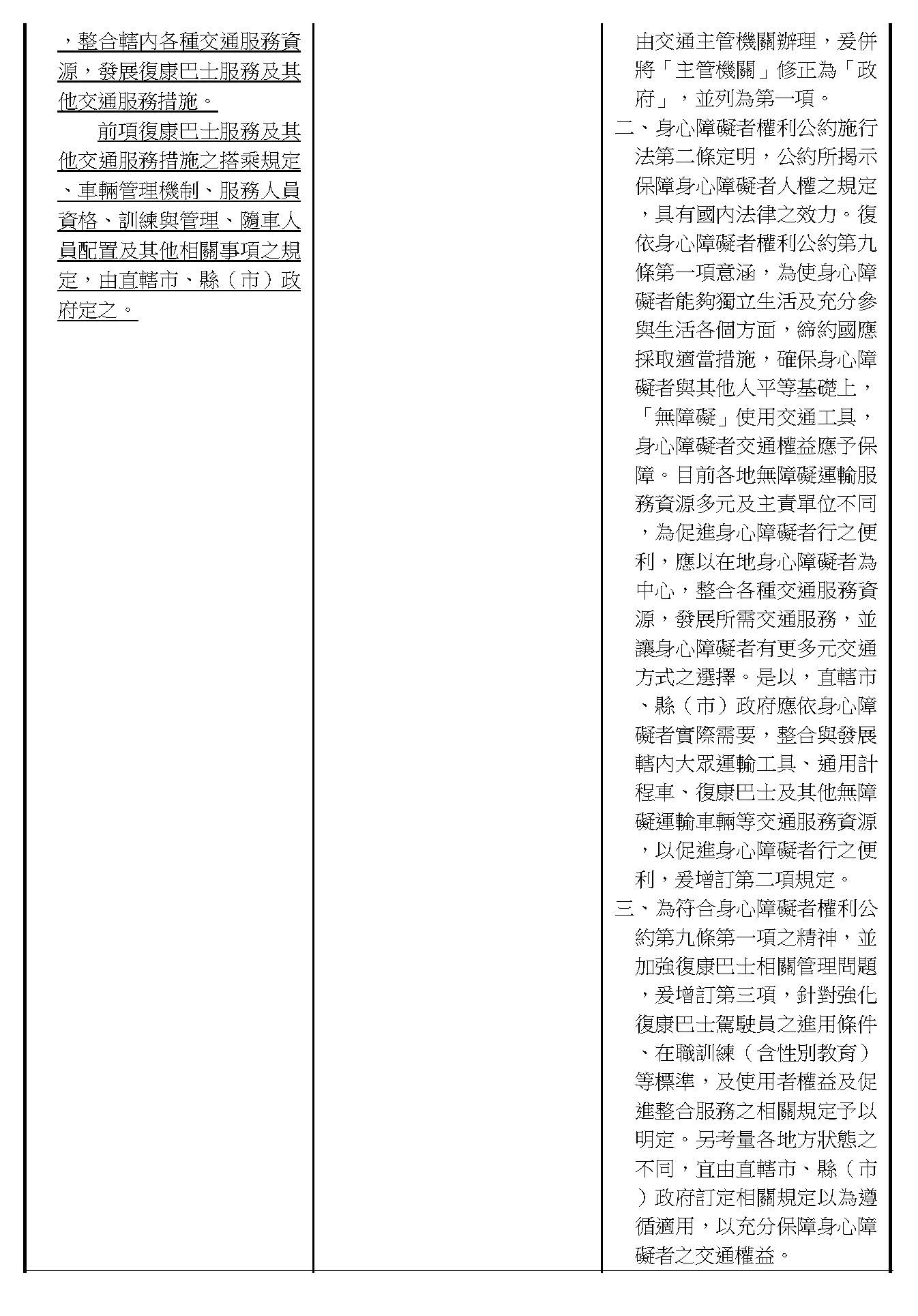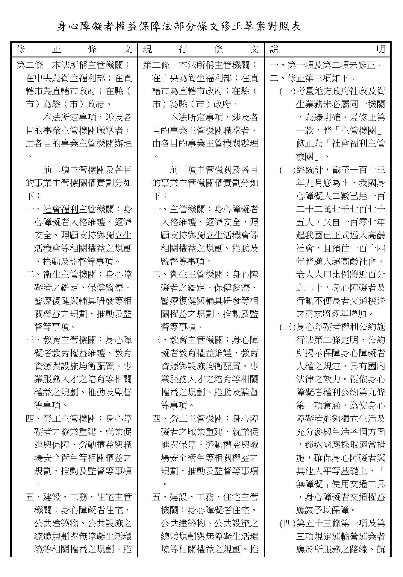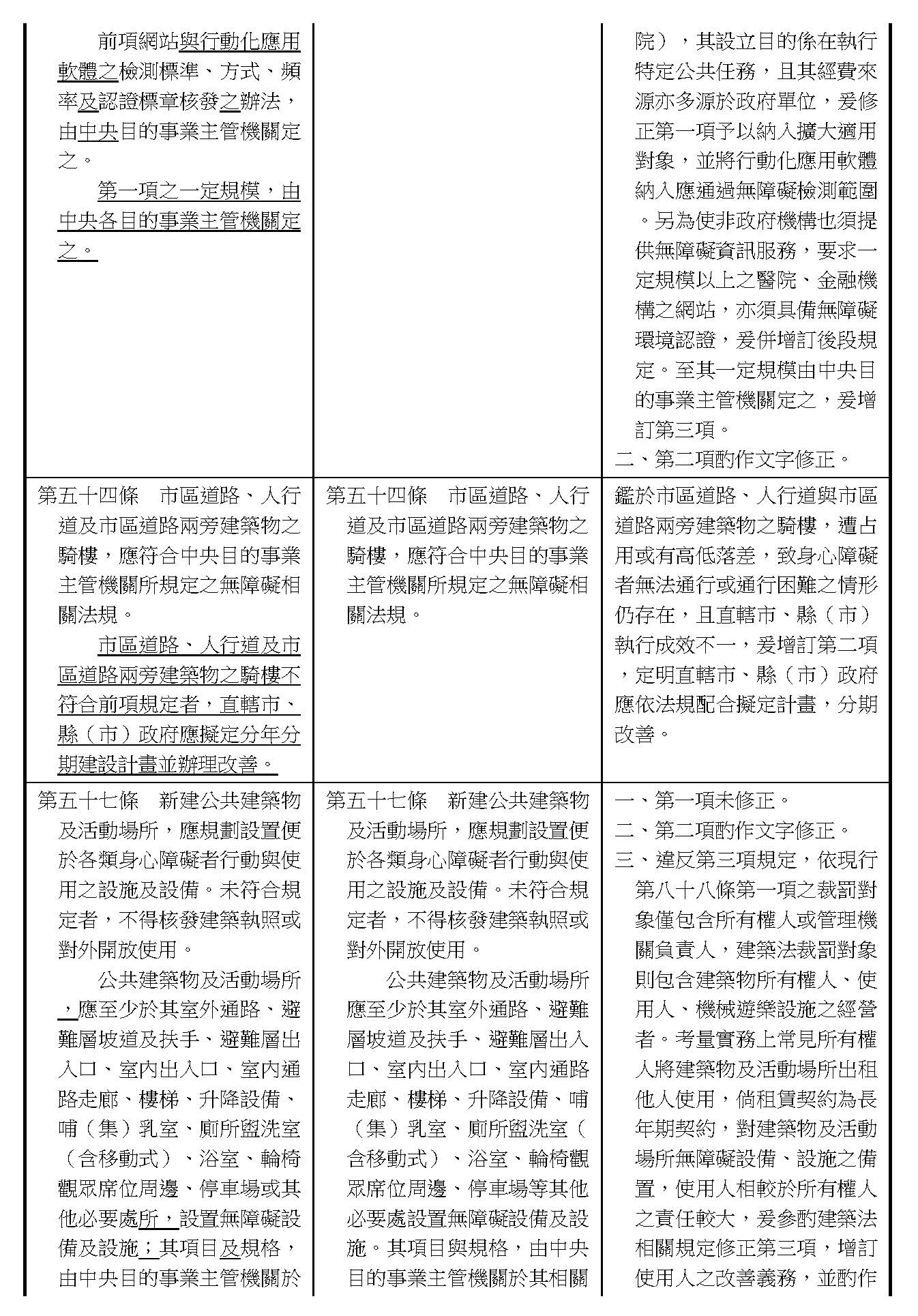 周署長道君:這個部分,行政院版是沒有提案。各委員的版本,主要都是針對資訊通訊或無障礙運輸,大概對於服務內容的近用部分,都有一些相關的提議。比較需要注意的地方,在范雲委員、郭昱晴委員的版本都表示希望把口述影像的部分納進來,召委的版本也有一個相關的動議,要把口述影像的部分納進來,我們參採了幾位委員的提案有一個建議的文字,現在也有投影在螢幕上,主要是第五十二條第三項開始,我們有增列一些文字,我宣讀一下:「第一項第三款所稱公共資訊無障礙,係指應對利用網路、電信、廣播、電視、電影等設施者,提供視、聽、語等功能障礙國民無障礙閱讀、觀看、轉接或傳送等輔助、補助措施」,底下增列一項「中央目的事業主管機關補助電影、電視節目及其他視聽著作之製作,應鼓勵製作口述影像」,因為有增加一項的關係,所以原來是前一項就變成「前二項輔助及補助措施之內容,實施方式及管理規範等事項,由各中央目的事業主管機關定之」。最後一項的部分同現行條文。以上。