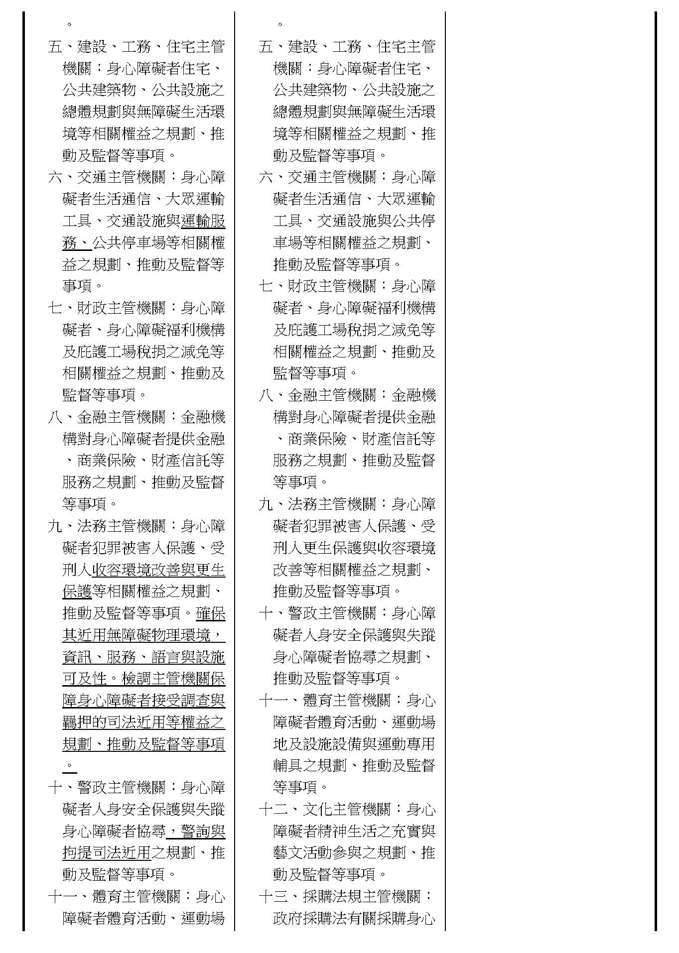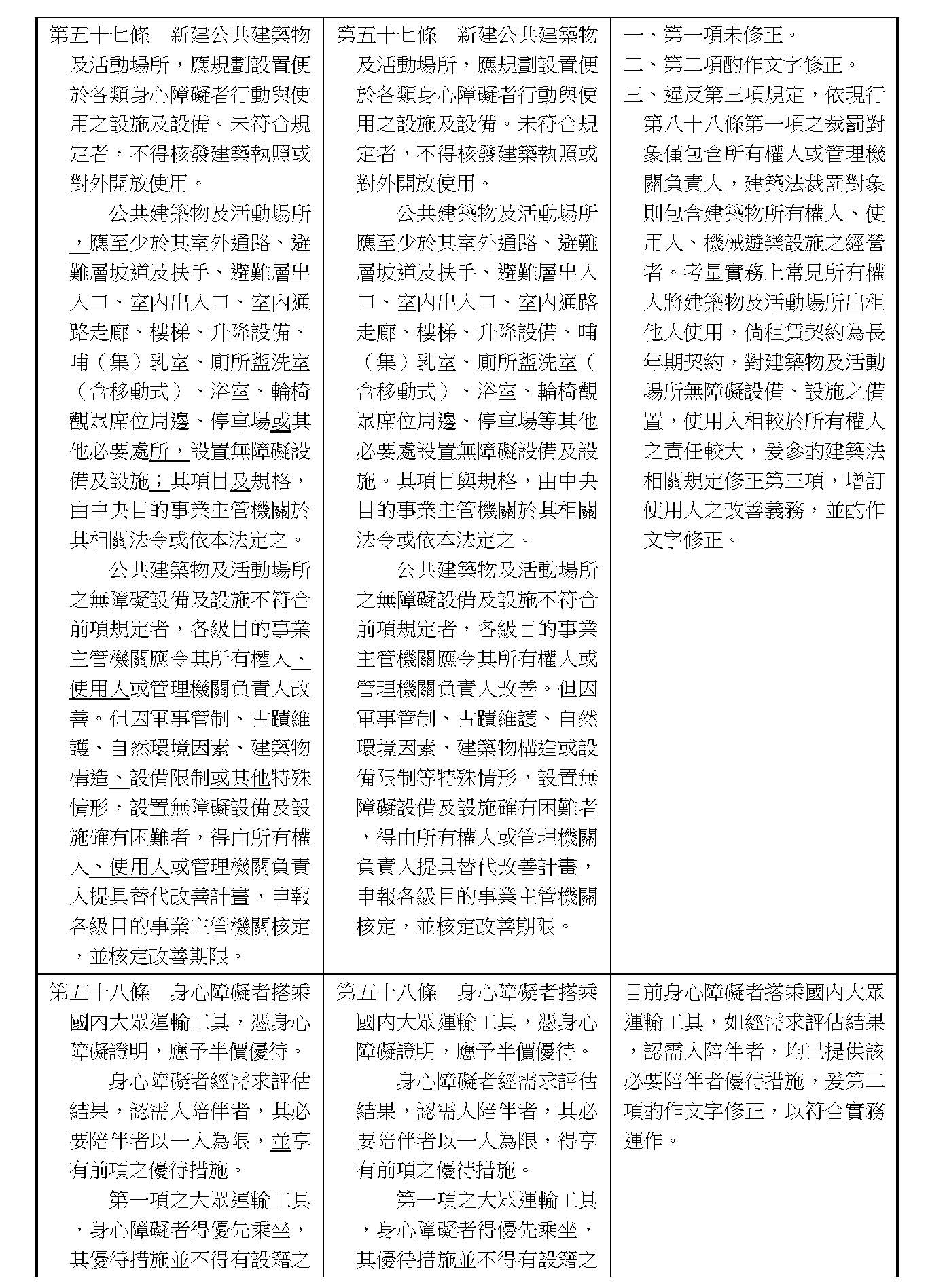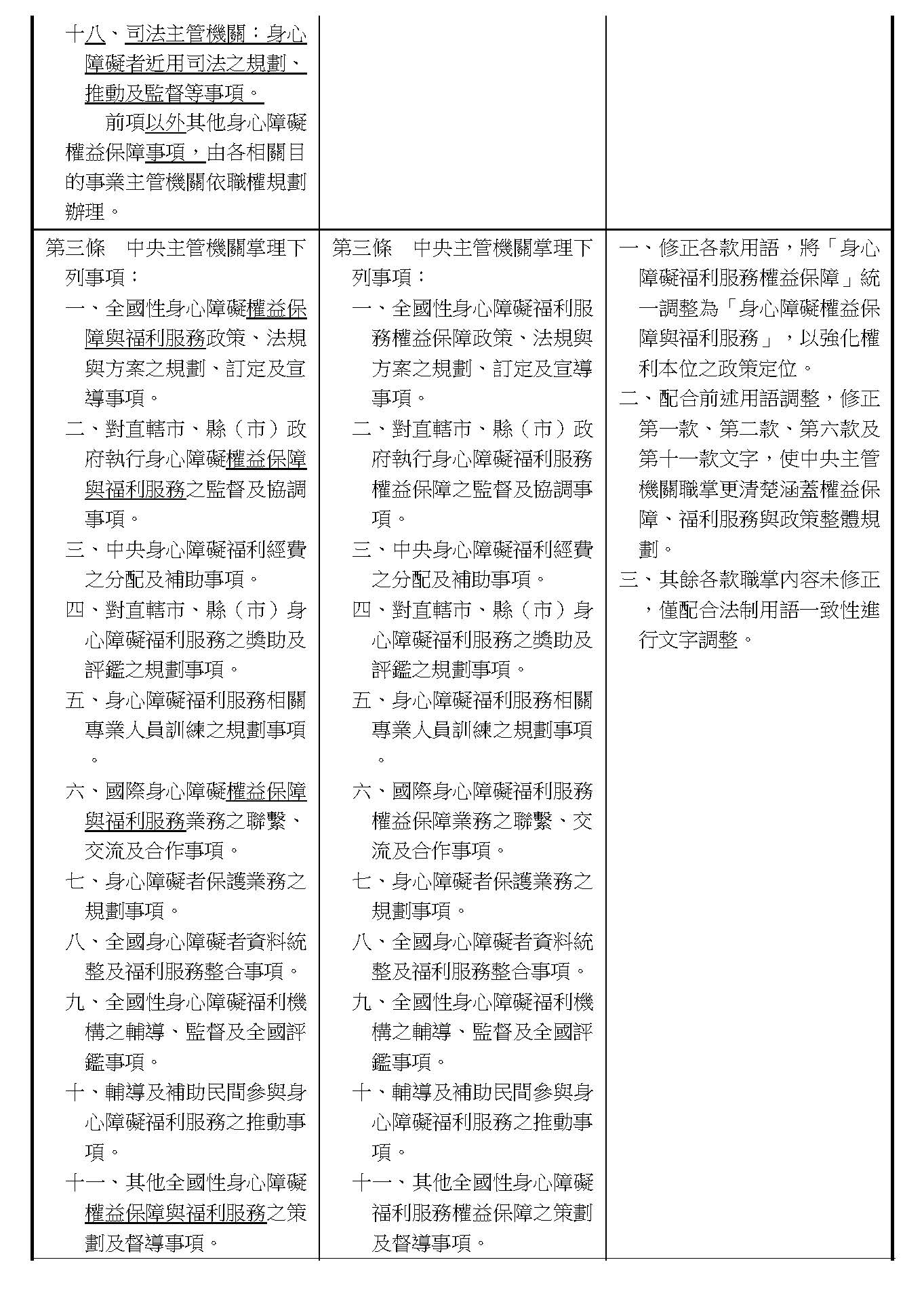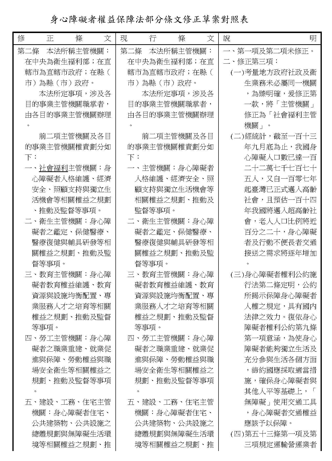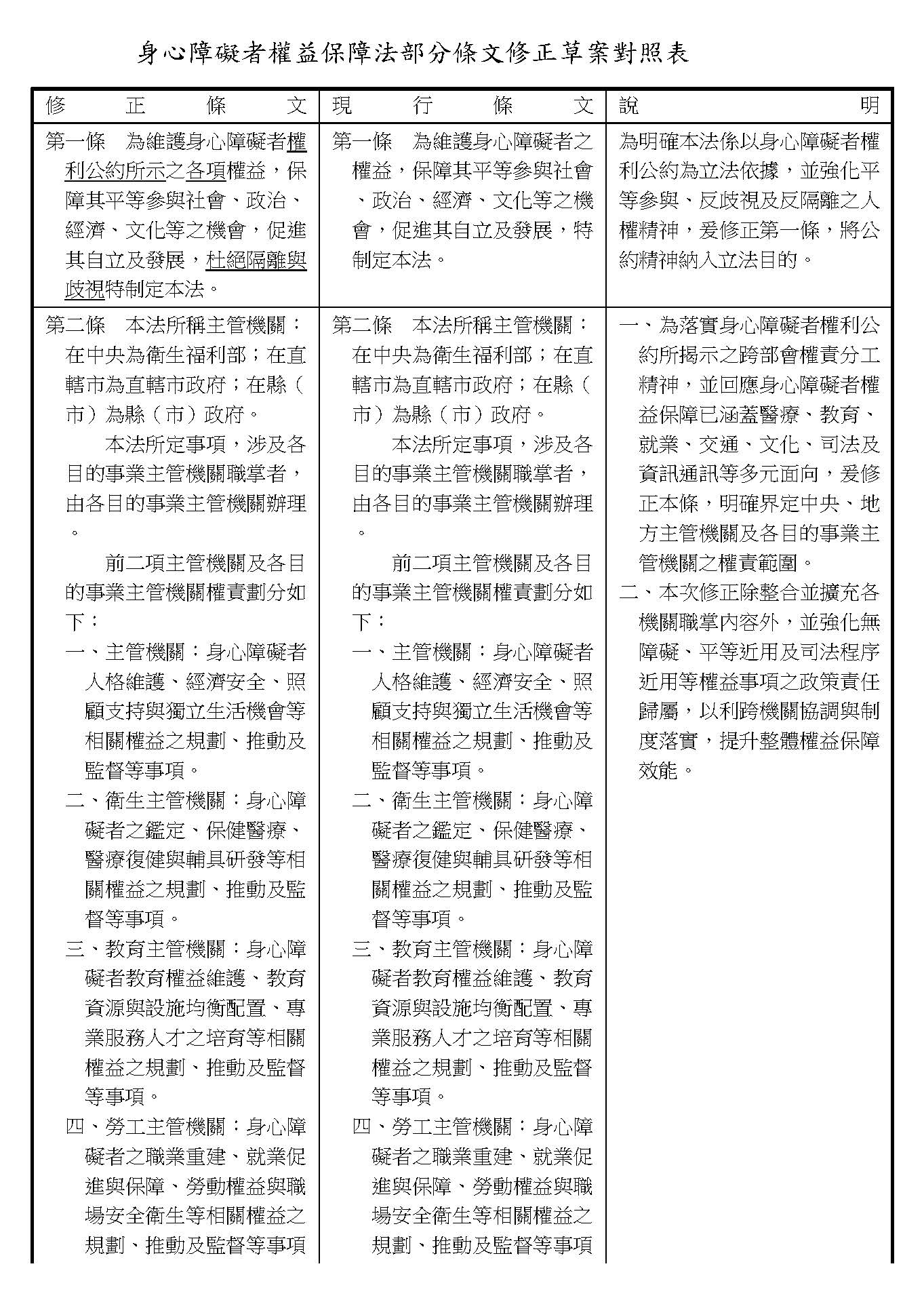 周署長道君:這個部分,行政院版是沒有提案。各委員的版本,主要都是針對資訊通訊或無障礙運輸,大概對於服務內容的近用部分,都有一些相關的提議。比較需要注意的地方,在范雲委員、郭昱晴委員的版本都表示希望把口述影像的部分納進來,召委的版本也有一個相關的動議,要把口述影像的部分納進來,我們參採了幾位委員的提案有一個建議的文字,現在也有投影在螢幕上,主要是第五十二條第三項開始,我們有增列一些文字,我宣讀一下:「第一項第三款所稱公共資訊無障礙,係指應對利用網路、電信、廣播、電視、電影等設施者,提供視、聽、語等功能障礙國民無障礙閱讀、觀看、轉接或傳送等輔助、補助措施」,底下增列一項「中央目的事業主管機關補助電影、電視節目及其他視聽著作之製作,應鼓勵製作口述影像」,因為有增加一項的關係,所以原來是前一項就變成「前二項輔助及補助措施之內容,實施方式及管理規範等事項,由各中央目的事業主管機關定之」。最後一項的部分同現行條文。以上。