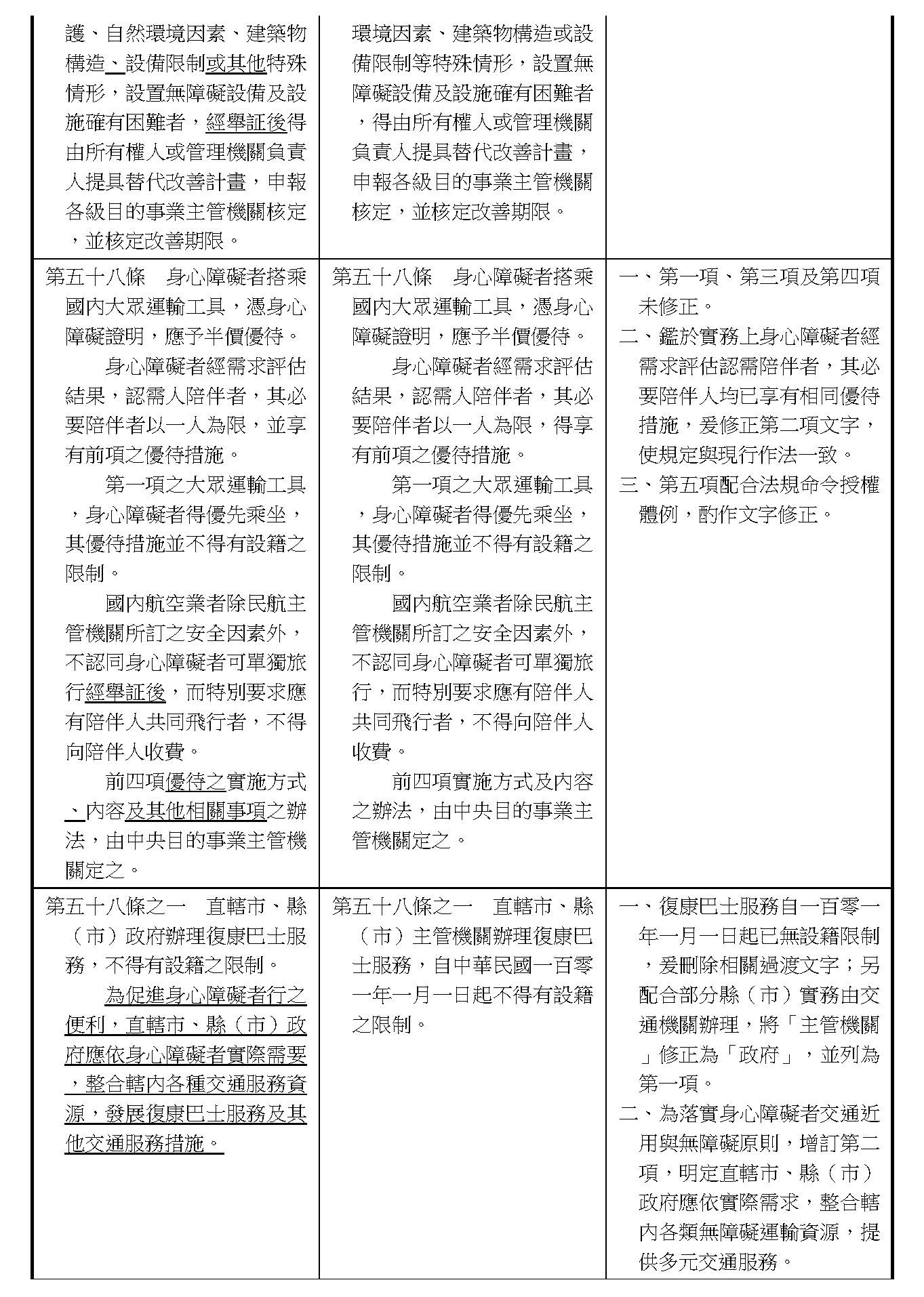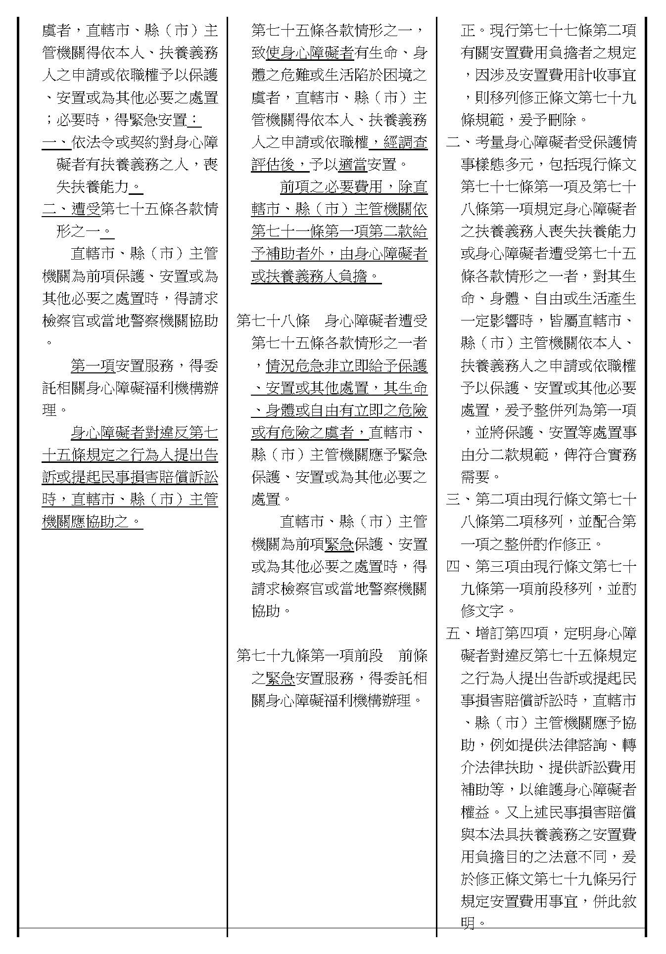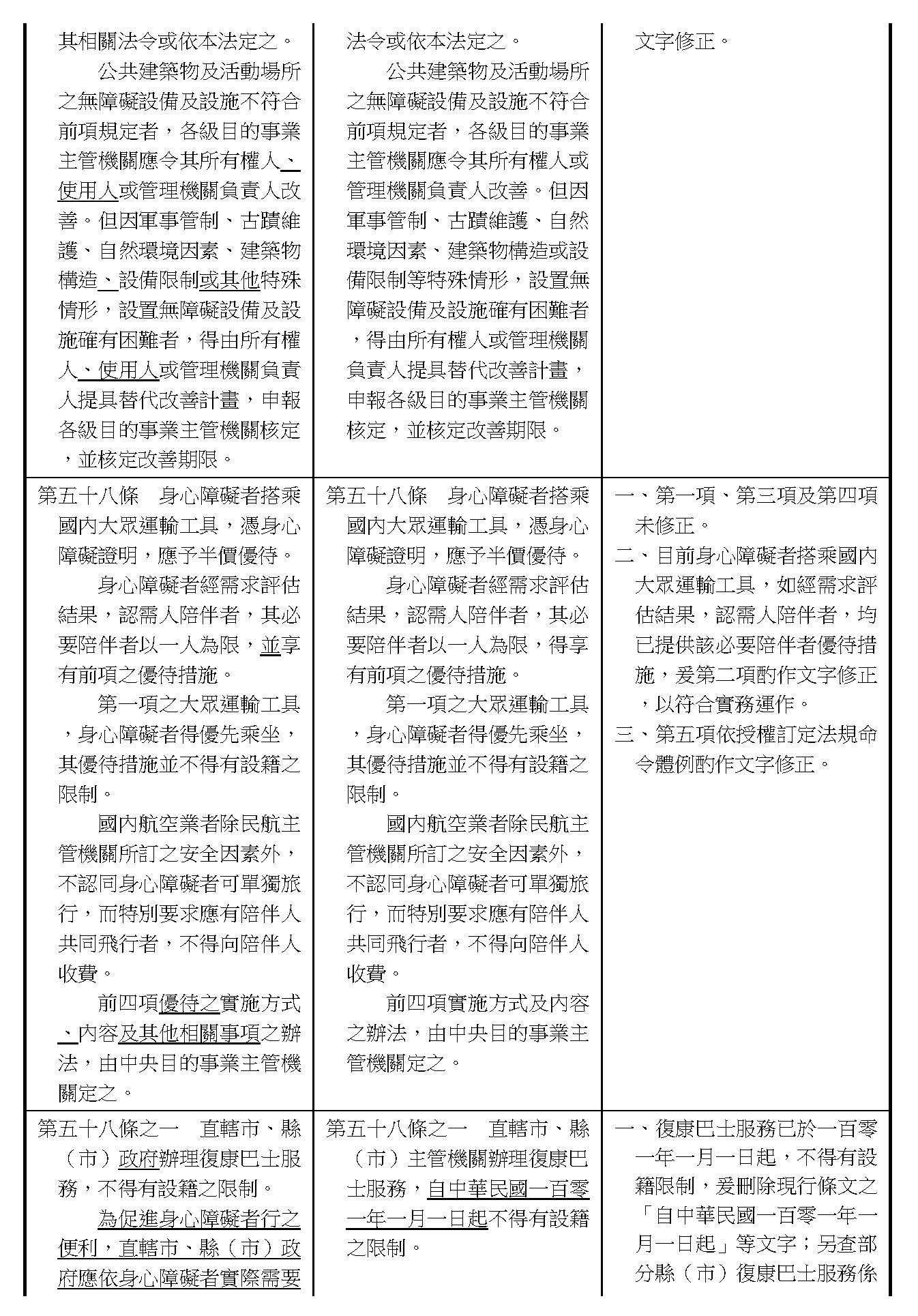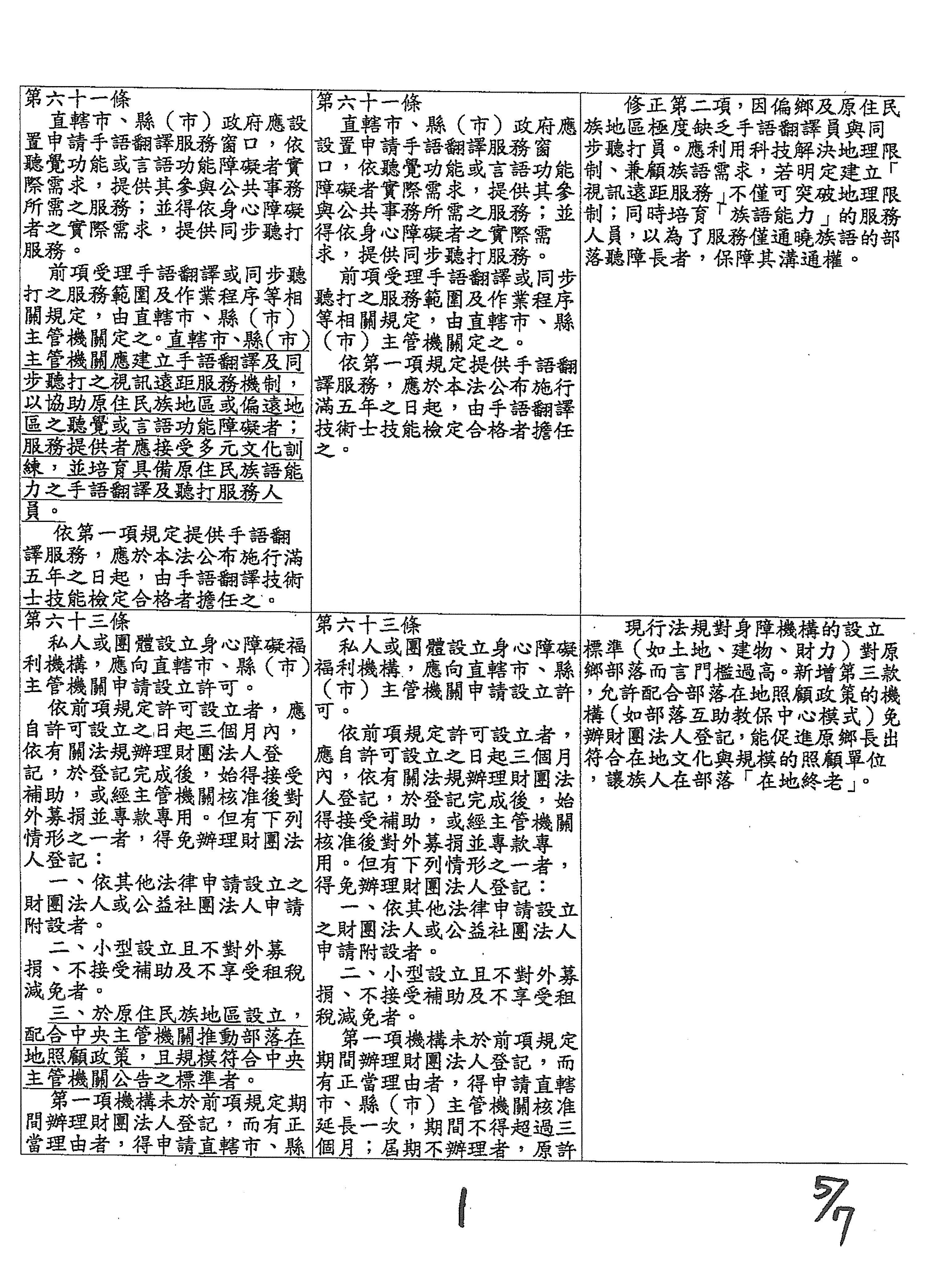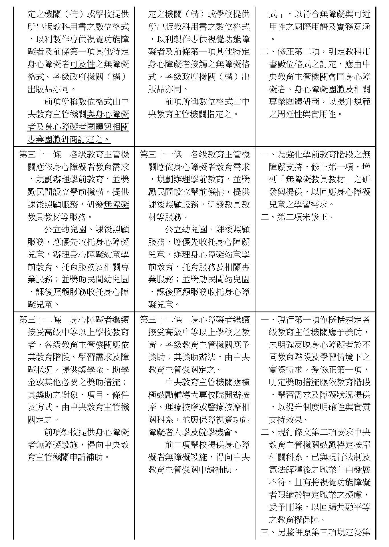 周署長道君:這個部分,行政院版是沒有提案。各委員的版本,主要都是針對資訊通訊或無障礙運輸,大概對於服務內容的近用部分,都有一些相關的提議。比較需要注意的地方,在范雲委員、郭昱晴委員的版本都表示希望把口述影像的部分納進來,召委的版本也有一個相關的動議,要把口述影像的部分納進來,我們參採了幾位委員的提案有一個建議的文字,現在也有投影在螢幕上,主要是第五十二條第三項開始,我們有增列一些文字,我宣讀一下:「第一項第三款所稱公共資訊無障礙,係指應對利用網路、電信、廣播、電視、電影等設施者,提供視、聽、語等功能障礙國民無障礙閱讀、觀看、轉接或傳送等輔助、補助措施」,底下增列一項「中央目的事業主管機關補助電影、電視節目及其他視聽著作之製作,應鼓勵製作口述影像」,因為有增加一項的關係,所以原來是前一項就變成「前二項輔助及補助措施之內容,實施方式及管理規範等事項,由各中央目的事業主管機關定之」。最後一項的部分同現行條文。以上。