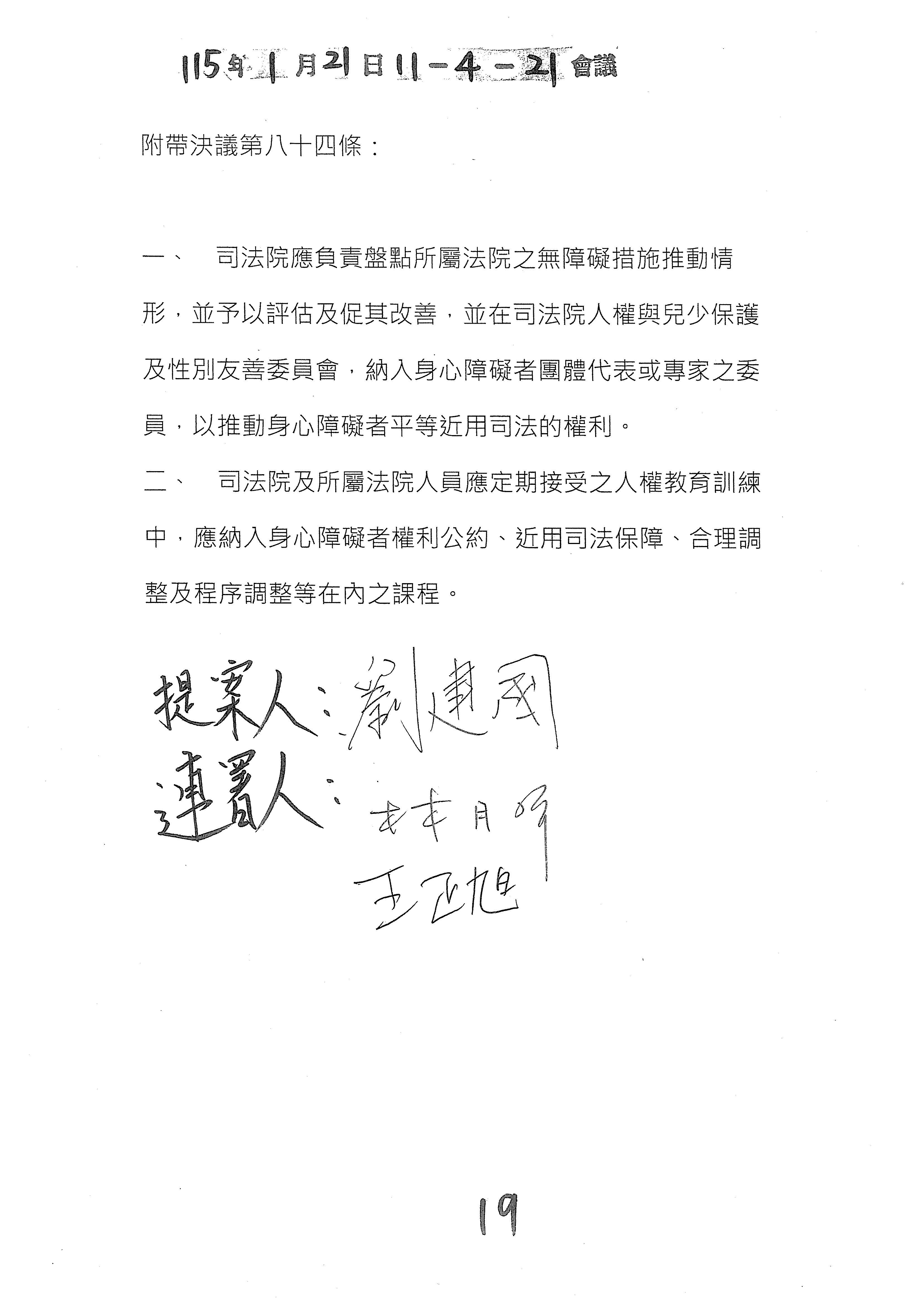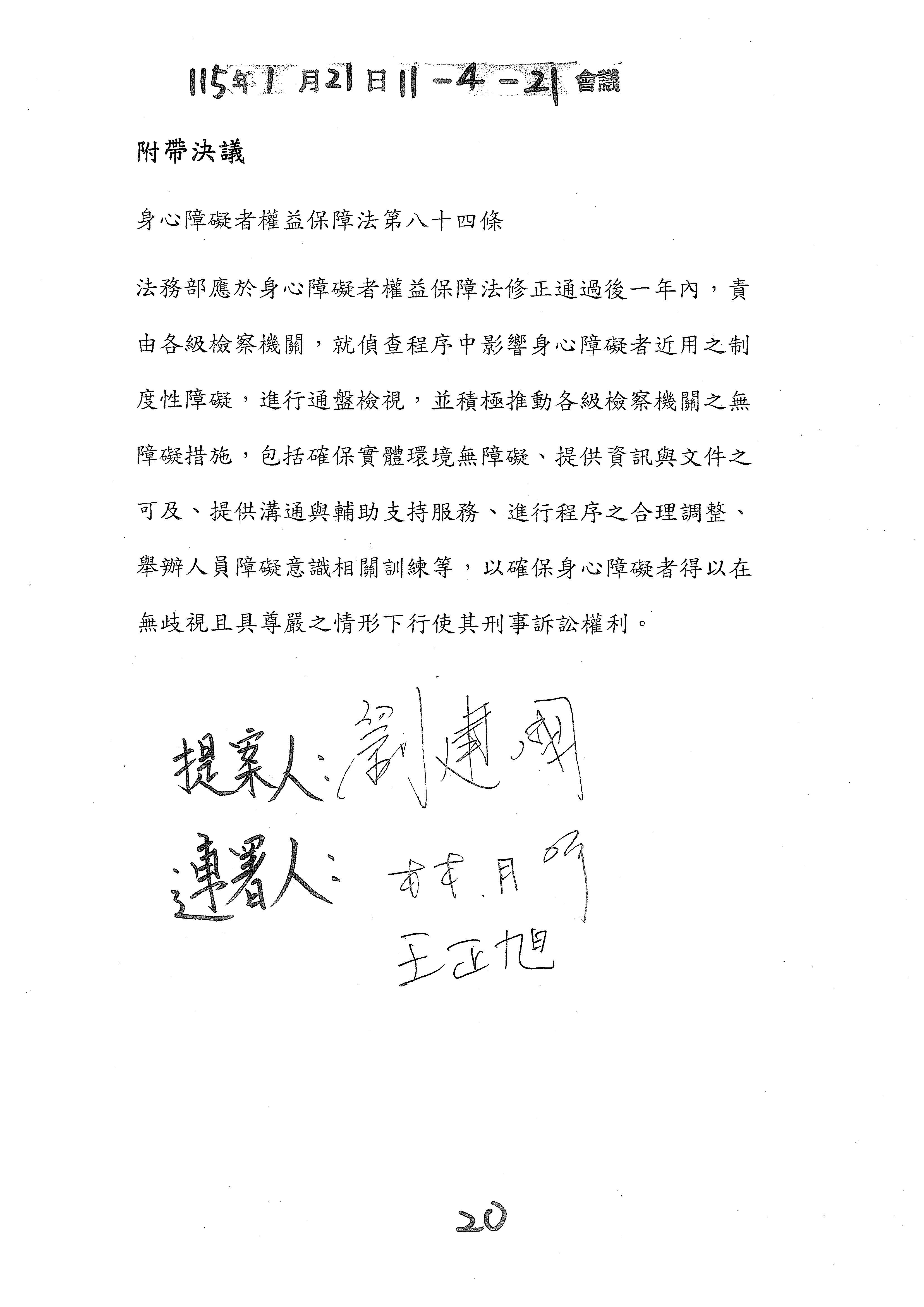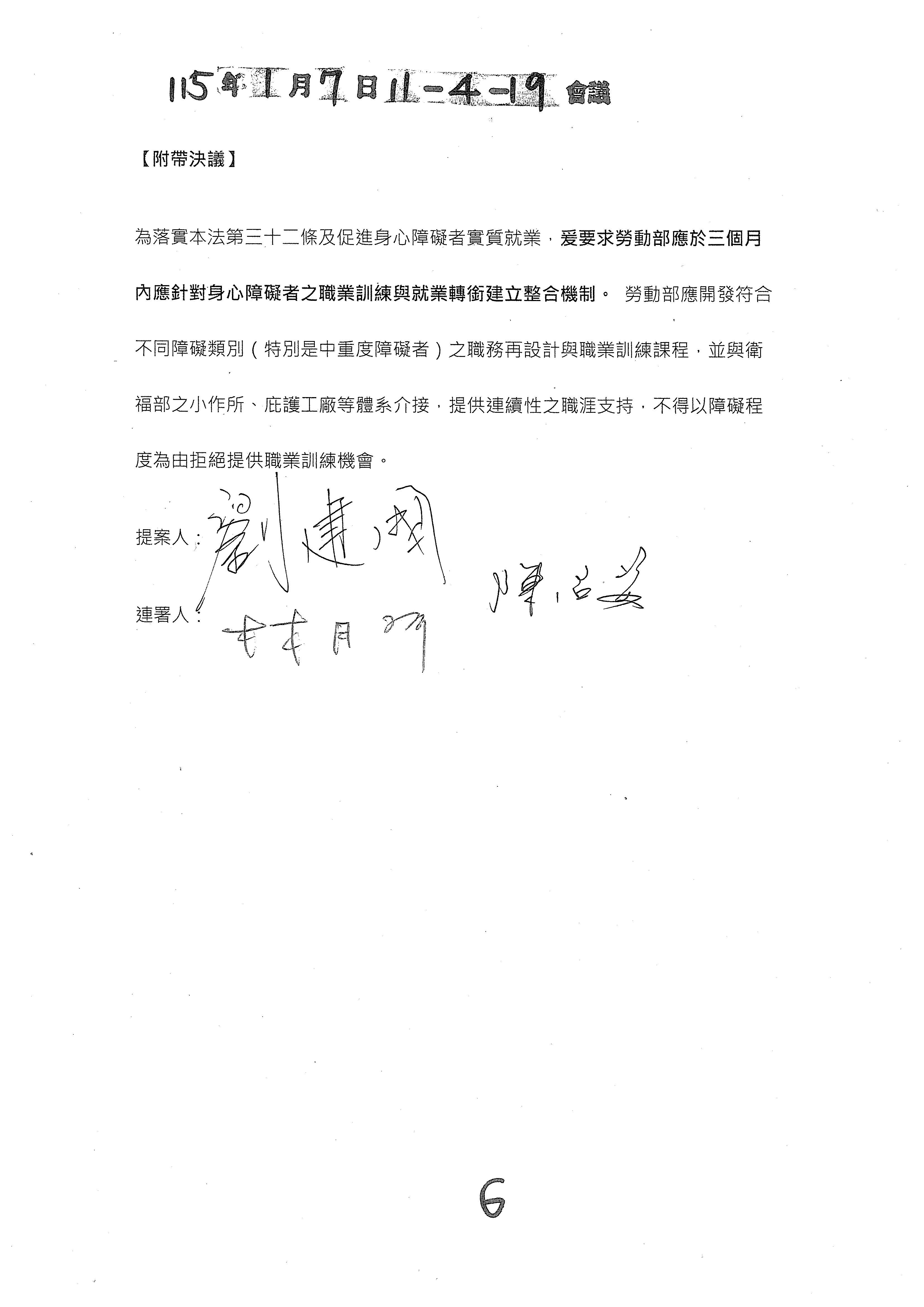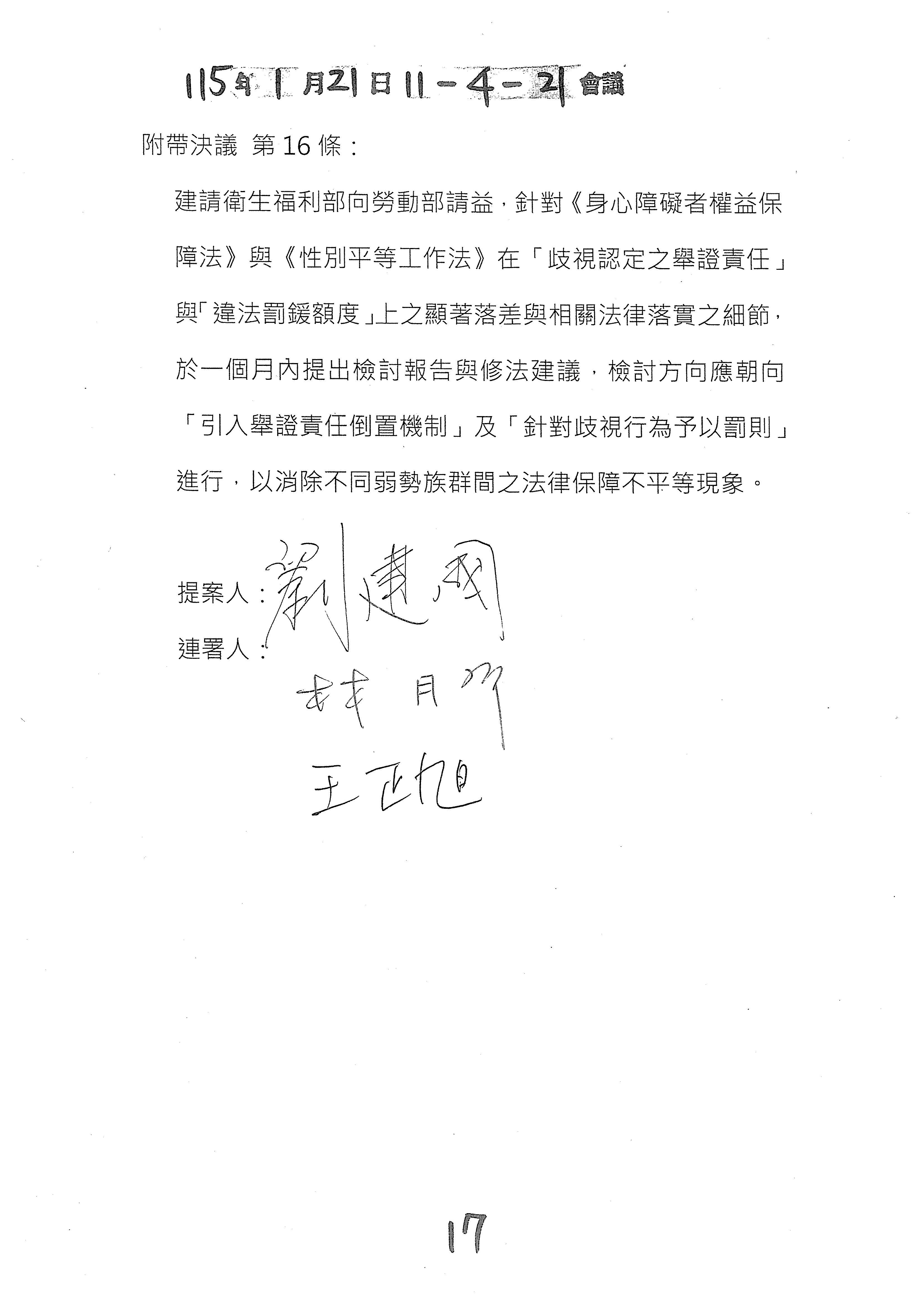 周署長道君:針對盧委員版本的部分,建議是不是我們可以準備一個附帶決議的文字?我們同仁這邊大概有初擬,如果允許的話,是否我們等一下提供給委員,請委員這邊過目一下?如果可以的話,我們就用附帶決議的方式來處理,以上。