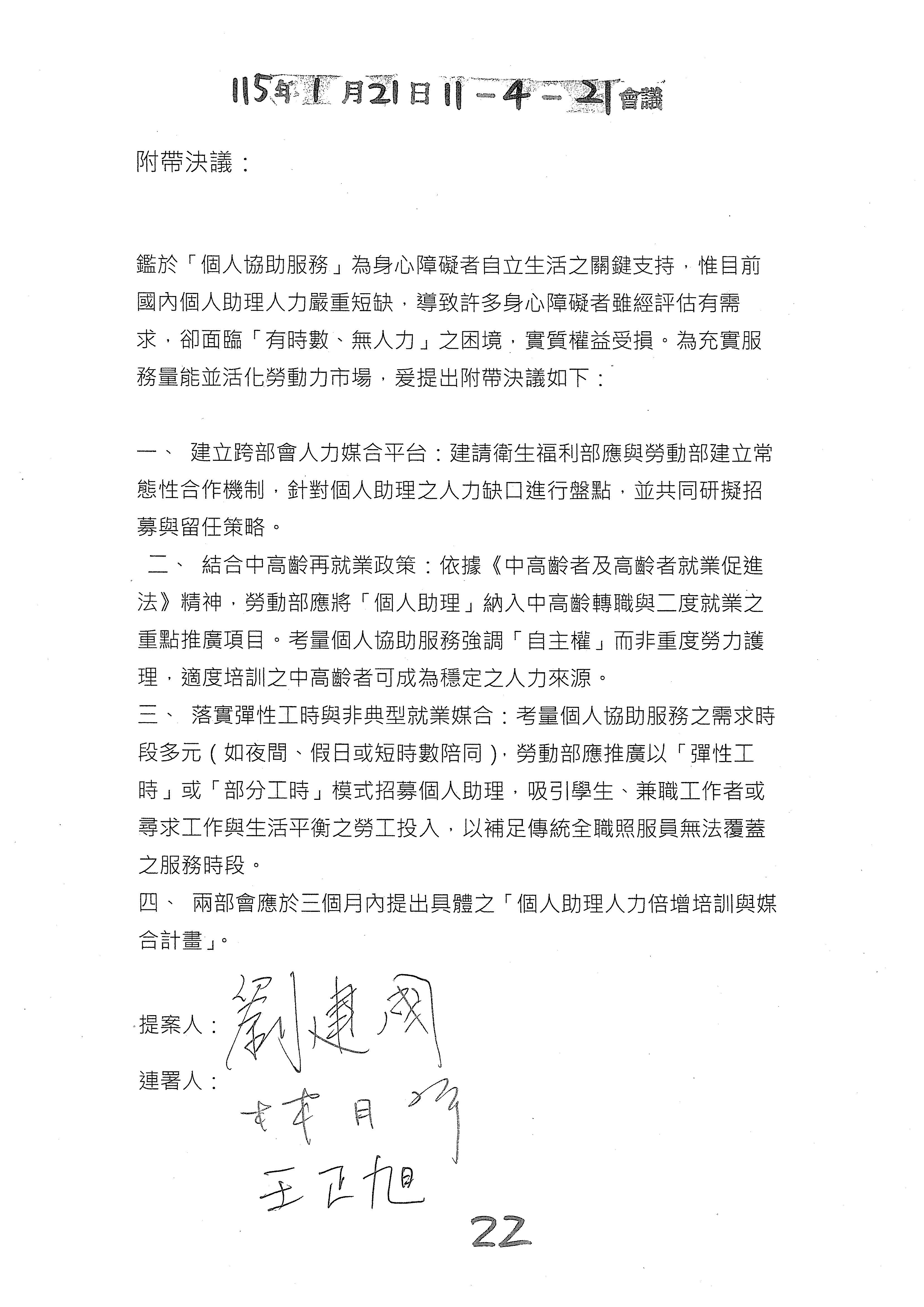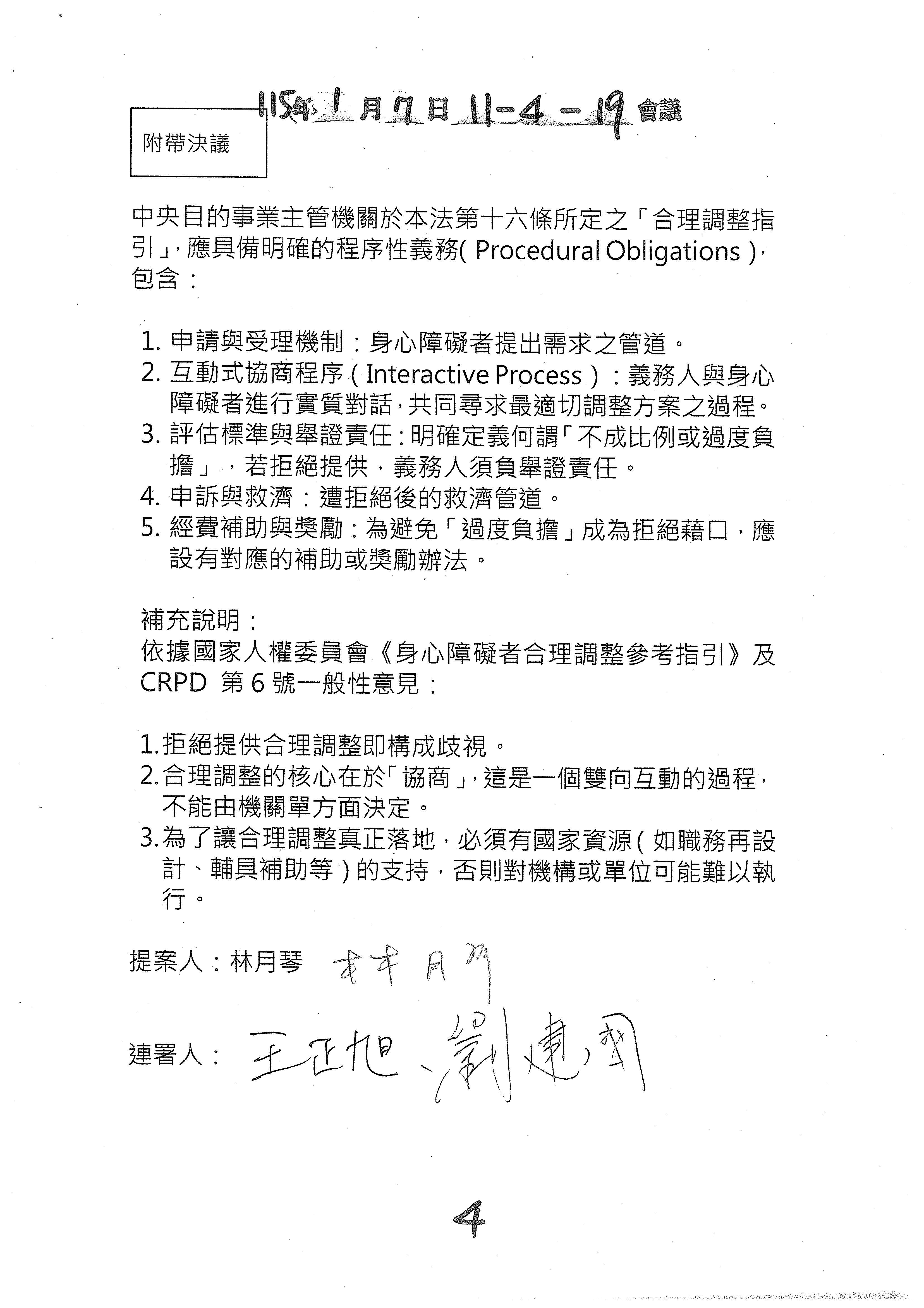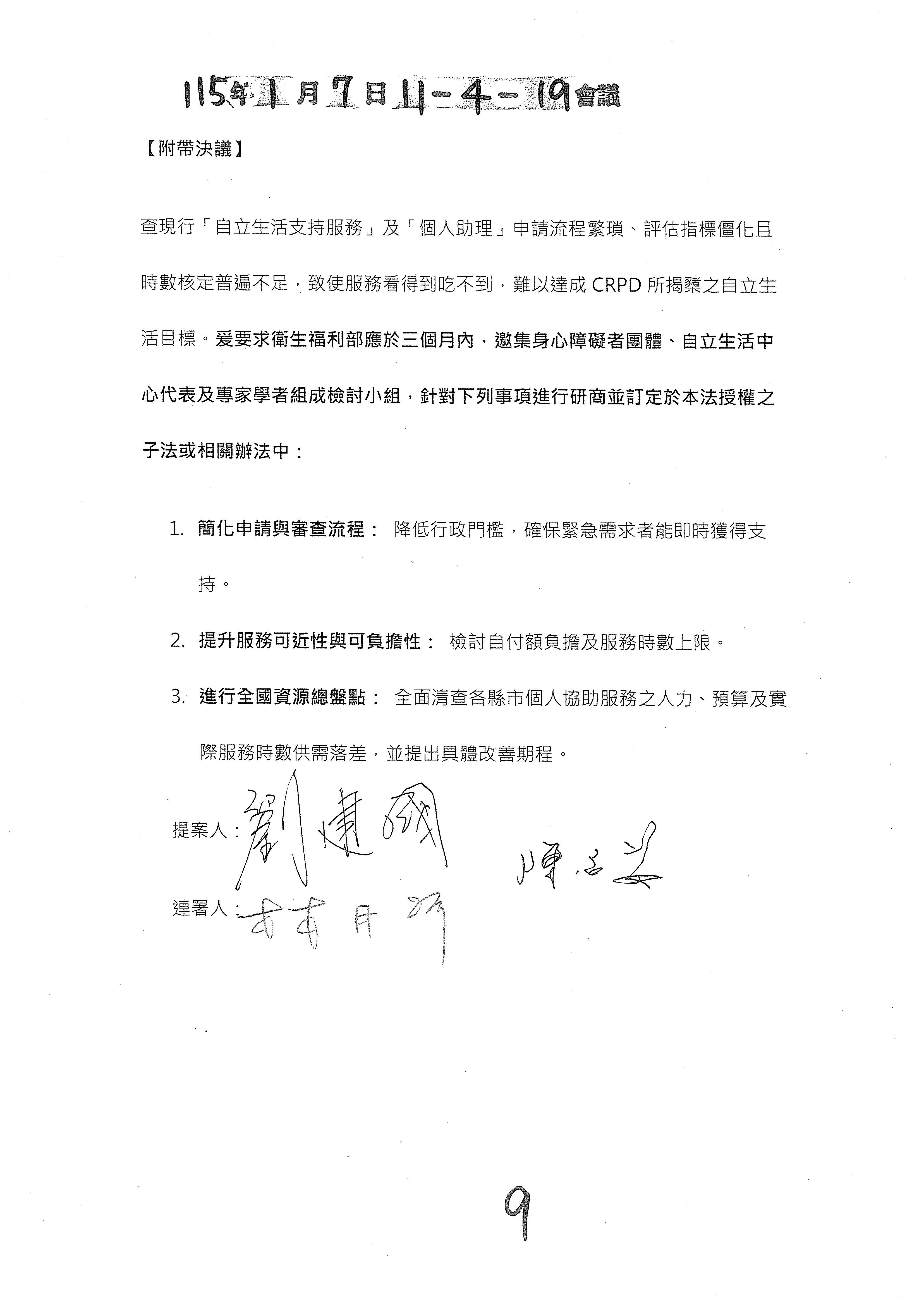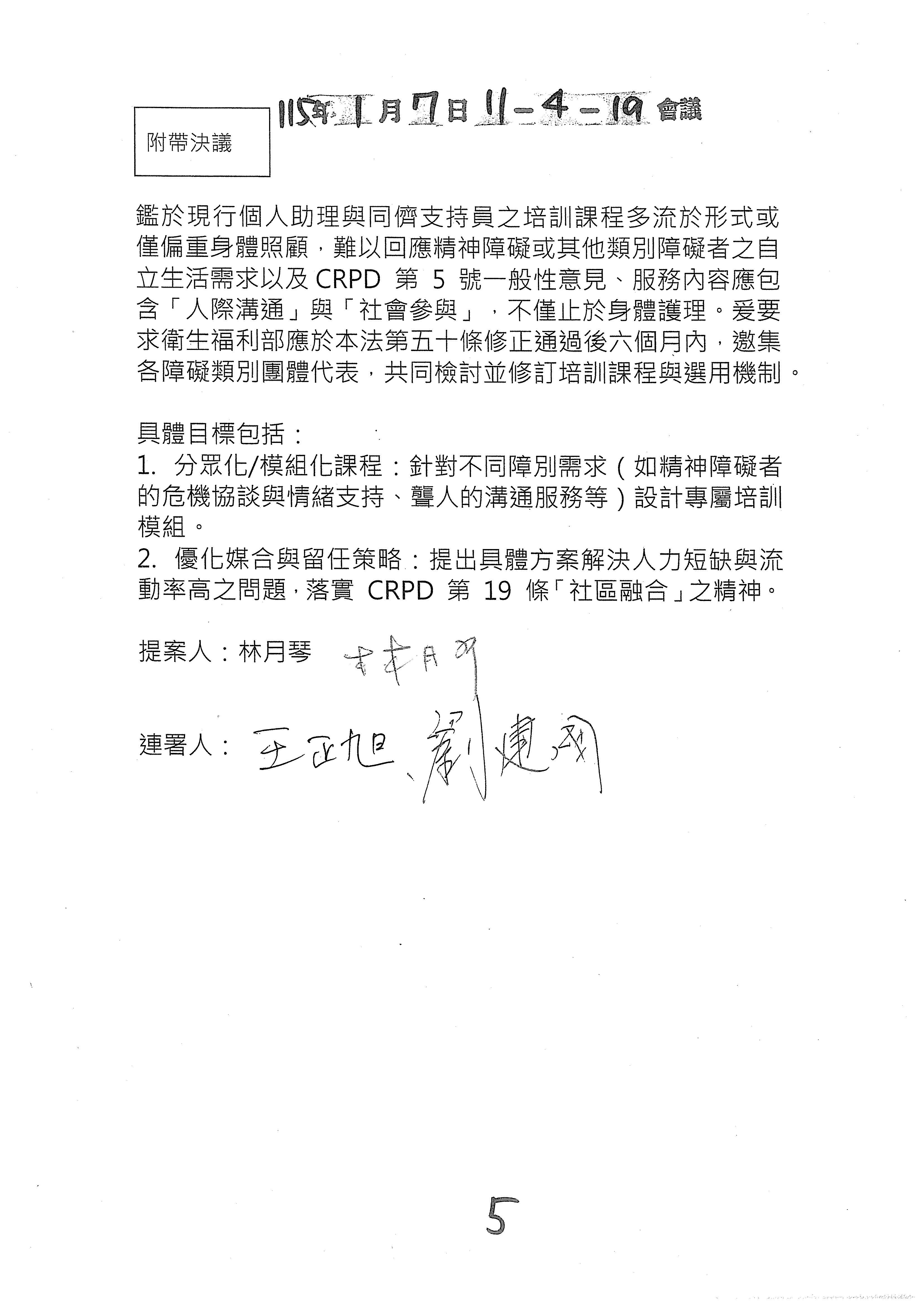 所以除了參考幾位委員的修正動議文字之外,我們也會建議是不是再加上一個附帶決議的文字?對於這類的一次性服務原則以及審查書表、規範等等,我們會提供一個附帶決議的文字版本,如果這樣的處理方向是OK的,我們就趕快把那個附帶決議的文字提供給各位委員來審閱。以上。
