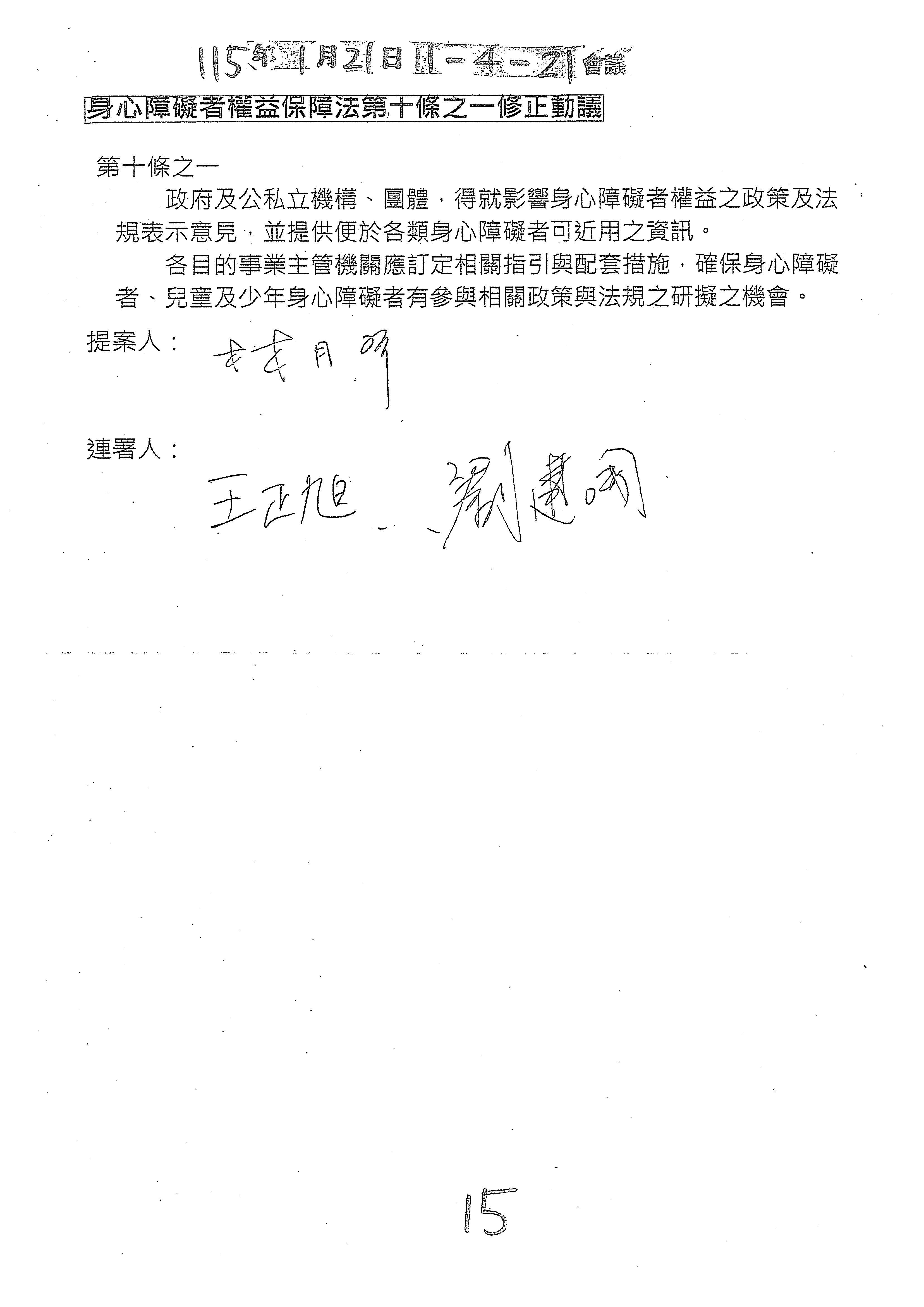 (十五)委員廖偉翔等19人擬具「身心障礙者權益保障法部分條文修正草案」案。