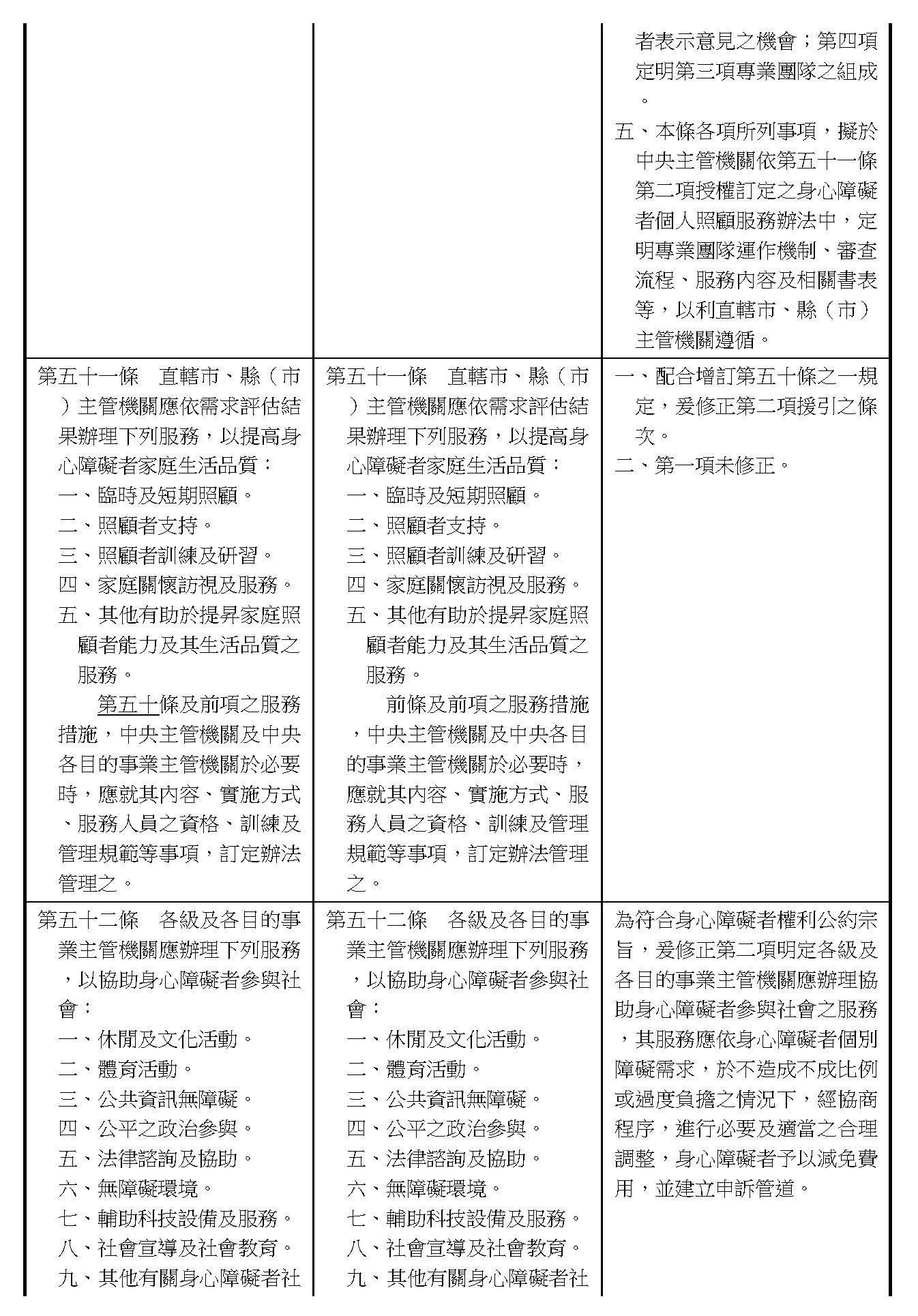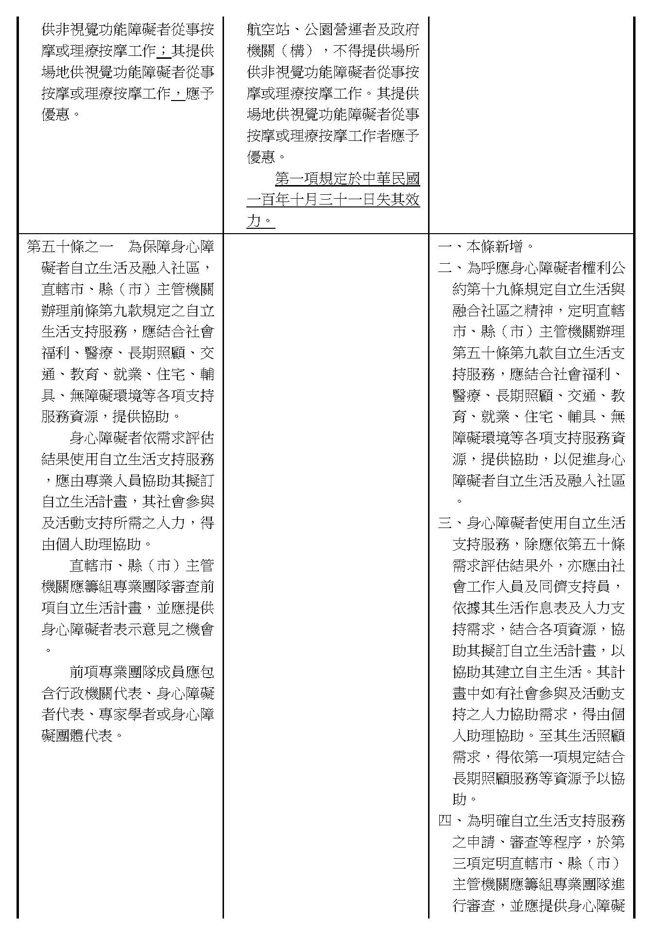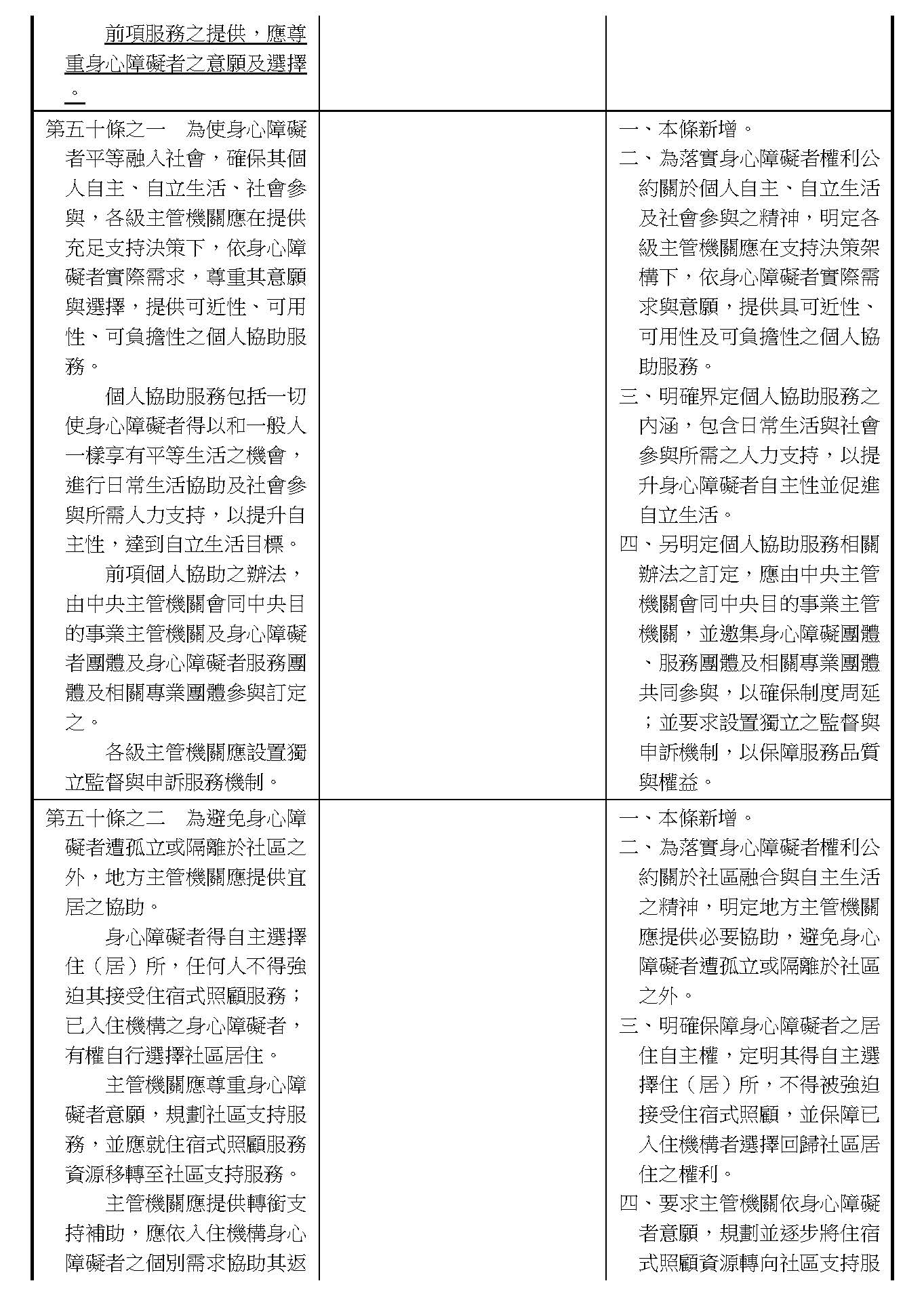 周署長道君:第五十條之一,行政院的提案主要是針對前面提到的第五十條第九款「自立生活支持服務」的部分。因為這個是外界一直非常關心的事項,裡面包括不管是個人助理或者是同儕支持等服務,所以我們在這條條文裡面進一步把有關自立支持生活的內涵部分做闡明。