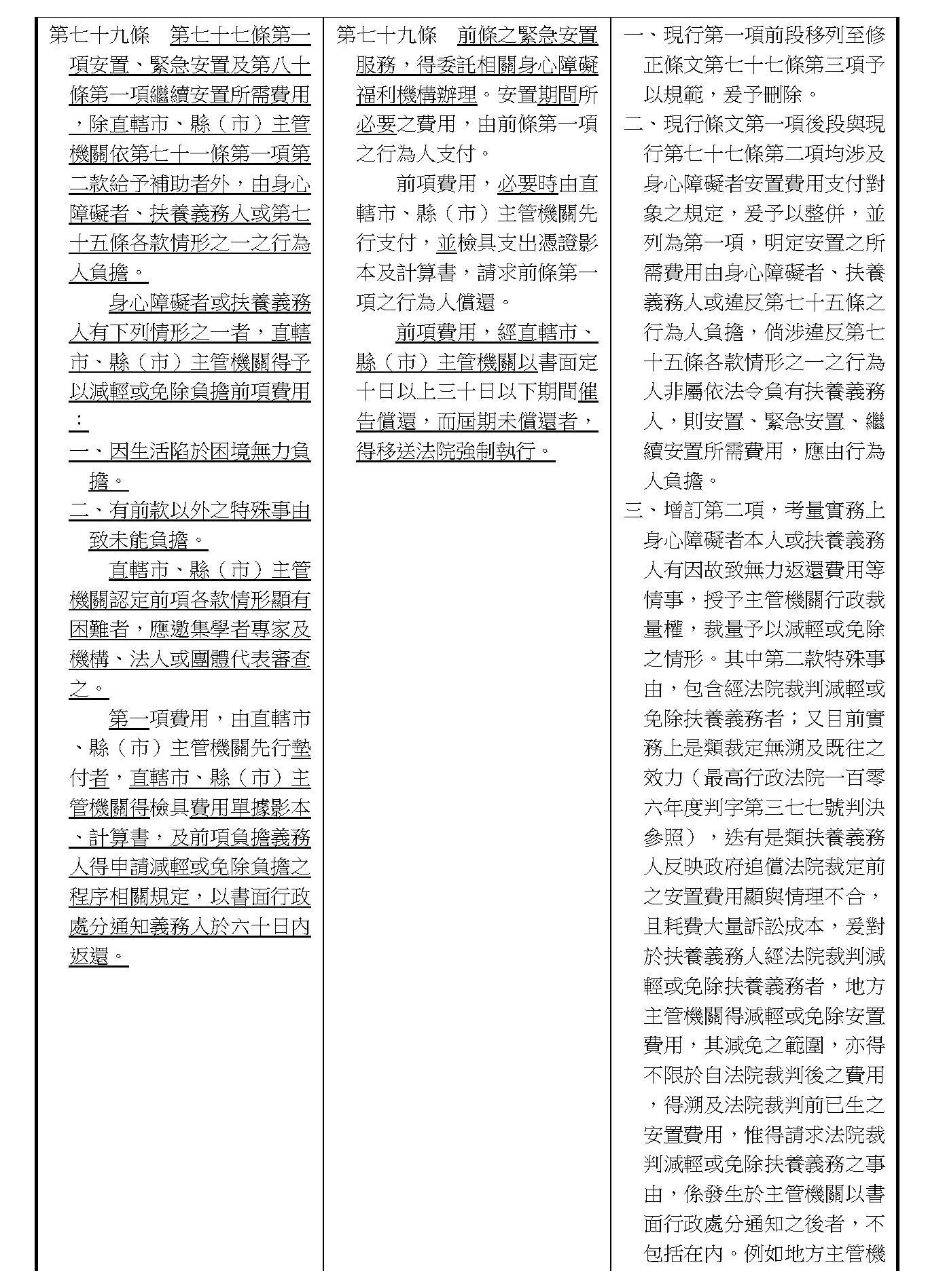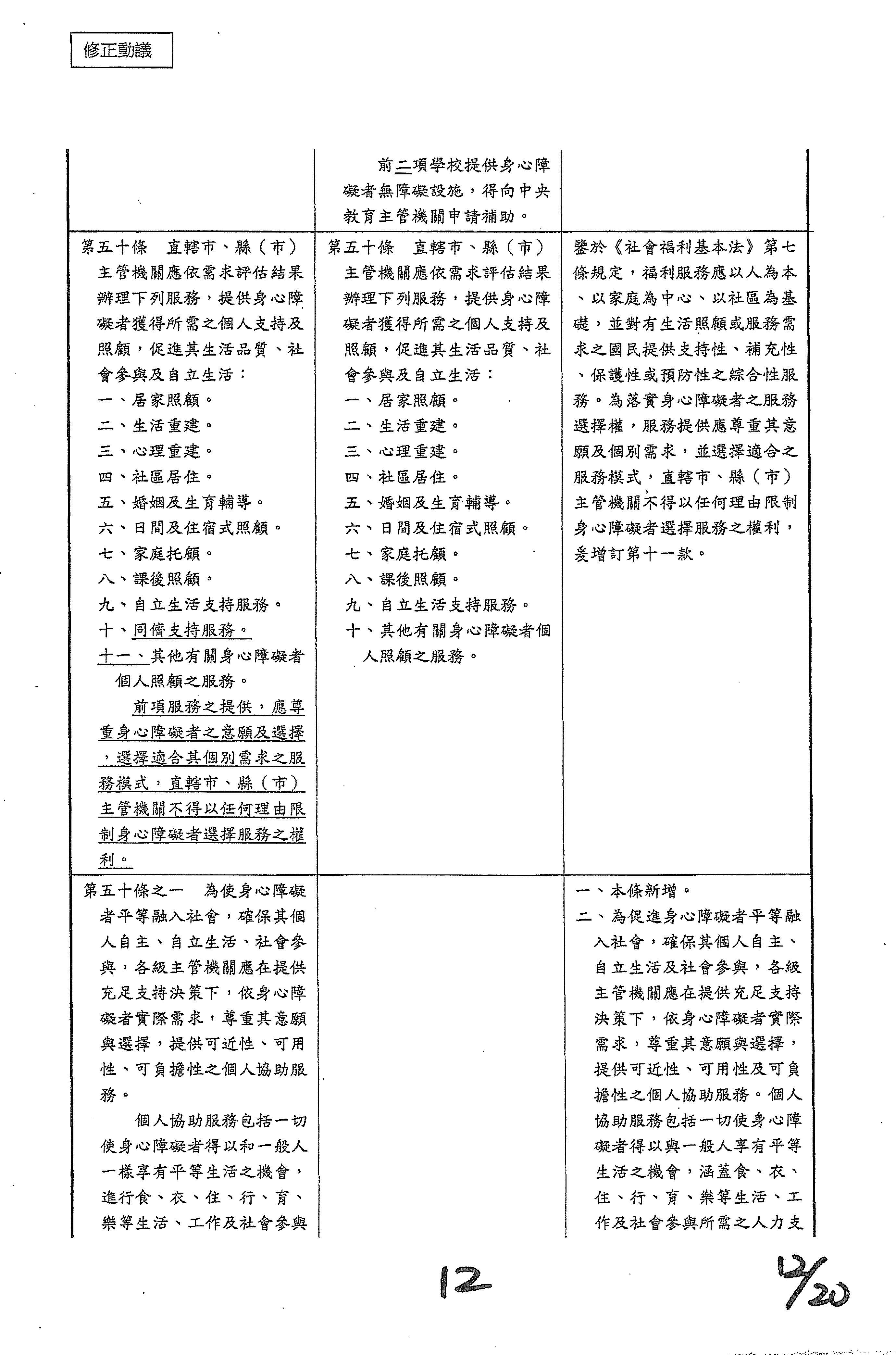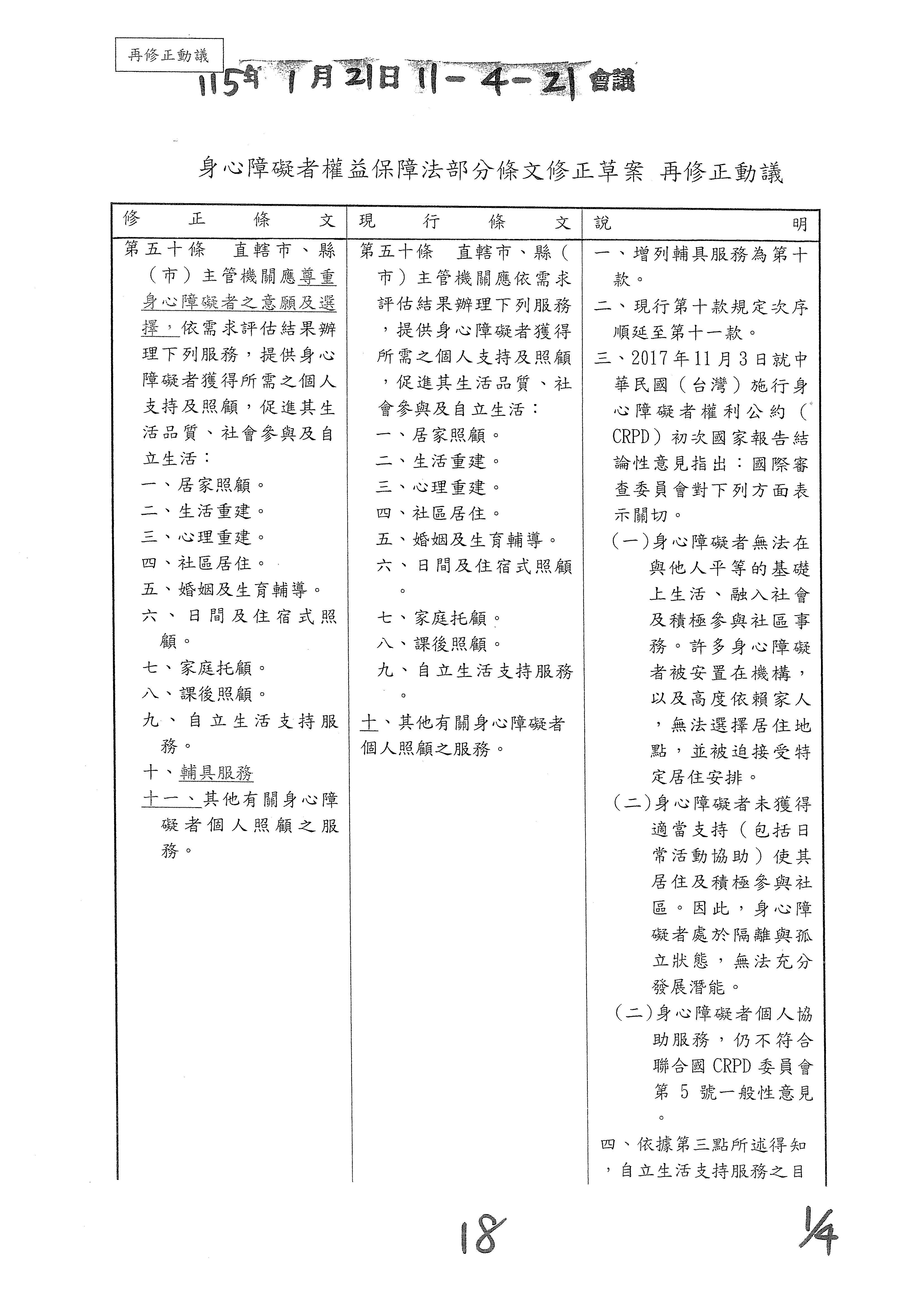 周署長道君:第五十條之一,行政院的提案主要是針對前面提到的第五十條第九款「自立生活支持服務」的部分。因為這個是外界一直非常關心的事項,裡面包括不管是個人助理或者是同儕支持等服務,所以我們在這條條文裡面進一步把有關自立支持生活的內涵部分做闡明。