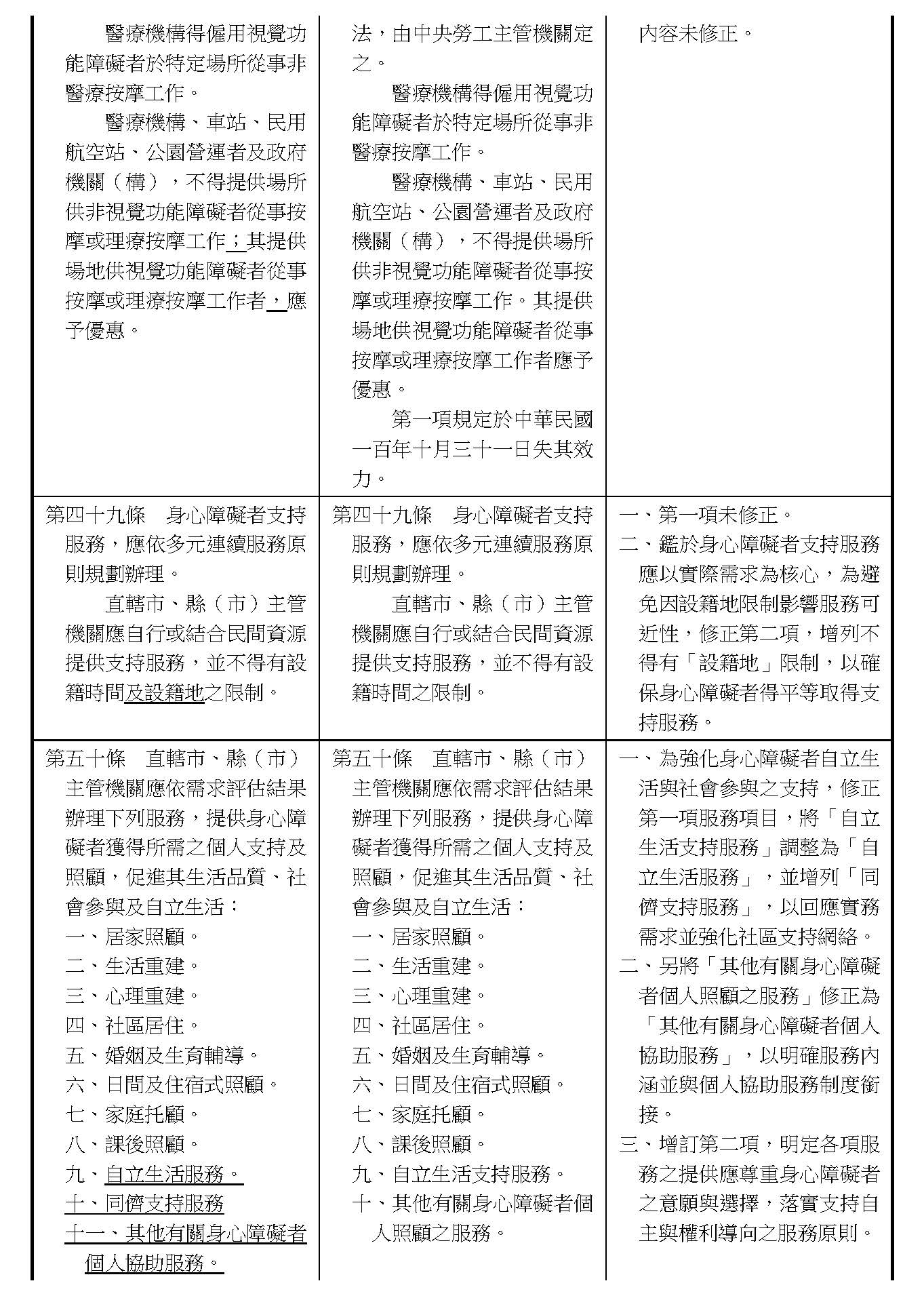 有關裡面各款服務的部分,現行條文第五十條第九款是用「自立生活支持服務」,因為依照本法授權的規定寫在第五十一條,而在個人照顧的相關辦法裡面,對於整個自立生活支持服務部分,包括各位委員所關心的個人助理以及同儕支持,現在在個人支持都已經有寫進去。