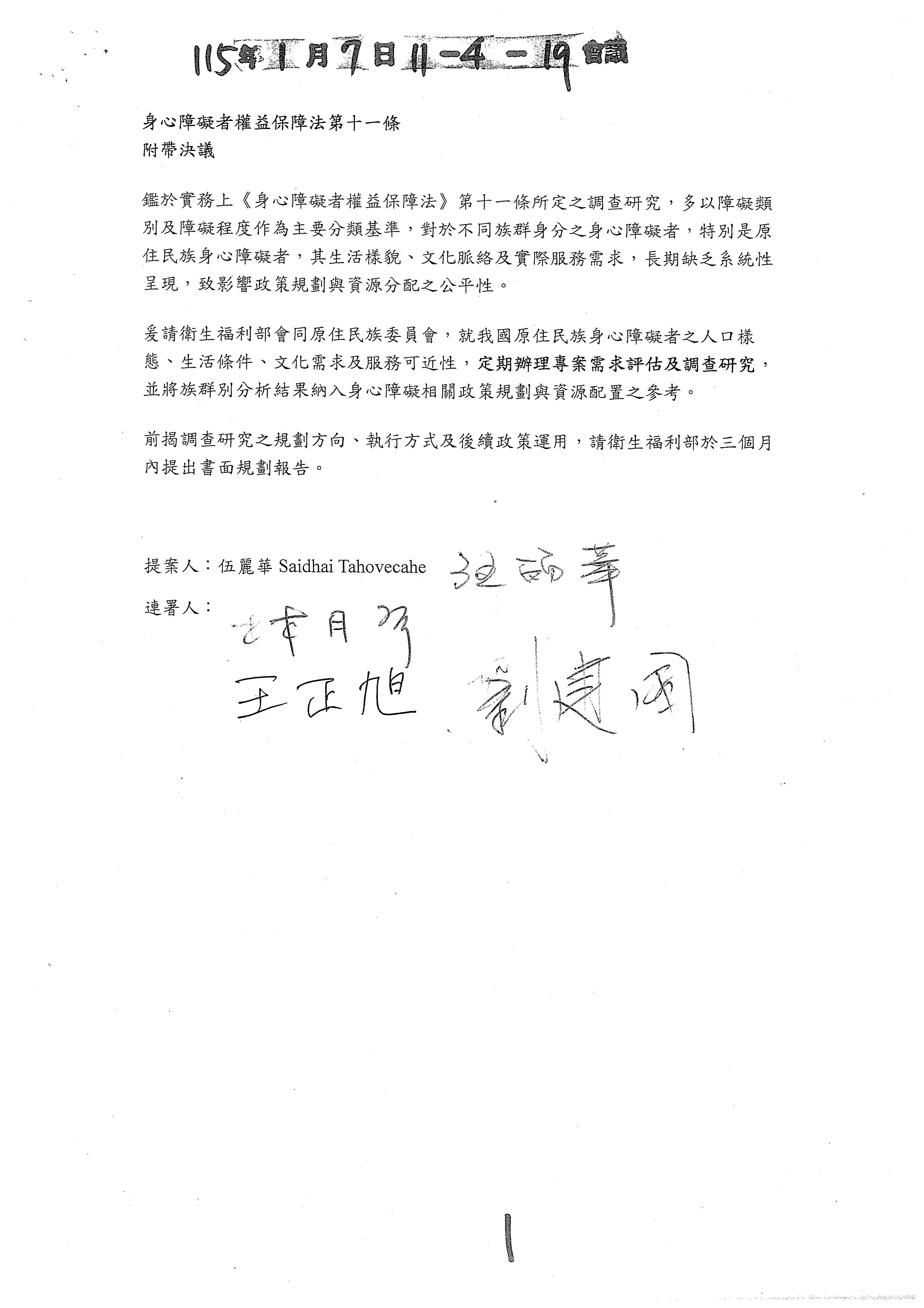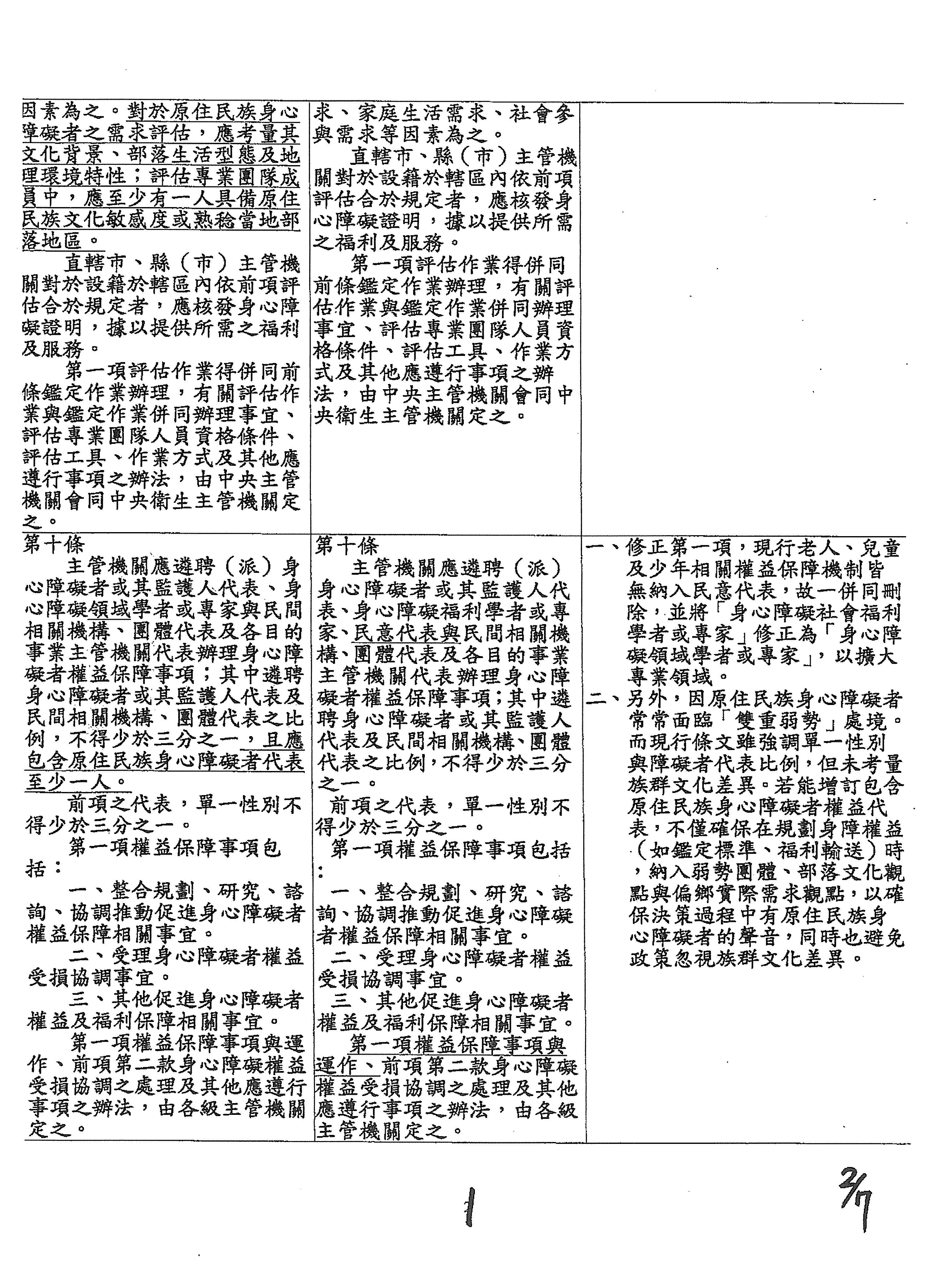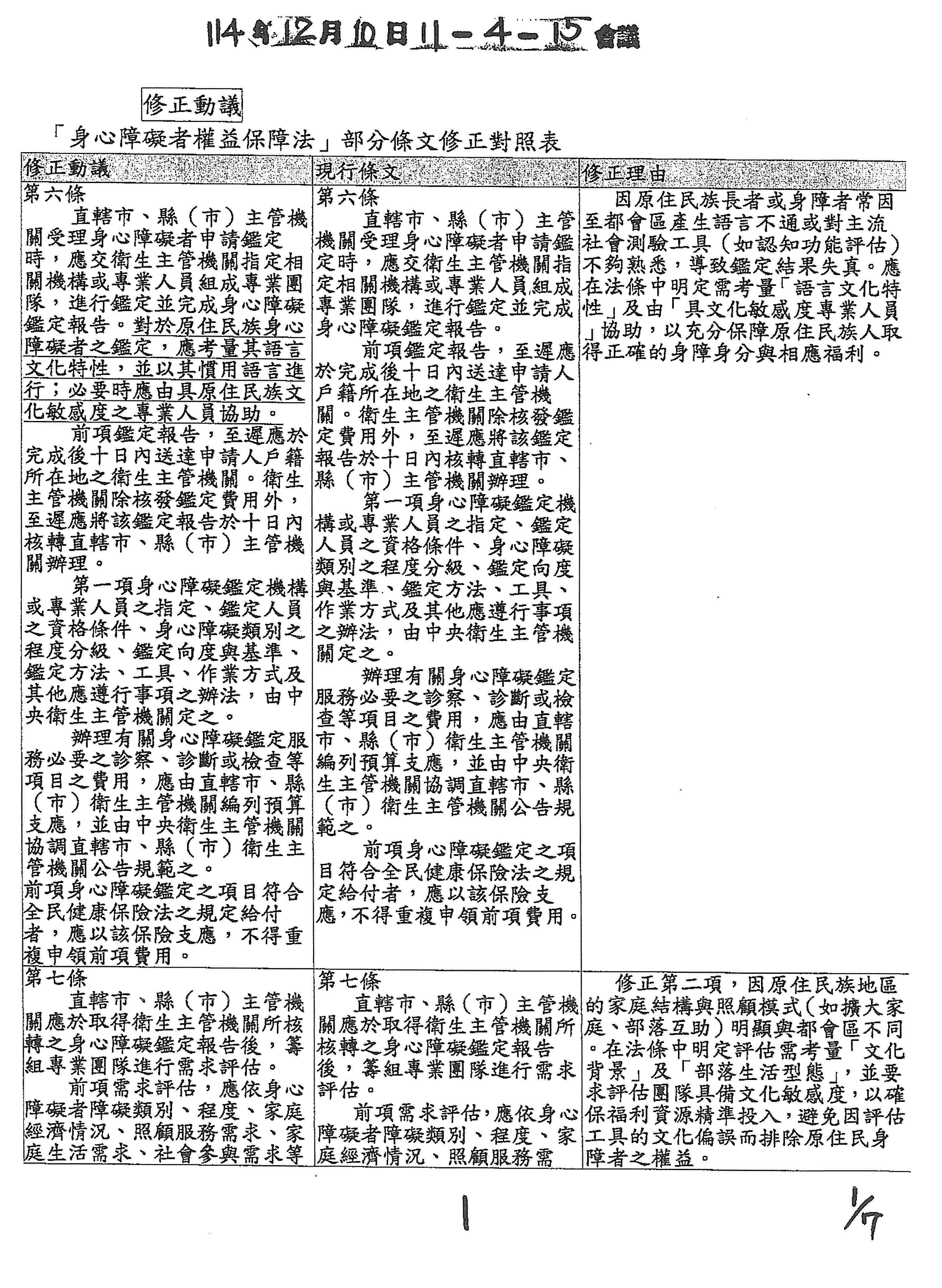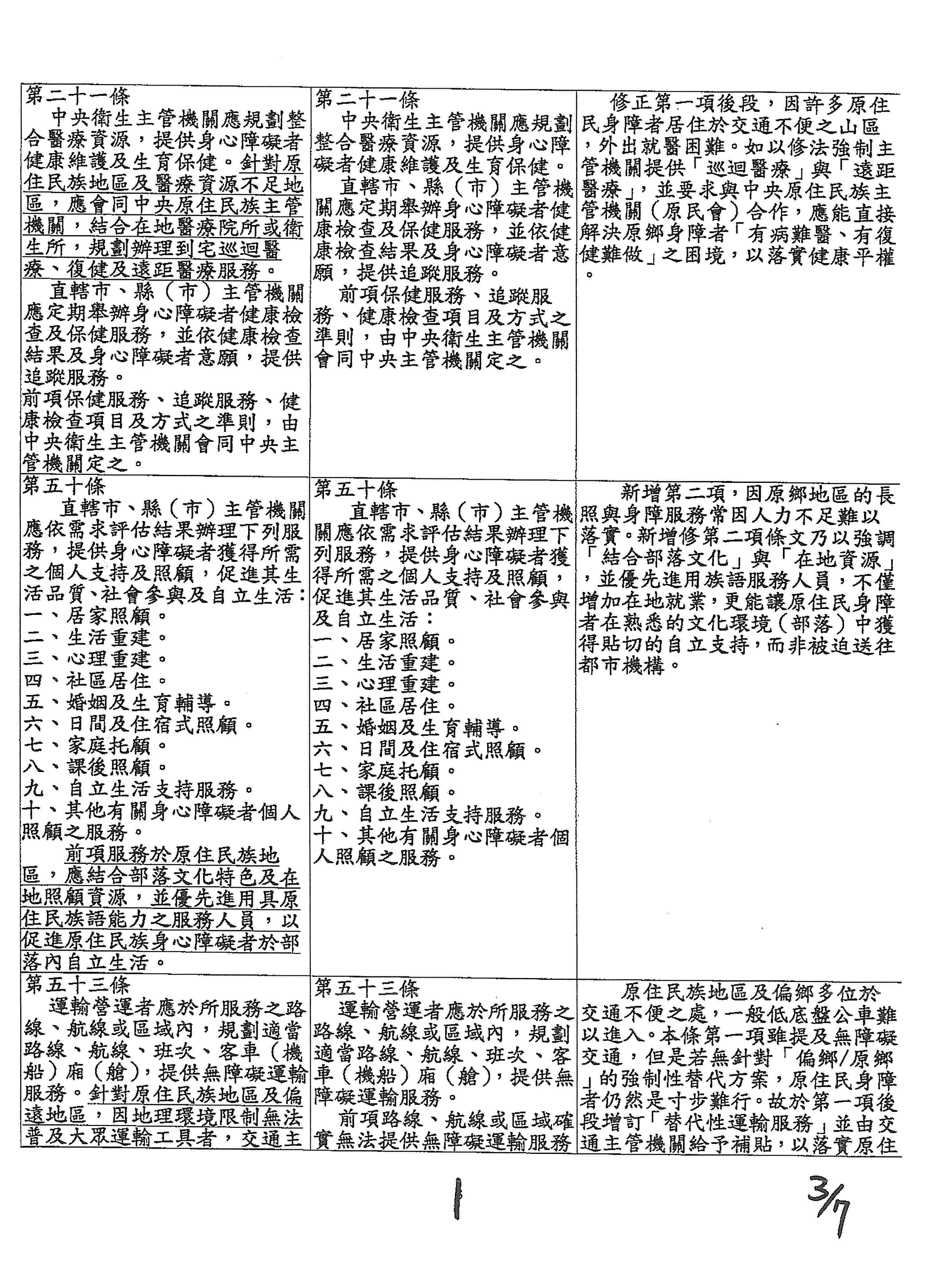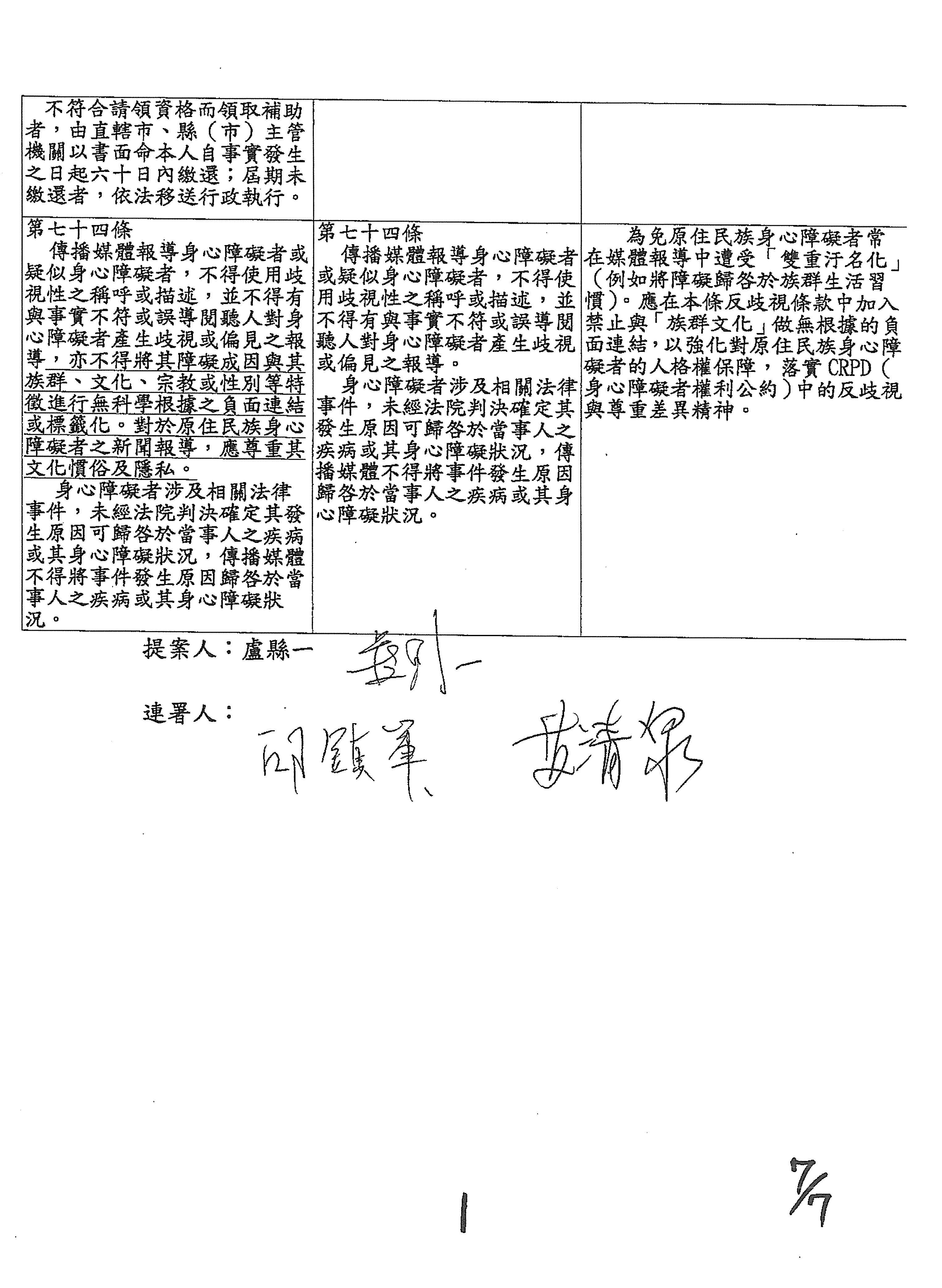 盧委員縣一:我的版本是新增第二項。因為原鄉地區的長照與身障服務人力長期不足,難以落實,所以新增第二項條文,強調結合部落文化與在地資源,並優先進用族裡服務人員,不僅增加在地就業,更能讓原住民身障者在熟悉的文化環境中獲得貼切的自立支持,而非被迫送往都市機構。以上,謝謝。