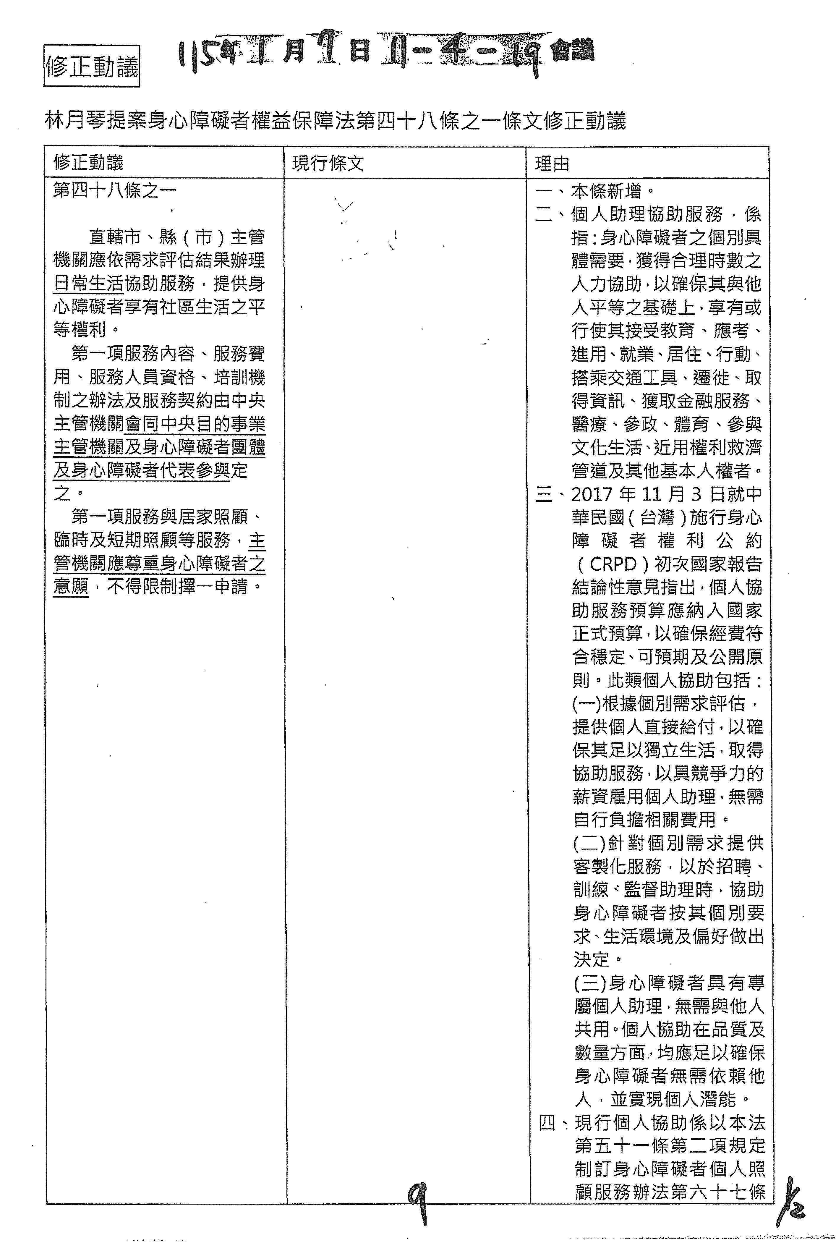 林委員月琴:好,也謝謝喔,參考我們當初的修正動議,將日常生活納入裡邊,避免身障者被限縮在家。我剛才也同意,因為我的附帶決議裡面也有提到,就是應該不只是要把個人助理入法,而且要避免不同縣市有不同支持服務助理小時的差異跟限制,這一直以來就是很嚴重的問題,所以到時候討論我的附帶決議的時候,我應該也是跟你們的想法一樣,就是希望用附帶決議來明定個人助理的相關規定,而且應由中央主管機關會同中央目的事業主管機關及身障者團體跟代表來共同定之,這樣子才可以真正的去符合他們的需求。而且對於需要密集支持的障礙者而言,當然有時候遠遠不夠,有些時候家庭會被迫要自聘移工來照顧,經濟條件比較好的,當然就是能夠請外傭,條件不佳的家庭,就是只能選擇全日型的住宿機構安置,所以這次能夠把個人助理的相關規定納入法裡,甚至用附帶決議去做,而未來長照怎麼去搭配進來,這也是下一波要來做處理的,否則現在各住60小時上,坦白講是不太夠的,因為他們有些比較重度需求依賴,如果限制60小時,換算1天才2小時,可能就是不夠的,未來在長照這部分,我也希望衛福部要去做考量。以上。