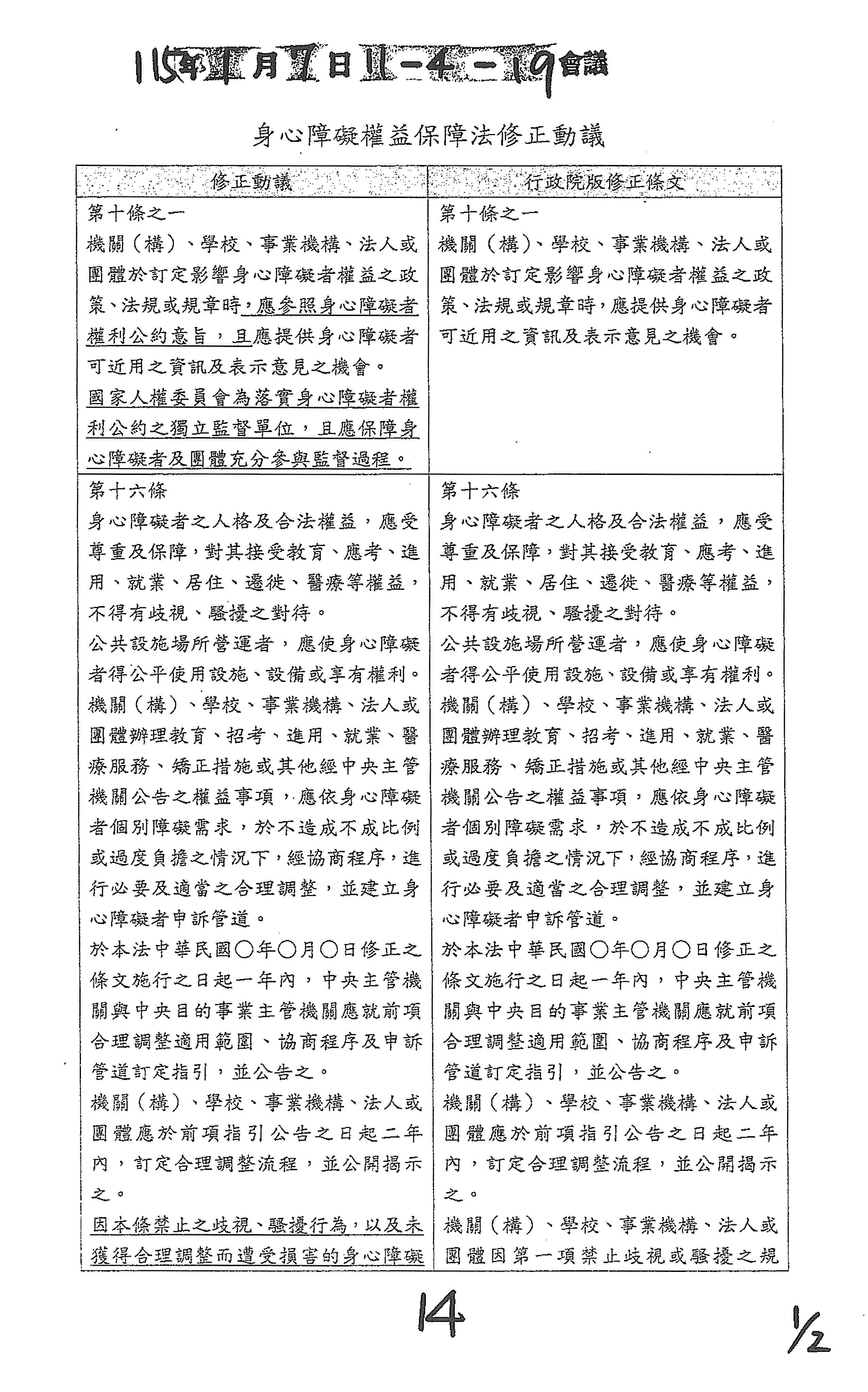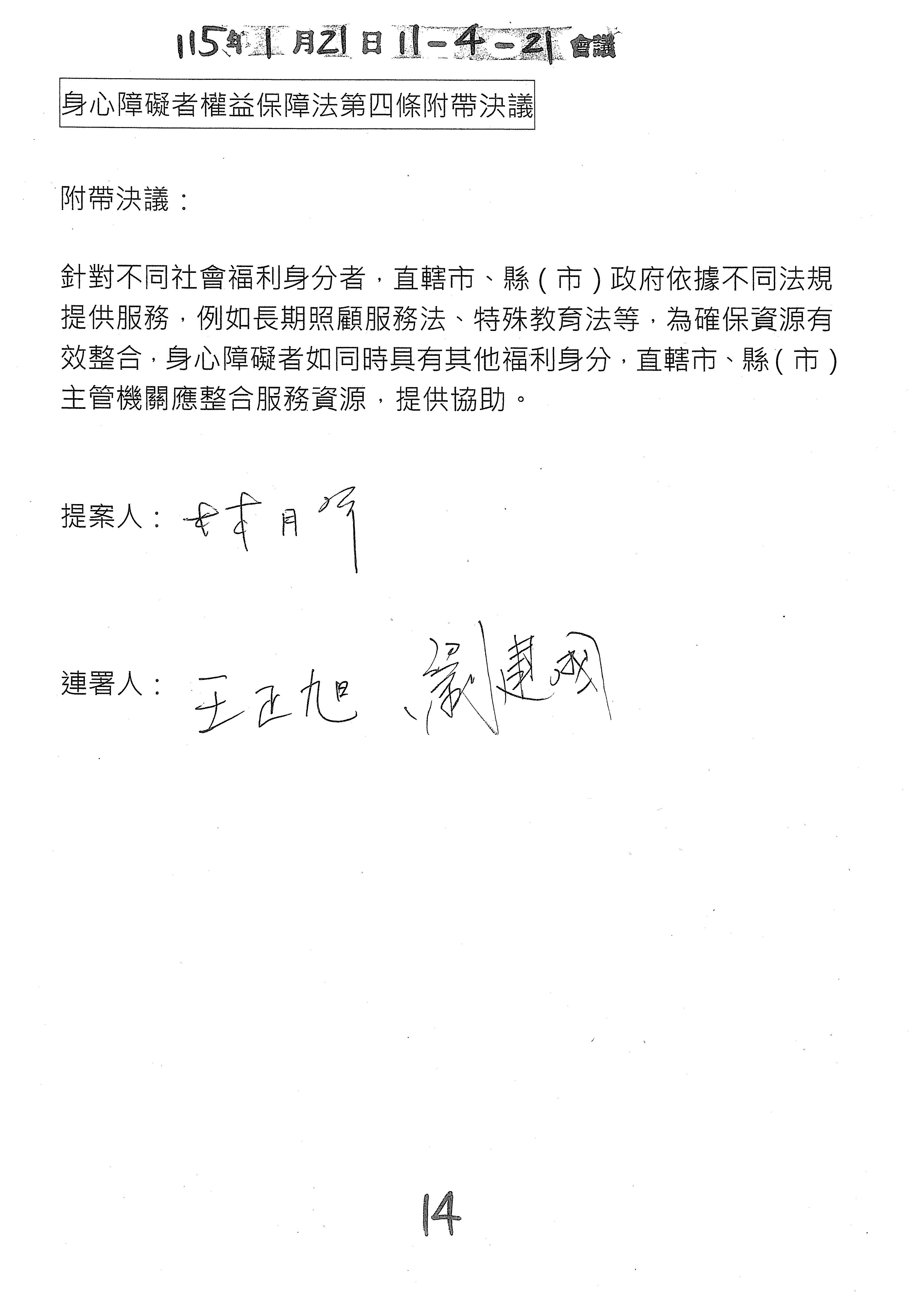 (十四)委員廖偉翔等21人擬具「身心障礙者權益保障法增訂第五十條之一條文草案」案。