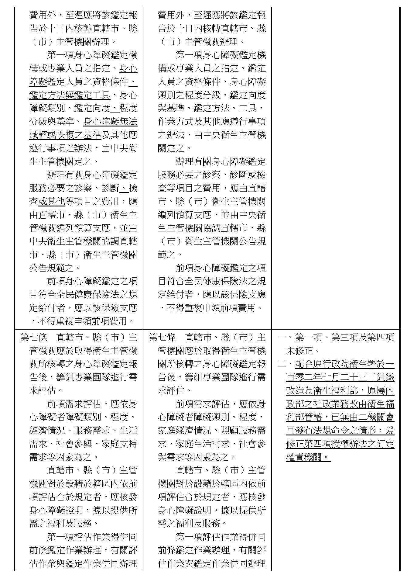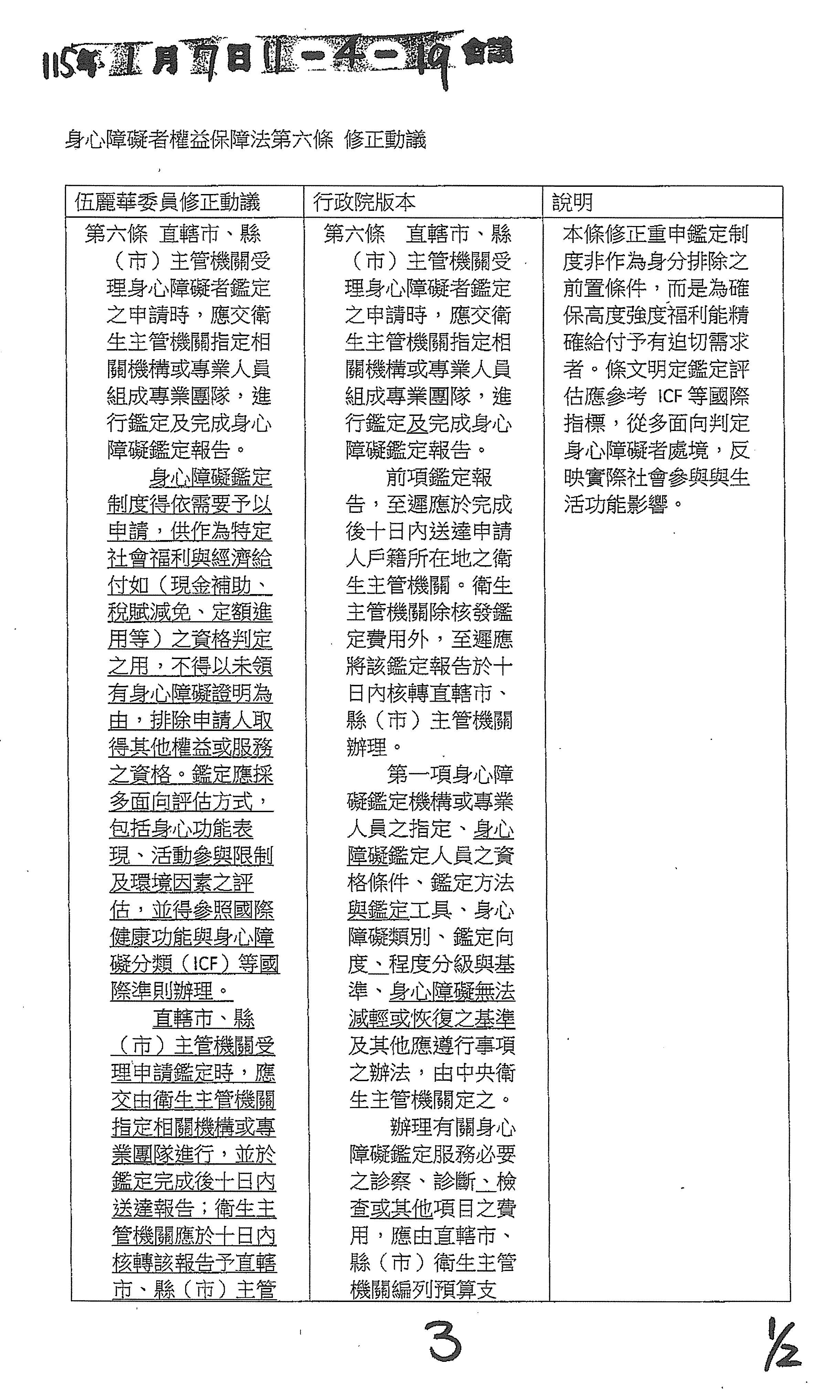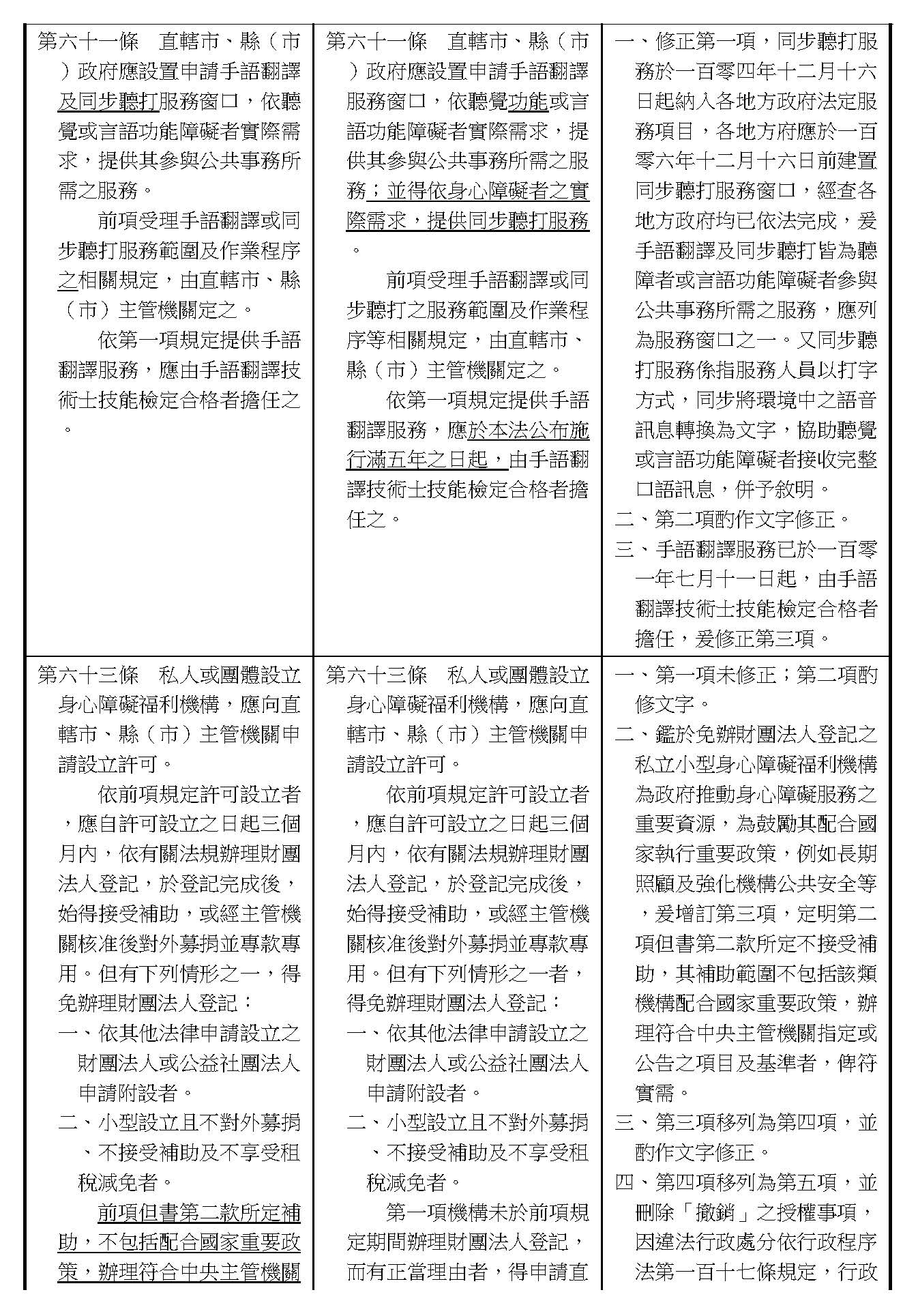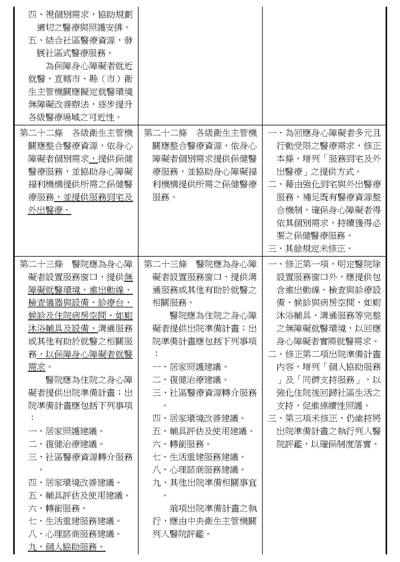 針對在各委員的版本之中,大概有幾個事項,我們也會建議後續在操作的時候來做更進一步的處理。例如身障跟長照服務中間怎麼樣去做一些整合,以及個人意願的尊重,甚至服務時數的核給在跨縣市之中能夠有更一致性的原則和標準。有關這一類的議題,因為它是比較操作面的事項,我們未來也會評估服務的整合跟長照的服務體系來做一些討論的介接,細節的部分我們也會來做相關的檢討,甚至書表的文件上面也能夠做更清楚的規範。