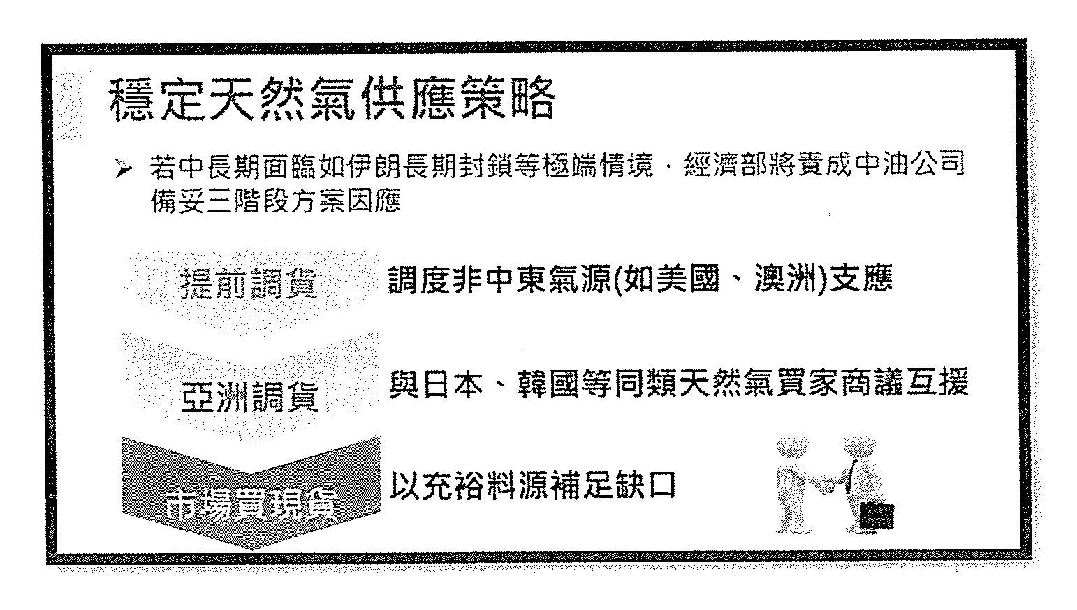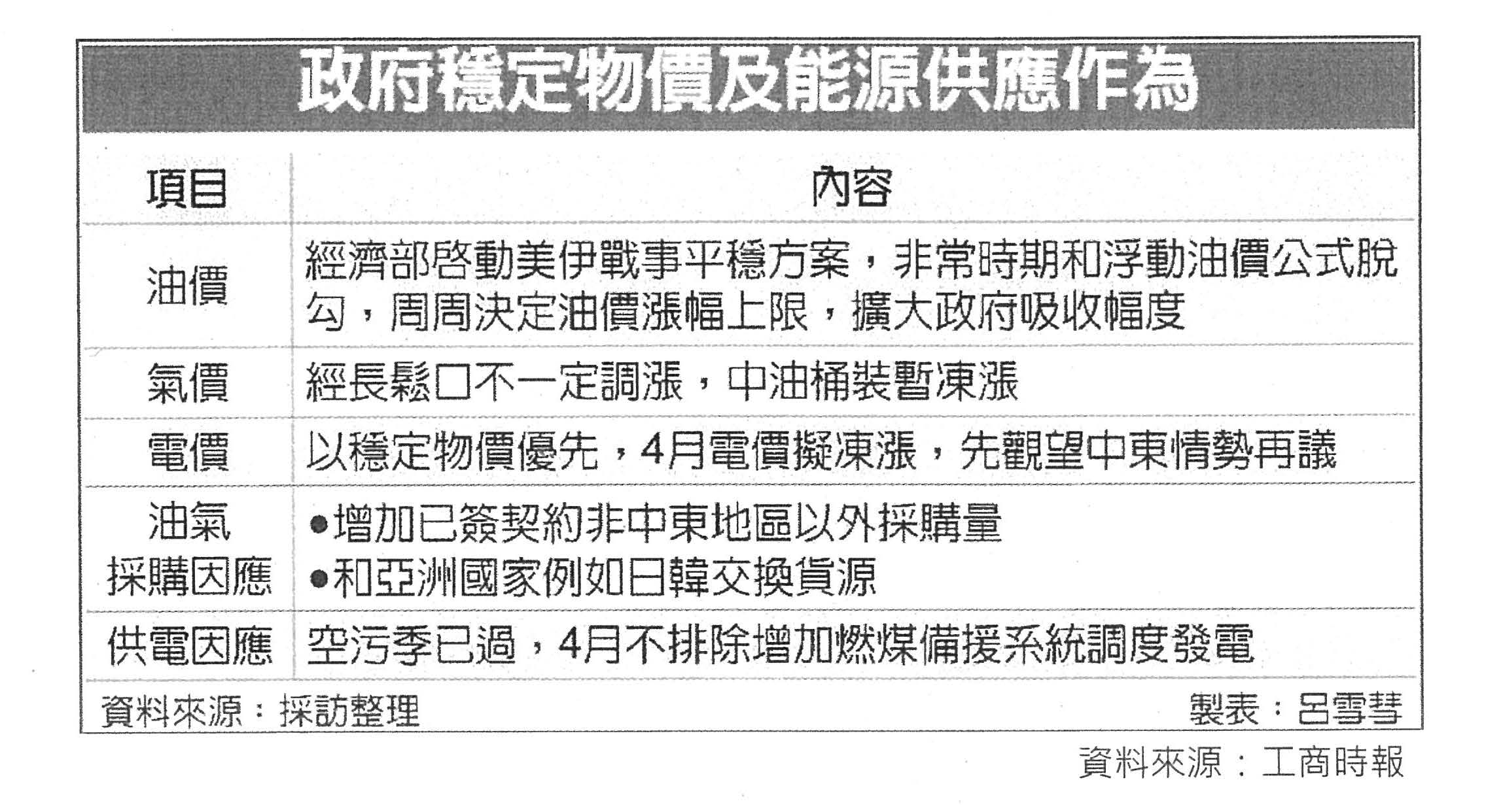 龔部長明鑫:現在油的部分已經是啟動緩漲機制,亞鄰最低價以後我們再吸收60%,所以本來要漲的,像是上禮拜本來要漲5塊多,我們只漲1塊5,如果扣掉亞鄰最低價3塊7,我們漲1塊5而已,所以大部分是我們來吸收啦,至於其他部分就是暫時穩定、平穩物價,來做思考……