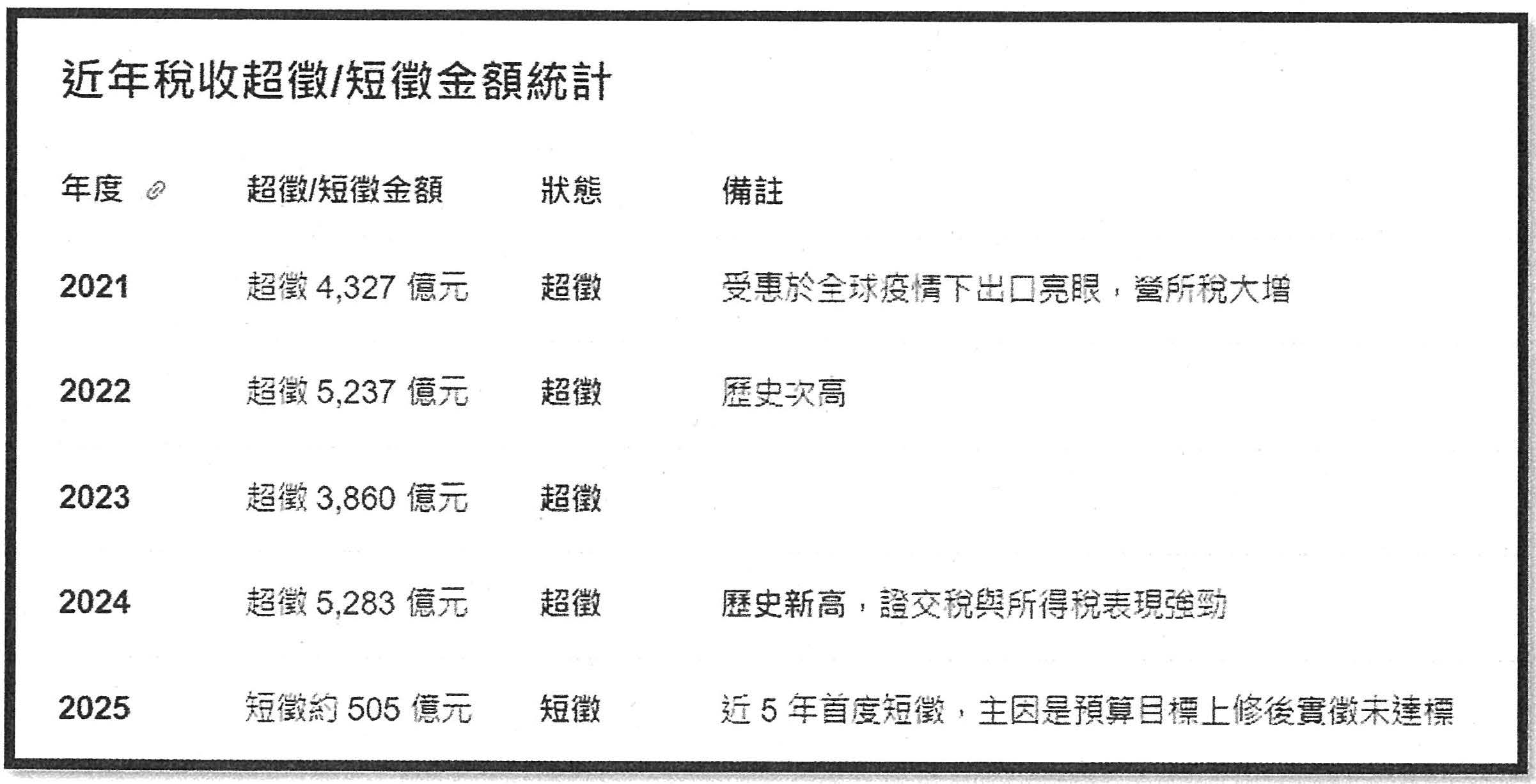 42025年賦稅收入為3兆7,515億元,較上年減少104億元,年減0.3%,整體低於預算數505億元。這也是自2010年、時隔5年來首度稅收實徵淨額低於預算數。